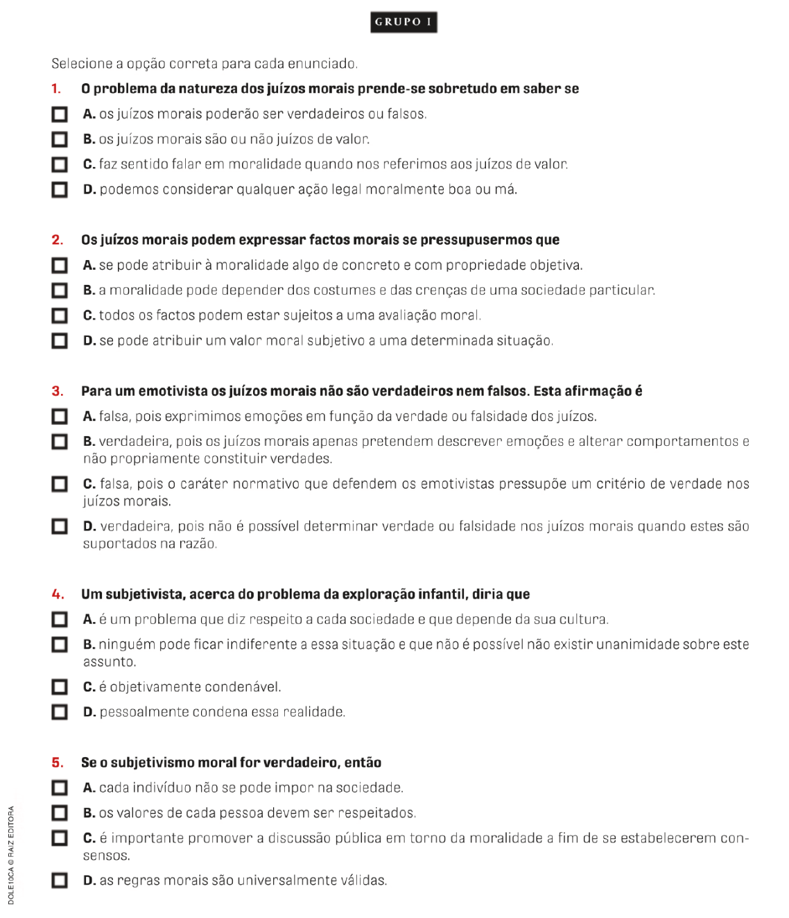 GRUPO I Selecione a opção correta para cada enunciado. 1. problema da natureza dos juízos morais prende-se sobretudo em saber se juízos morais poderão ser verdadeiros ou falsos. juízos morais são ou não juízos de valor. faz sentido falar em moralidade quando nos referimos aos juízos de valor. D. podemos considerar qualquer ação legal moralmente boa ou má. 2. Os juízos morais podem expressar factos morais se pressupusermos que se pode atribuir à moralidade algo de concreto e com propriedade objetiva. B. a moralidade pode depender dos costumes e das crenças de uma sociedade particular. todos factos podem estar sujeitos a uma avaliação moral. D. se pode atribuir um valor moral subjetivo a uma determinada situação. 3. Para um emotivista os juízos morais não são verdadeiros nem falsos. Esta afirmação é A. falsa, pois exprimimos emoções em função da verdade ou falsidade dos juízos. verdadeira, pois juízos morais apenas pretendem descrever emoções e alterar comportamentos e não propriamente constituir verdades. falsa, pois 0 caráter normativo que defendem emotivistas pressupõe um critério de verdade nos juízos morais. D. verdadeira, pois não é possível determinar verdade ou falsidade nos juízos morais quando estes são suportados na razão. 4. Um subjetivista, acerca do problema da exploração infantil, diria que A. é um problema que diz respeito a cada sociedade e que depende da sua cultura. B. ninguém pode ficar indiferente a essa situação e que não é possível não existir unanimidade sobre este assunto. é objetivamente condenável. D. pessoalmente condena essa realidade. 5. Se subjetivismo moral for verdadeiro, então cada indivíduo não se pode impor na sociedade. valores de cada pessoa devem ser respeitados. DOLE10CA © RAIZ EDITORA é importante promover a discussão pública em torno da moralidade a fim de se estabelecerem con- sensos. D. as regras morais são universalmente válidas.6. Segundo 0 relativismo moral, se uma pessoa for contra a utilização de armas de fogo para defesa pes- soal numa sociedade que aprova essa medida, então A. a ideia moral que essa pessoa tem acerca da utilização de armas de fogo é errada. B. 0 juízo pessoas não devem fazer uso de armas de fogo para defesa pessoal» é verdadeiro. C. ambas as posições devem ser respeitadas. D. essa sociedade é a favor do homicídio. 7. objetivismo opõe-se ao relativismo, pois A. 0 relativismo não respeita a multiculturalidade enquanto 0 objetivismo sim. a cultura, segundo 0 objetivismo, é fator determinante para definir 0 que está certo ou 0 que está er- rado. segundo 0 objetivismo, terão de existir princípios universais que determinem 0 que é moralmente certo e errado. D. 0 critério de verdade ou falsidade dos juízos morais não é determinável a partir das emoções. 8. Segundo objetivismo, existem factos morais porque A. cada sociedade determina objetivamente 0 que está certo e 0 que está errado. juízos morais não expressam emoções, mas descrevem a realidade. juízos morais são universalmente verdadeiros ou falsos. D. a moralidade é um tema consensual. GRUPO II 1. Considere os seguintes enunciados. ENUNCIADOS PERSPETIVA FILOSÓFICA A. Podemos hoje condenar 0 nazismo que vigorou no período da II Guerra Mundial, no entanto, nessa altura, para 0 povo alemão, era uma ideologia moralmente aceite e, por isso, verdadeira. B. Quando alguém diz que deverá existir igualdade de género, apenas pretende 0 desejo de esse princípio ser respeitado. C. Deve haver respeito pela ideologia de cada um, pois, na verdade, nada me garante que princípios que eu defendo sejam mais corretos do que OS de outra pessoa que defende princípios diferentes. D. Em que medida se devem tolerar certos comportamentos considerados reprováveis só porque se exige respeito pela cultura de sociedades diferentes? 0 bem e 0 mal ultrapassam a cultura, pois são universalmente verdadeiros. E. Podemos questionar em certos momentos se vale a pena viver. Já sentimos por diversas vezes que, por causa disto ou daquilo, não vale a pena continuar, no entanto isso deve-se a alguns acontecimentos que vivenciamos porque, na verdade, independentemente disso, todos nós queremos viver e ser felizes.F. Admitir que não existe uma verdade moral partilhada por todos não significa que juízos morais não possam ser verdadeiros. Cada pessoa tem a sua própria a sua crença, no entanto esta deve ir ao encontro daquilo que a sociedade defende, pois é nela que cada indivíduo vive. G. Os valores não são estáticos e a prova disso são as preocupações ecológicas que hoje constatamos em todo 0 mundo e a urgência moral de preservar 0 planeta. Quem se preocupava com isto há alguns anos? 0 facto é que hoje essa preocupação é visível em qualquer lado e está na consciência de todos nós. 1.1 Preencha quadro, indicando a que perspetivas filosóficas acerca da natureza dos juízos morais corresponde cada enunciado. 1.2 Justifique a resposta dada nas alíneas e G. 1.3 Contraponha, com base noutras perspetivas filosóficas sobre 0 mesmo problema, a tese presente nas alíneas e F.1. Leia 0 texto seguinte. Se tivermos em consideração 0 quanto as ideias morais mudaram, quer de lugar para lugar, quer ao longo do tempo, pode ser tentador pensar que não existem factos morais absolutos e que, pelo contrário, a moral é sem- pre relativa à sociedade na qual fomos educados. Segundo esta perspetiva, uma vez que a escravatura era To- ralmente aceite para a maioria dos Gregos antigos, apesar de não ser para a maioria dos Europeus de hoje em dia, a escravatura seria moralmente boa para os Gregos antigos, apesar de ser moralmente má para os Euro- peus contemporâneos. Nigel Warburton, Elementos Básicos de Filosofia, Gradiva, 2007, 104. 1.1 Indique a posição filosófica sobre 0 problema da natureza dos juízos morais que 0 texto apresenta. 1.2 Apresente argumentos que justifiquem a resposta dada 