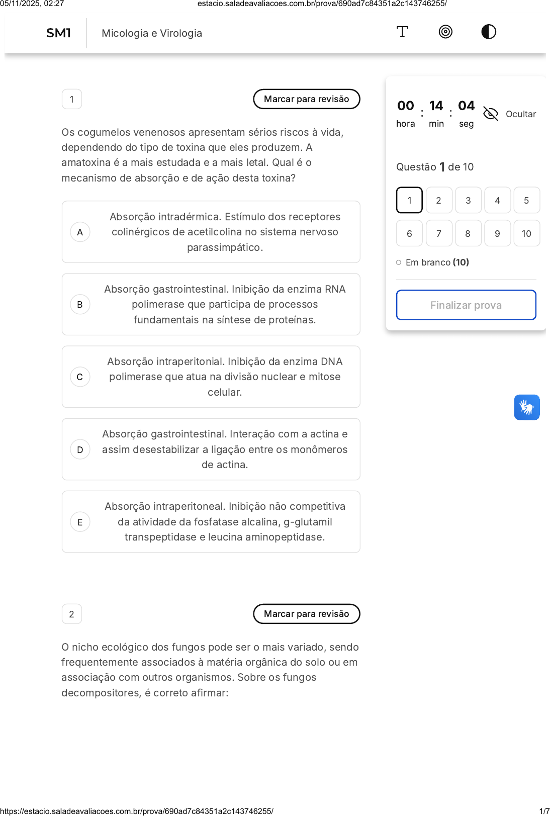 A B C D E 1 Marcar para revisão Os cogumelos venenosos apresentam sérios riscos à vida, dependendo do tipo de toxina que eles produzem. A amatoxina é a mais estudada e a mais letal. Qual é o mecanismo de absorção e de ação desta toxina? Absorção intradérmica. Estímulo dos receptores colinérgicos de acetilcolina no sistema nervoso parassimpático. Absorção gastrointestinal. Inibição da enzima RNA polimerase que participa de processos fundamentais na síntese de proteínas. Absorção intraperitonial. Inibição da enzima DNA polimerase que atua na divisão nuclear e mitose celular. Absorção gastrointestinal. Interação com a actina e assim desestabilizar a ligação entre os monômeros de actina. Absorção intraperitoneal. Inibição não competitiva da atividade da fosfatase alcalina, g-glutamil transpeptidase e leucina aminopeptidase. 2 Marcar para revisão O nicho ecológico dos fungos pode ser o mais variado, sendo frequentemente associados à matéria orgânica do solo ou em associação com outros organismos. Sobre os fungos decompositores, é correto afirmar: 00 hora : 14 min : 04 seg Ocultar Questão 1 de 10 Em branco (10) Finalizar prova 1 2 3 4 5 6 7 8 9 10 SM1 Micologia e Virologia 05/11/2025, 02:27 estacio.saladeavaliacoes.com.br/prova/690ad7c84351a2c143746255/ https://estacio.saladeavaliacoes.com.br/prova/690ad7c84351a2c143746255/ 1/7 A B C D E A B C A principal função dos fungos decompositores está relacionada ao fornecimento de carboidratos das plantas superiores. Eles podem aumentar a produção e melhorar a qualidade das árvores frutíferas liberando carboidratos no solo. Eles degradam unicamente a celulose das folhas que caem das árvores, reciclando a matéria orgânica. Independente do tipo de matéria orgânica presente no solo das florestas, todos os fungos podem decompor. Eles são responsáveis pela degradação da matéria orgânica, auxiliando na ciclagem dos elementos da natureza. 3 Marcar para revisão Os organismos agrupados como fungos são seres eucariontes e heterotróficos. Sobre os fungos, assinale a alternativa correta. Fungos saprófitos provocam doenças como as micoses em seres humanos e a ferrugem em cafeeiros. Alguns fungos são capazes de produzir toxinas que têm ação neurotóxica, nefrotóxica ou hepatotóxica, podem causar alergias, problemas gastrointestinais ou até mesmo levar o indivíduo à morte. Candidíase, tricomoníase, histoplasmose e micoses são algumas doenças causadas por fungos. 05/11/2025, 02:27 estacio.saladeavaliacoes.com.br/prova/690ad7c84351a2c143746255/ https://estacio.saladeavaliacoes.com.br/prova/690ad7c84351a2c143746255/ 2/7 D E A B C D E No grupo dos ascomicetos, estão os fungos venenosos, como os cogumelos do gênero Amanita. Os zigomicetos não desenvolvem corpos de frutificação, nem esporos sexuados, um exemplo é a Candida albicans. 4 Marcar para revisão Os antifúngicos podem ser divididos em várias classes químicas e atuam de diferentes formas interferindo no metabolismo de vias importantes para a sobrevivência dos fungos. Correlacione abaixo o antifúngico com o alvo de ação na célula fúngica: I- Anfotericina B II- Caspofungina III- Griseofulvina A- Parede celular B- Membrana celular C- Intracelular I-C; II-A; III-B I-B; II-A; III-C I-A; II-B; III-C I-B; II-C; III-A I-C; II-B; III-A 5 Marcar para revisão As micotoxinas podem ter efeitos crônicos e cumulativos induzem ao aparecimento de câncer, em especial hepático. Sobre a micotoxinas, marque a alternativa correta. 05/11/2025, 02:27 estacio.saladeavaliacoes.com.br/prova/690ad7c84351a2c143746255/ https://estacio.saladeavaliacoes.com.br/prova/690ad7c84351a2c143746255/ 3/7 A B C D E A B C D E A aflatoxina é uma das micotoxinas menos conhecidas. São altamente estáveis apresentando baixo poder patogênico. As aflatoxinas podem ser ingeridas com cereais e deteriorados e são metabolizadas no intestino, tornando-se um potente agente nutritivo. Fungos filamentosos da espécie Aspergillus flavus produzem a aflatoxina. As aflatoxinas são absorvidas no intestino grosso juntamente com a reabsorção de água pois possuem baixo peso molecular. Aspergillus flavus é um espécie de fungo policíclicos com distribuição mundial. 6 Marcar para revisão A criptococose é uma micose oportunista causada pela levedura Cryptococcus neoformans, a forma mais grave dessa micose é a meningoencefalite. Sobre essa levedura, assinale a alternativa incorreta: Esse fungo tem tropismo pelo sistema nervoso central. O Cryptococcus neoformans pode ser encontrado nas fezes dos pombos O gênero Cryptococcus está restrito ao continente americano. O Cryptococcus neoformans produz uma cápsula polissacarídica. A transmissão ocorre pela inalação das células fúngicas. 05/11/2025, 02:27 estacio.saladeavaliacoes.com.br/prova/690ad7c84351a2c143746255/ https://estacio.saladeavaliacoes.com.br/prova/690ad7c84351a2c143746255/ 4/7 A B C D E 7 Marcar para revisão _____________ é uma micose subcutânea granulomatosa com evolução lenta também causada a partir de um trauma cutâneo. Os agentes causadores dessa micose são fungos demáceos pertencente aos gêneros _____________ , _____________, _____________ e _____________. Selecione as palavras que preenchem corretamente as lacunas. Cromoblastomicose; Fonsecaea; Rhinocladiella; Cladophialophora; Phialophora. Micetoma; Pseudallescheria; Pirenochaeta; Madurella; Acremonium. Esporotricose; S. brasiliensis; S. schenckii; S. globosa; S. albicans. Cromoblastomicose; Sporothrix; Madurella; Fonsecaea; Alternaria. Micetoma; Fonsecaea; Pirenochaeta; Pseudallescheria; Rhinocladiella. 8 Marcar para revisão Um paciente masculino, 34 anos, professor universitário com histórico de asma controlada com o uso de corticoide. Paciente procurou o serviço de saúde se queixando de tosse compulsiva, febre de 37,5°C com calafrios e fadiga. O paciente relata recente visita à Chapada Diamantina com passeios aos rios, cavern