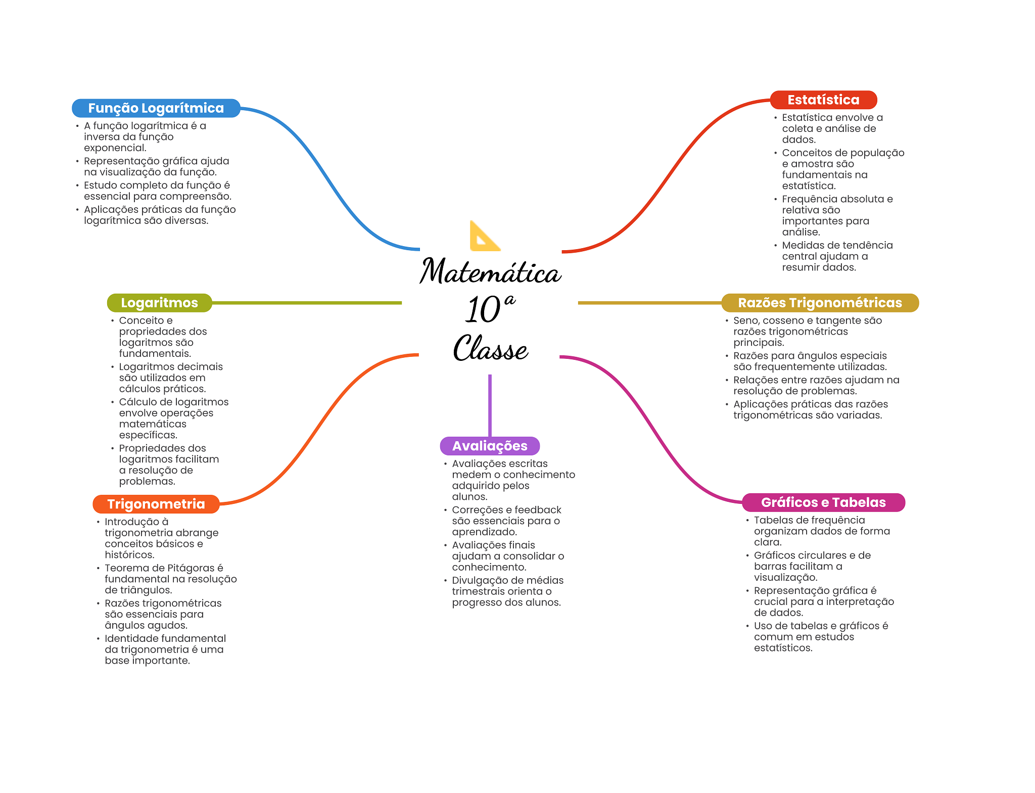 Estatística Função Logarítmica Estatística envolve a A função logarítmica é a coleta e análise de inversa da função dados. exponencial. Conceitos de população Representação gráfica ajuda e amostra são na visualização da função. fundamentais na Estudo completo da função é estatística. essencial para compreensão. Frequência absoluta e Aplicações práticas da função relativa são logarítmica são diversas. importantes para análise. Medidas de tendência central ajudam a Matemática resumir dados. Logaritmos Razões Trigonométricas Conceito e Seno, cosseno e tangente são propriedades dos razões trigonométricas logaritmos são fundamentais. Classe principais. Razões para ângulos especiais Logaritmos decimais são frequentemente utilizadas. são utilizados em Relações entre razões ajudam na cálculos práticos. resolução de problemas. Cálculo de logaritmos Aplicações práticas das razões envolve operações trigonométricas são variadas. matemáticas específicas. Propriedades dos Avaliações logaritmos facilitam Avaliações escritas a resolução de medem conhecimento problemas. adquirido pelos alunos. Trigonometria Gráficos e Tabelas Correções e feedback Introdução à são essenciais para Tabelas de frequência trigonometria abrange aprendizado. organizam dados de forma conceitos básicos e Avaliações finais clara. históricos. ajudam a consolidar Gráficos circulares e de Teorema de Pitágoras é conhecimento. barras facilitam a fundamental na resolução Divulgação de médias visualização. de triângulos. trimestrais orienta Representação gráfica é Razões trigonométricas progresso dos alunos. crucial para a interpretação são essenciais para de dados. ângulos agudos. Uso de tabelas e gráficos é Identidade fundamental comum em estudos da trigonometria é uma estatísticos. base importante.