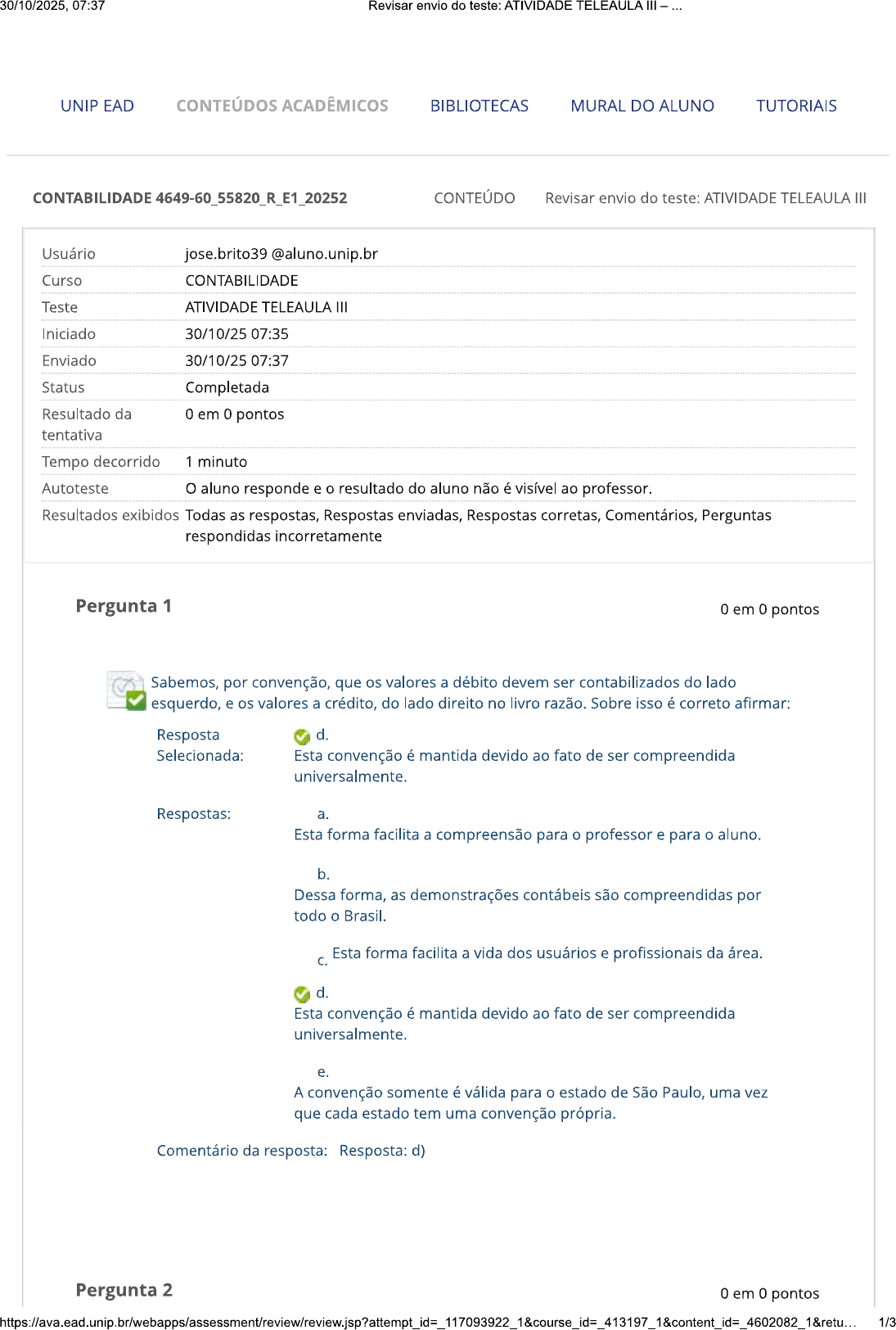 30/10/2025, 07:37 Revisar envio do teste: ATIVIDADE TELEAULA III UNIP EAD CONTEÚDOS ACADÊMICOS BIBLIOTECAS MURAL DO ALUNO TUTORIAIS CONTABILIDADE 4649-60_55820_R_E1_20252 CONTEÚDO Revisar envio do teste: ATIVIDADE TELEAULA III Usuário jose.brito39 @aluno.unip.br Curso CONTABILIDADE Teste ATIVIDADE TELEAULA III Iniciado 30/10/25 07:35 Enviado 30/10/25 07:37 Status Completada Resultado da 0 em 0 pontos tentativa Tempo decorrido 1 minuto Autoteste O aluno responde e o resultado do aluno não é visível ao professor. Resultados exibidos Todas as respostas, Respostas enviadas, Respostas corretas, Comentários, Perguntas respondidas incorretamente Pergunta 1 0 em 0 pontos Sabemos, por convenção, que os valores a débito devem ser contabilizados do lado esquerdo, e os valores a crédito, do lado direito no livro razão. Sobre isso é correto afirmar: Resposta d. Selecionada: Esta convenção é mantida devido ao fato de ser compreendida universalmente. Respostas: a. Esta forma facilita a compreensão para professor e para aluno. b. Dessa forma, as demonstrações contábeis são compreendidas por todo Brasil. C. Esta forma facilita a vida dos usuários e profissionais da área. d. Esta convenção é mantida devido ao fato de ser compreendida universalmente. e. A convenção somente é válida para estado de São Paulo, uma vez que cada estado tem uma convenção própria. Comentário da resposta: Resposta: d) Pergunta 2 0 em 0 pontos 1/330/10/2025, 07:37 Revisar envio do teste: ATIVIDADE TELEAULA III A equação fundamental do patrimônio pode ser enunciada como: Resposta Selecionada: Patrimônio líquido = ativo passivo a. Respostas: a. Patrimônio líquido = ativo passivo b. Patrimônio líquido = 2 X ativo - ativo² Patrimônio líquido = passivo d. Patrimônio líquido = capital nominal Patrimônio líquido = capital social e. Comentário da resposta: Resposta: a) Pergunta 3 0 em 0 pontos As receitas líquidas de vendas são compostas da seguinte forma: Resposta C. Selecionada: Receita bruta deduzindo as devoluções e abatimentos, descontos comerciais e impostos sobre vendas. Respostas: a. Receita operacional despesas operacionais. b. Receitas e despesas operacionais receitas e despesa não operacionais. C. Receita bruta deduzindo as devoluções e abatimentos, descontos comerciais e impostos sobre vendas. d. Receita bruta despesas totais. Receitas descontos comerciais. e. Comentário da resposta: Resposta: c) Pergunta 4 0 em 0 pontos São exemplos de contas do subgrupo ativo circulante: Resposta Selecionada: Caixa, bancos, aplicações financeiras e estoques. a. Respostas: Caixa, bancos, aplicações financeiras e estoques. a. b. Investimento, imobilizado e caixa. 2/330/10/2025, 07:37 Revisar envio do teste: ATIVIDADE TELEAULA III - Intangível, imobilizado e investimentos. d. Caixa, investimentos e bancos. Caixa e intangível. e. Comentário da resposta: Resposta: a) Quinta-feira, 30 de Outubro de 2025 07h37min19s GMT-03:00 OK 3/3