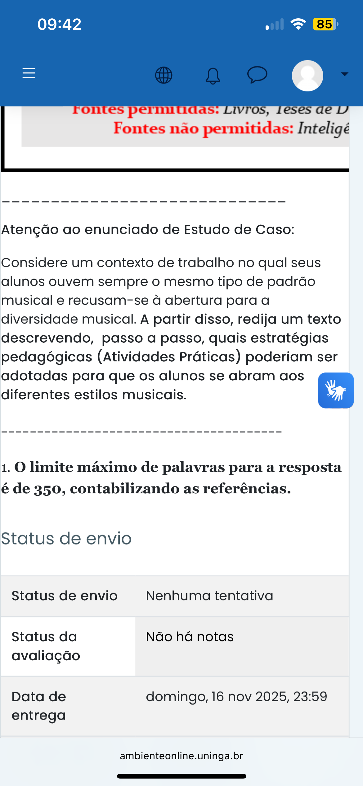 09:42 85 Fontes permitidas: Livros, leses D Fontes não permitidas: Inteligé Atenção ao enunciado de Estudo de Caso: Considere um contexto de trabalho no qual seus alunos ouvem sempre mesmo tipo de padrão musical e recusam-se à abertura para a diversidade musical. A partir disso, redija um texto descrevendo, passo a passo, quais estratégias pedagógicas (Atividades Práticas) poderiam ser adotadas para que os alunos se abram aos diferentes estilos musicais. 1. limite máximo de palavras para a resposta é de 350, contabilizando as referências. Status de envio Status de envio Nenhuma tentativa Status da Não há notas avaliação Data de domingo, 16 nov 2025, 23:59 entrega