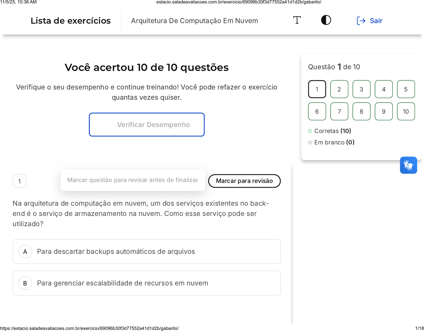 Você acertou 10 de 10 questões Verifique o seu desempenho e continue treinando! Você pode refazer o exercício quantas vezes quiser. Verificar Desempenho A B 1 Marcar para revisãoMarcar questão para revisar antes de finalizar Na arquitetura de computação em nuvem, um dos serviços existentes no back- end é o serviço de armazenamento na nuvem. Como esse serviço pode ser utilizado? Para descartar backups automáticos de arquivos Para gerenciar escalabilidade de recursos em nuvem Questão 1 de 10 Corretas (10) Em branco (0) 1 2 3 4 5 6 7 8 9 10 Lista de exercícios Arquitetura De Computação Em Nuvem Sair 11/5/25, 10:38 AM estacio.saladeavaliacoes.com.br/exercicio/69096b30f3d77552a41d1d2b/gabarito/ https://estacio.saladeavaliacoes.com.br/exercicio/69096b30f3d77552a41d1d2b/gabarito/ 1/18 C D E Para garantir a segurança de dados em nuvem Para compartilhar arquivos entre diferentes usuários e dispositivos Para automatizar tarefas de gerenciamento de redes Resposta correta Parabéns, você selecionou a alternativa correta. Confira o gabarito comentado! Gabarito Comentado O serviço de armazenamento na nuvem é uma ferramenta essencial na arquitetura de computação em nuvem. Ele permite que os usuários armazenem e acessem arquivos de maneira remota, independentemente de onde estejam fisicamente. Isso significa que os usuários podem acessar seus arquivos de qualquer lugar, desde que tenham uma conexão com a internet e as credenciais de acesso corretas. Além disso, este serviço também possibilita o compartilhamento de arquivos com outros usuários, independentemente de onde eles estejam. Isso facilita a colaboração eficiente em projetos e tarefas em equipe. Esta funcionalidade é especialmente útil para empresas ou equipes que trabalham em diferentes locais, pois permite que eles compartilhem arquivos de maneira segura e fácil. Portanto, a 11/5/25, 10:38 AM estacio.saladeavaliacoes.com.br/exercicio/69096b30f3d77552a41d1d2b/gabarito/ https://estacio.saladeavaliacoes.com.br/exercicio/69096b30f3d77552a41d1d2b/gabarito/ 2/18 A B C D E alternativa D, "Para compartilhar arquivos entre diferentes usuários e dispositivos", é a resposta correta. 2 Marcar para revisão Os serviços de computação em nuvem são oferecidos por diversos provedores de computação em nuvem, que podem oferecer a possibilidade de criação, administração e gerenciamento de servidores. Com base nesse conceito, assinale a alternativa que apresenta os 3 maiores provedores de soluções em nuvem que permitem a criação, administração e gerenciamento de servidores? Google Cloud Platform, AWS, Microsoft Azure. AWS, Oracle Cloud, IBM Cloud. AWS, Google Cloud Platform, Alibaba Cloud. Microsoft Azure, Oracle Cloud, IBM Cloud. AWS, Microsoft Azure, Alibaba Cloud. 11/5/25, 10:38 AM estacio.saladeavaliacoes.com.br/exercicio/69096b30f3d77552a41d1d2b/gabarito/ https://estacio.saladeavaliacoes.com.br/exercicio/69096b30f3d77552a41d1d2b/gabarito/ 3/18 Resposta correta Parabéns, você selecionou a alternativa correta. Confira o gabarito comentado! Gabarito Comentado Google Cloud Platform (GCP), Amazon Web Services (AWS) e Microsoft Azure são os principais provedores de soluções em nuvem que permitem a criação, administração e gerenciamento de servidores porque eles oferecem uma ampla variedade de serviços e recursos para ajudar as empresas a construir, implantar e gerenciar aplicativos e serviços em nuvem. GCP, AWS e Azure oferecem uma variedade de opções de infraestrutura, como máquinas virtuais, armazenamento, redes e banco de dados, permitindo que as empresas escalem seus recursos de acordo com suas necessidades. Além disso, eles também oferecem ferramentas de gerenciamento e automação, como gerenciamento de contêineres, monitoramento e gerenciamento de segurança, para ajudar as empresas a gerenciar e otimizar seus recursos em nuvem. Outra razão pela qual esses provedores são considerados os principais é a sua ampla adoção e suporte em todo o mundo, incluindo uma ampla gama de indústrias e setores. Eles também possuem um histórico de inovação e investimento constante em novos recursos e tecnologias, garantindo que suas plataformas estejam sempre atualizadas e ofereçam as melhores opções e funcionalidades. 3 Marcar para revisão 11/5/25, 10:38 AM estacio.saladeavaliacoes.com.br/exercicio/69096b30f3d77552a41d1d2b/gabarito/ https://estacio.saladeavaliacoes.com.br/exercicio/69096b30f3d77552a41d1d2b/gabarito/ 4/18 A B C D E Para que uma infraestrutura de computação em nuvem possa funcionar de forma adequada, algumas propriedades devem ser garantidas, dentre elas o balanceamento de carga. Assinale a alternativa que apresenta a principal vantagem do uso do balanceamento de carga na arquitetura de computação em nuvem. Redução de custos de infraestrutura, empregando um menor número de equipamentos. Aumento da segurança dos dados, através do emprego de ferramentas de integridade e autenticidade. Melhoria na escalabilidade dos recursos, permitindo que os usuários possam agregar novas funcionalidades aos serviços. Garantia de disponibilidade dos serviços, permitindo que os usuários possam acessar a qualquer hora do dia ou da noite. Distribuição equilibrada da carga de trabalho entre vários recursos, garantindo alta disponibilidade e escalabilidade. Resposta correta Parabéns, você selecionou a alternativa correta. Confira o gabarito comentado! 11/5/25, 10:38 AM estacio.saladeavaliacoes.com.br/exercicio/69096b30f3d77552a41d1d2b/gabarito/ https://estacio.saladeavaliacoes.com.br/exercicio/69096b30f3d77552a41d1d2b/gabarito/ 5/18 A B Gabarito Comentado O balanceamento de carga é uma técnica que distribui a carga de trabalho entre vários recursos, como servidores, de maneira a equilibrar a utilização desses recursos e assegurar alta disponibilidade e escalabilidade. Esta técnica é fundamental para a computação em nuvem, pois é necessário garantir que os serviços estejam 