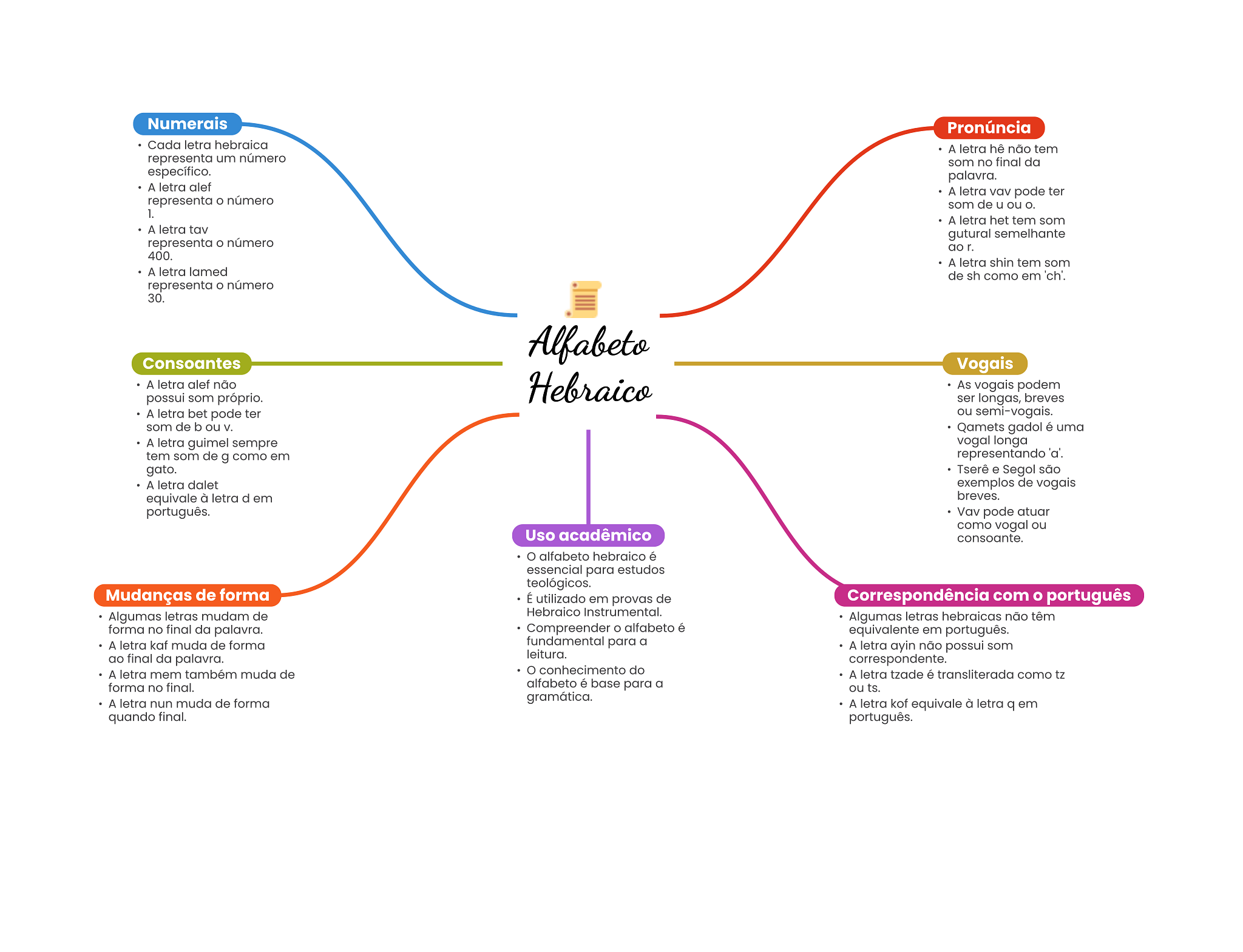 Numerais Pronúncia Cada letra hebraica A letra hê não tem representa um número som no final da específico. palavra. A letra alef A letra vav pode ter representa número som de u ou O. 1. A letra het tem som A letra tav gutural semelhante representa número ao r. 400. A letra shin tem som A letra lamed de sh como em 'ch'. representa número 30. Alfabeto Consoantes Vogais A letra alef não Hebraico As vogais podem possui som próprio. ser longas, breves A letra bet pode ter ou semi-vogais. som de b ou V. Qamets gadol é uma A letra guimel sempre vogal longa tem som de g como em representando 'a'. gato. Tserê e Segol são A letra dalet exemplos de vogais equivale à letra em breves. português. Vav pode atuar como vogal ou Uso acadêmico consoante. alfabeto hebraico é essencial para estudos teológicos. Mudanças de forma É utilizado em provas de Correspondência com português Algumas letras mudam de Hebraico Instrumental. Algumas letras hebraicas não têm forma no final da palavra. Compreender alfabeto é equivalente em português. A letra kaf muda de forma fundamental para a A letra ayin não possui som ao final da palavra. leitura. correspondente. A letra mem também muda de conhecimento do A letra tzade é transliterada como tz forma no final. alfabeto é base para a ou ts. A letra nun muda de forma gramática. A letra kof equivale à letra q em quando final. português.
