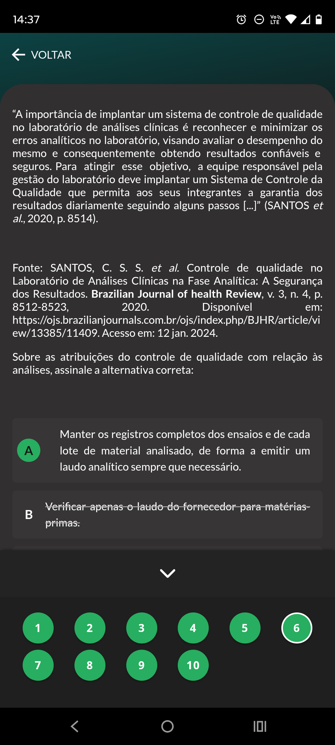 14:37 LTE VOLTAR "A importância de implantar um sistema de controle de qualidade no laboratório de análises clínicas é reconhecer e minimizar os erros analíticos no laboratório, visando avaliar desempenho do mesmo e consequentemente obtendo resultados confiáveis e seguros. Para atingir esse objetivo, a equipe responsável pela gestão do laboratório deve implantar um Sistema de Controle da Qualidade que permita aos seus integrantes a garantia dos resultados diariamente seguindo alguns passos [...]" (SANTOS et al., 2020, p. 8514). Fonte: SANTOS, S. S. et al. Controle de qualidade no Laboratório de Análises Clínicas na Fase Analítica: A Segurança dos Resultados. Brazilian Journal of health Review, V. 3, n. 4, p. 8512-8523, 2020. Disponível em: ew/13385/11409. Acesso em: 12 jan. 2024. Sobre as atribuições do controle de qualidade com relação às análises, assinale a alternativa correta: Manter os registros completos dos ensaios e de cada A lote de material analisado, de forma a emitir um laudo analítico sempre que necessário. Verificar apenas laudo do fornecedor para matérias- B primas. 1 2 3 4 5 6 7 8 9 10