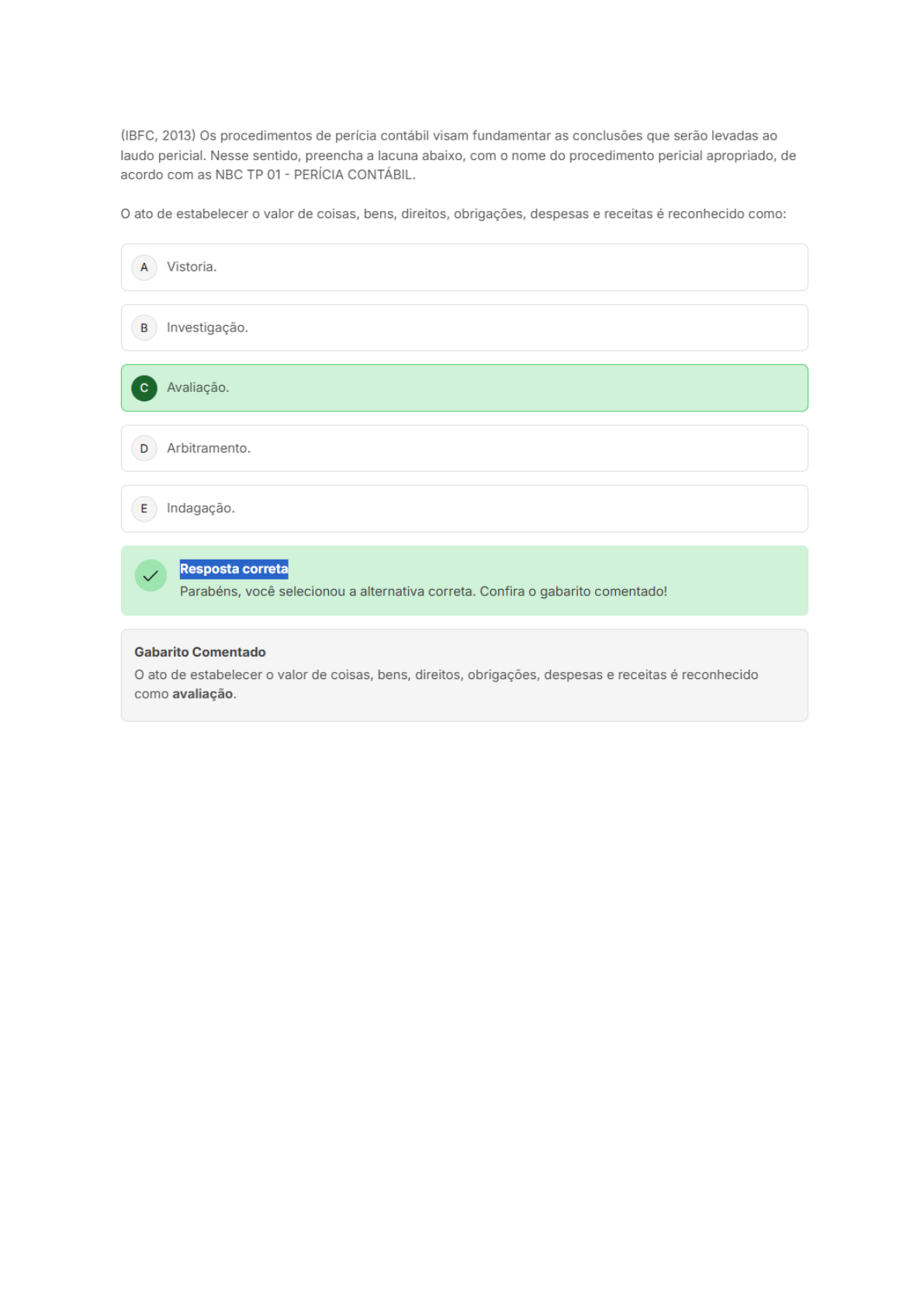 (IBFC, 2013) Os procedimentos de perícia contábil visam fundamentar as conclusões que serão levadas ao laudo pericial. Nesse sentido, preencha a lacuna abaixo, com nome do procedimento pericial apropriado, de acordo com as NBC TP 01 PERÍCIA CONTÁBIL. ato de estabelecer valor de coisas, bens, direitos, obrigações, despesas e receitas é reconhecido como: A Vistoria. Investigação. Avaliação. D Arbitramento. E Indagação. Resposta correta Parabéns, você selecionou a alternativa correta. Confira o gabarito comentado! Gabarito Comentado ato de estabelecer valor de coisas, bens, direitos, obrigações, despesas e receitas é reconhecido como avaliação.(Adaptada de CFC, 2012) Relacione os procedimentos de perícia contábil apresentados na primeira coluna com a definição constante da segunda coluna e, em seguida, assinale a opção correta. (1) Arbitramento (2) Mensuração (3) Avaliação (4) Certificação () É a determinação de valores ou a solução de controvérsia por critério () É ato de atestar informação trazida ao laudo pericial contábil pelo perito-contador, conferindo-lhe caráter de autenticidade pela fé pública atribuída a este profissional. () É ato de estabelecer valor de coisas, bens, direitos, obrigações, despesas e receitas. () É ato de qualificação e quantificação física de coisas, bens, direitos e obrigações. A sequência correta é: A 4,3,2,1. 1,4,3,2. C 3,1,4,2. D 2,3,1,4. E 1,2,3,4.3 Marcar para revisão (Adaptada de Estratégia Concursos) Na formação do capital social de determinada Sociedade Anônima, um dos sócios integralizou a sua parte com uma propriedade rural. Seguindo a determinação da lei 6.404/76, a Assembleia Geral dos subscritores solicitou perícia contábil para a avaliação do imóvel. Qual tipo de Perícia citada no enunciado? A Perícia Judicial. Perícia Estatal. Perícia Voluntária. D Perícia Arbitral. E Perícia Oficial. (ESAF, 2006 adaptada) A perícia contábil representa um trabalho parecer pericial contábil, na esfera judicial, serve para subsidiar: A juiz, árbitro e as partes nas suas tomadas de decisão. árbitro e as partes nas suas tomadas de decisão. juiz e as partes nas suas tomadas de decisão. D perito-contador e árbitro nas suas tomadas de decisão. E As partes nas suas tomadas de decisão.5 Marcar para revisão (FUNDATEC, 2014) Representa conjunto de procedimentos técnicos e científicos destinado a levar à instância decisória elementos de prova necessários a subsidiar à justa solução do litígio, mediante laudo ou parecer, em conformidade com as normas jurídicas e profissionais, e a legislação específica no que for pertinente. Este é um conceito que define adequadamente: A Perícia Contábil Judicial e Extrajudicial. Auditoria Contábil. C Auditoria Operacional. D Perícia Operacional Judicial. E Perícia Técnica Extrajudicial. 6 Marcar para revisão (Adaptada de Estratégia Concursos) Leia os trechos a seguir: A opinião do profissional é expressa mediante a entrega de um laudo pericial contábil. Tem como finalidade a emissão de um parecer sobre as demonstrações contábeis em seus aspectos relevantes. A amostragem é uma técnica normalmente aceita em seus procedimentos contábeis. Tende a ocorrer isoladamente e seus procedimentos possuem rigor metodológico, examinando-se a totalidade dos documentos disponíveis. As técnicas contábeis correspondentes às situações elencadas acima são, respectivamente: A Auditoria, perícia contábil, perícia contábil, auditoria. Perícia contábil, auditoria, auditoria, perícia contábil. C Perícia contábil, perícia contábil, auditoria, perícia contábil. D Auditoria, auditoria, auditoria, perícia contábil. E Auditoria, auditoria, perícia contábil, perícia contábil.7 Marcar para revisão (FUNDATEC, 2021) Em obediência às normas pertinentes à perícia contábil, uma vez concluídos os trabalhos periciais, perito nomeado deve apresentar e assistente técnico pode oferecer seu obedecendo aos respectivos prazos legais ou contratuais. Assinale a alternativa que preenche, correta e respectivamente, as lacunas do trecho acima. A Laudo Pericial Contábil Parecer Pericial Contábil. Laudo Pericial Contábil Relatório Pericial Contábil. C Parecer Pericial Contábil Laudo Pericial Contábil. D Parecer Pericial Contábil Relatório Pericial Contábil. E Relatório Pericial Contábil Laudo Pericial Contábil. (Adaptada de CFC, 2000 adaptada) Existem duas espécies de perícia contábil. Das espécies de Perícia Contábil, assinale a que é realizada por necessidade e escolha de entes físicos e jurídicos particulares privados: A Perícia Judicial. Perícia Extrajudicial. Perícia Semi-Judicial. D Perícia Particular. E Perícia Legal.9 Marcar para revisão (Adaptada de CFC, 2011) De acordo com a NBC TP 01 Perícia Contábil, os procedimentos de perícia contábil visam fundamentar as conclusões que serão levadas ao laudo pericial contábil ou parecer pericial contábil e abrangem, total ou parcialmente, segundo a natureza e a complexidade da matéria, exame, vistoria, indagação, investigação, arbitramento, mensuração, avaliação e certificação. Relacione procedimentos de perícia contábil na primeira coluna com a respectiva descrição na segunda coluna e, em seguida, assinale a opção CORRETA. (1) Exame (2) Vistoria (3) Arbitramento (4) Certificação () Ato de atestar a informação trazida ao laudo pericial contábil pelo perito-contador, conferindo-lhe caráter de autenticidade pela fé pública atribuída a este profissional. () Determinação de valores ou a solução de controvérsia por critério () Análise de livros, registros das transações e documentos. () Diligência que objetiva a verificação e a constatação de situação, coisa ou fato, de forma circunstancial. A sequência CORRETA é: A 4,3,2,1. 4,3,1,2. Questão 1 (Adaptada de Exame de Suficiência CFC) Na perícia contábil, tanto