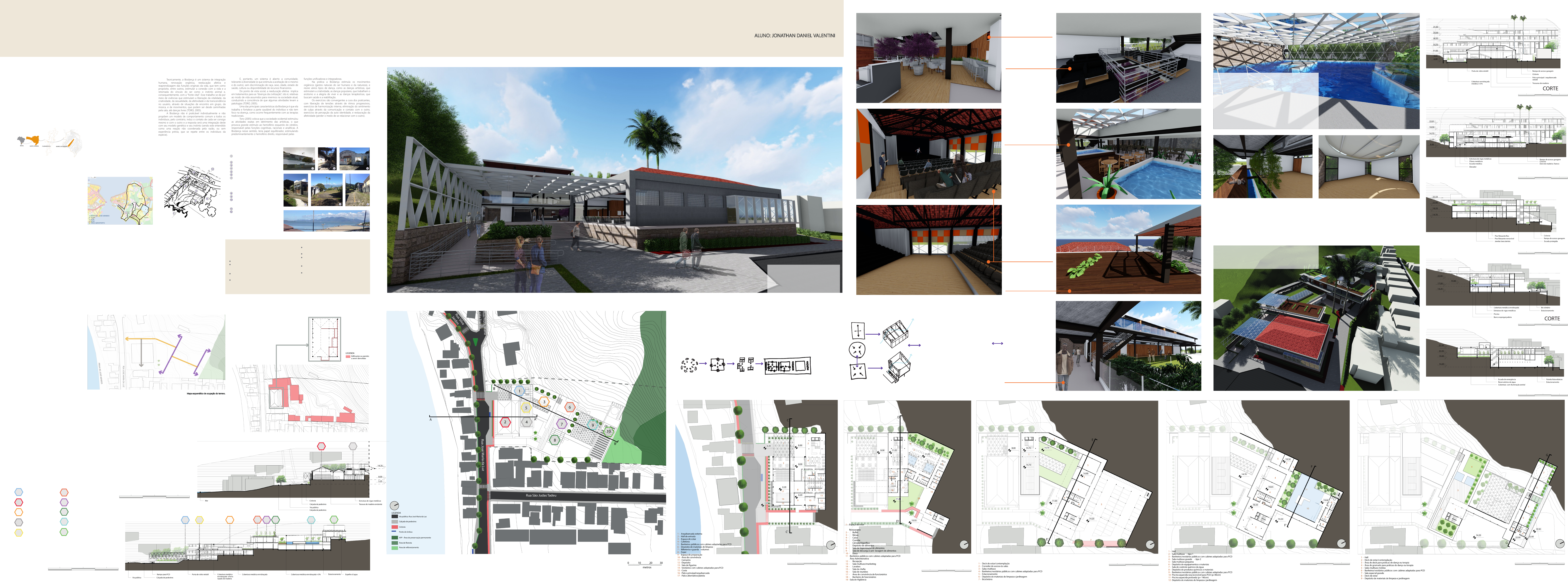 14 2 3 5 7 8 6 9 10 11 12 1 2 3 4 5 6 7 8 910 11 12 O seguinte trabalho de conclusão de curso é o projeto arquitetônico de um centro de atividades culturais e terapêuticas do SESC/SC (Serviço Social do Comércio de Santa Catarina) no bairro José Mendes (Florianópolis/SC). O terreno do projeto fica no centro do bairro e possui em sua testada uma edificação que abrigava uma unidade da fábrica da Coca-cola. Além dos usos culturais e terapêuticos, proponho a criação um espaço de lazer e permanência, o que é muito escasso no bairro. No desenvolvimento deste projeto trago como inspiração a Biodança, atividade criada pelo chileno Rolando Toro Araneda, que une terapia e cultura através da dança e da música. O bairro José Mendes se localiza na parte sul do Maciço do Morro da Cruz, fazendo limites com o Saco dos Limões ao leste, com o Centro a noroeste, e sendo banhado ao sul e oeste pela Baía Sul. Na porção norte encontra-se a Comunidade do Morro da Queimada. INTRODUÇÃO No desenvolvimento do projeto duas motivações principais levaram ao resultado final: primeiro a vontade de projetar um espaço para atividades terapêuticas, que partiu de um processo pessoal de cura emocional a partir do qual tive vontade de facilitar esse resultado a outras pessoas; segundo de trabalhar com o bairro José Mendes, que surgiu após algumas passagens pelo bairro com o ônibus Volta ao Morro, nas quais percebia um lugar “incomum”, aparentemente preservado da especulação imobiliária e com um enorme potencial paisagístico. Durante esse processo de cura, a Biodança foi uma importante atividade/vivência e por isso decidi usá-la de inspiração para algumas decisões do projeto. A partir dessas motivações, procurei verificar no bairro locais que fossem adequados ao uso terapêutico e que reforçassem o potencial do bairro, como a presença de massas de vegetação e de vistas paisagísticas através da topografia. No centro do bairro encontrei o terreno mencionado na introdução, no qual consegui identificar as qualidades que procurava: vistas exuberantes da paisagem natural e urbana, a MOTIVAÇÕES E JUSTIFICATIVAS O bairro por muito tempo foi a única ligação do centro/norte com o sul da ilha de Florianópolis. Com a construção do túnel Antonieta de Barros a via principal deixou de ser a ligação principal e com isso perdeu muito do movimento. Apesar disso, esta via é amplamente abastecida por transporte público (figura 1) que vai do Centro em direção à UFSC e ao Sul da Ilha e faz parte do Plano de Mobilidade Urbana de Florianópolis como rota cicloviária. Por esta diversidade de pessoas que passam pelo local de transporte coletivo, como moradores do sul da ilha, passageiros do aeroporto ou estudantes da UFSC, há uma visibilidade sutil do bairro, que chama atenção pela paisagem e pela arquitetura “bagunçada” preservada da especulação imobiliária. Entretanto, mesmo com esses fatores o bairro possui pouquíssimos serviços públicos, comércios e locais de permanência. Desta forma, um equipamento público de lazer, cultura e terapia para moradores e visitantes do bairro seria um investimento na saúde da população, trazendo vitalidade ao bairro, e permitindo a convivência entre os moradores. Ao mesmo tempo ajudaria a diminuir a distância entre as pessoas e estas atividades, principalmente no que se refere às terapias, que muitas vezes só são procuradas quando a necessidade é evidente. Quanto ao possível impacto viário que será gerado, o transporte coletivo e o uso de bicicletas são priorizados e por fim acredita-se que dado o tamanho do equipamento (médio porte) o impacto será muito menor do que o ganho para a comunidade. IMPORTÂNCIA DA PROPOSTA PARA O BAIRRO SÍNTESE DA ÁREA: TERRENO E ENTORNO IMEDIATO 3 4 Para a concepção do projeto algumas diretrizes foram consideradas, tendo em vista o entendimento do terreno, do bairro, das inspirações de projeto e do SESC: Explorar o potencial paisagístico do terreno; Preservar a vegetação existente no local, exceto quando, não se tratando de APP, o ganho com o projeto compensar a remoção; Considerar os patamares existentes e a topografia natural do terreno, para evitar grandes modificações cortes ou aterros; Preservar e valorizar a edificação do galpão, visto que esta é um ponto de referência e identidade para os moradores do bairro; DIRETRIZES GERAIS DE PROJETO presença, no final do terreno de uma APP (área de preservação permanente) e de outros elementos vegetais como duas grandes palmeiras imperiais próximas a entrada. A partir da escolha do terreno, com os estudos iniciais constatei que o mesmo pertence ao SESC/SC (Serviço Social do Comércio de Santa Catarina), o que, somado às motivações, me levou a decisão final de projetar um centro de atividades para esta instituição. Teoricamente, a Biodança é um sistema de integração humana, renovação orgânica, reeducação afetiva e reaprendizagem das funções originais da vida, que tem como propósito, entre outros, estimular a conexão com a vida e a retomada do vínculo do ser como o instinto animal e, consequentemente, com a “fonte vital”. Esse trabalho se dá por meio de vivências que estimulam a liberação da vitalidade, da criatividade, da sexualidade, da afetividade e da transcendência no usuário, através de situações de encontro em grupo, da música, e de movimentos, que podem ser desde caminhadas pela sala, até danças livres (TORO, 2005). A Biodança não é praticável individualmente e não propõem um modelo de comportamento comum a todos os indivíduos, pelo contrário, induz o contato de cada ser consigo mesmo e com o outro e a resposta será uma integração deste com seu modelo genético e seu instinto (sendo este entendido como uma reação não coordenada pela razão, ou sem experiência prévia, que se repete entre os indivíduos da espécie). UMA BREVE EXPLICAÇÃO SOBRE A BIODAN
