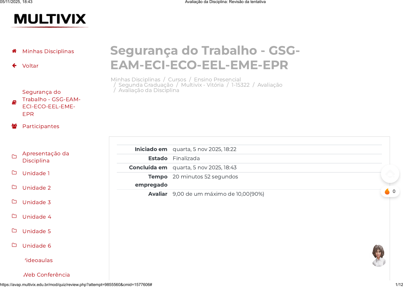 Minhas Disciplinas / Cursos / Ensino Presencial / Segunda Graduação / Multivix - Vitória / 1-15322 / Avaliação / Avaliação da Disciplina Segurança do Trabalho - GSG- EAM-ECI-ECO-EEL-EME-EPR Iniciado em quarta, 5 nov 2025, 18:22 Estado Finalizada Concluída em quarta, 5 nov 2025, 18:43 Tempo empregado 20 minutos 52 segundos Avaliar 9,00 de um máximo de 10,00(90%) Minhas Disciplinas Voltar Segurança do Trabalho - GSG-EAM- ECI-ECO-EEL-EME- EPR Participantes Apresentação da Disciplina Unidade 1 Unidade 2 Unidade 3 Unidade 4 Unidade 5 Unidade 6 Videoaulas Web Conferência 0 05/11/2025, 18:43 Avaliação da Disciplina: Revisão da tentativa https://avap.multivix.edu.br/mod/quiz/review.php?attempt=9855560&cmid=1577606# 1/12 https://avap.multivix.edu.br/my/ https://avap.multivix.edu.br/course/index.php https://avap.multivix.edu.br/course/index.php?categoryid=66 https://avap.multivix.edu.br/course/index.php?categoryid=313 https://avap.multivix.edu.br/course/index.php?categoryid=317 https://avap.multivix.edu.br/course/view.php?id=24735 https://avap.multivix.edu.br/course/view.php?id=24735§ion=12 https://avap.multivix.edu.br/mod/quiz/view.php?id=1577606 https://avap.multivix.edu.br/my/ https://avap.multivix.edu.br/course/view.php?id=24735 https://avap.multivix.edu.br/user/index.php?id=24735 https://avap.multivix.edu.br/course/view.php?id=24735§ion=1 https://avap.multivix.edu.br/course/view.php?id=24735§ion=2 https://avap.multivix.edu.br/course/view.php?id=24735§ion=3 https://avap.multivix.edu.br/course/view.php?id=24735§ion=4 https://avap.multivix.edu.br/course/view.php?id=24735§ion=5 https://avap.multivix.edu.br/course/view.php?id=24735§ion=6 https://avap.multivix.edu.br/course/view.php?id=24735§ion=7 https://avap.multivix.edu.br/course/view.php?id=24735§ion=9 https://avap.multivix.edu.br/course/view.php?id=24735§ion=10 https://avap.multivix.edu.br/ https://avap.multivix.edu.br/ https://avap.multivix.edu.br/ https://avap.multivix.edu.br/ https://avap.multivix.edu.br/ https://avap.multivix.edu.br/ https://avap.multivix.edu.br/ https://avap.multivix.edu.br/ https://avap.multivix.edu.br/ https://avap.multivix.edu.br/ https://avap.multivix.edu.br/ https://avap.multivix.edu.br/ https://avap.multivix.edu.br/ Questão 1 Incorreto Atingiu 0,00 de 1,00 Existem vários fatores e dimensões que podem ser utilizados como métricas na qualidade de vida no trabalho, algumas delas são contrárias, dentre elas temos: Marque a alternativa CORRETA Escolha uma opção: a. O bem-estar e a satisfação dos trabalhadores no ambiente de trabalho e qualidade dos diversos produtos que a organização fabrica. b. Preservação do meio ambiente e a substituição do trabalhador pela automação nos postos de trabalho c. Satisfação dos trabalhadores e melhoria no bem-estar no ambiente de trabalho d. Aumento de salário, carga horária trabalhada e produtividade. e. Aumento da competitividade local, estagnação salarial e produtividade. Minhas Disciplinas Voltar Segurança do Trabalho - GSG-EAM- ECI-ECO-EEL-EME- EPR Participantes Apresentação da Disciplina Unidade 1 Unidade 2 Unidade 3 Unidade 4 Unidade 5 Unidade 6 Videoaulas Web Conferência 05/11/2025, 18:43 Avaliação da Disciplina: Revisão da tentativa https://avap.multivix.edu.br/mod/quiz/review.php?attempt=9855560&cmid=1577606# 2/12 https://avap.multivix.edu.br/my/ https://avap.multivix.edu.br/course/view.php?id=24735 https://avap.multivix.edu.br/user/index.php?id=24735 https://avap.multivix.edu.br/course/view.php?id=24735§ion=1 https://avap.multivix.edu.br/course/view.php?id=24735§ion=2 https://avap.multivix.edu.br/course/view.php?id=24735§ion=3 https://avap.multivix.edu.br/course/view.php?id=24735§ion=4 https://avap.multivix.edu.br/course/view.php?id=24735§ion=5 https://avap.multivix.edu.br/course/view.php?id=24735§ion=6 https://avap.multivix.edu.br/course/view.php?id=24735§ion=7 https://avap.multivix.edu.br/course/view.php?id=24735§ion=9 https://avap.multivix.edu.br/course/view.php?id=24735§ion=10 https://avap.multivix.edu.br/ https://avap.multivix.edu.br/ https://avap.multivix.edu.br/ https://avap.multivix.edu.br/ https://avap.multivix.edu.br/ https://avap.multivix.edu.br/ https://avap.multivix.edu.br/ https://avap.multivix.edu.br/ https://avap.multivix.edu.br/ https://avap.multivix.edu.br/ https://avap.multivix.edu.br/ https://avap.multivix.edu.br/ https://avap.multivix.edu.br/ Questão 2 Correto Atingiu 1,00 de 1,00 São partes principais da QVT: I – Ambientes seguras proporciona segurança aos trabalhadores e evita riscos à saúde. II – Conceder férias e descanso e evitar ultrapassar o número de horas regulares de trabalho. III – Proporcionar diferença salarial pelo desempenho e biótipo. Estão CORRETAS as alternativas Escolha uma opção: a. I, II e III. b. II c. II e III. d. I e II. e. I e III. Minhas Disciplinas Voltar Segurança do Trabalho - GSG-EAM- ECI-ECO-EEL-EME- EPR Participantes Apresentação da Disciplina Unidade 1 Unidade 2 Unidade 3 Unidade 4 Unidade 5 Unidade 6 Videoaulas Web Conferência 05/11/2025, 18:43 Avaliação da Disciplina: Revisão da tentativa https://avap.multivix.edu.br/mod/quiz/review.php?attempt=9855560&cmid=1577606# 3/12 https://avap.multivix.edu.br/my/ https://avap.multivix.edu.br/course/view.php?id=24735 https://avap.multivix.edu.br/user/index.php?id=24735 https://avap.multivix.edu.br/course/view.php?id=24735§ion=1 https://avap.multivix.edu.br/course/view.php?id=24735§ion=2 https://avap.multivix.edu.br/course/view.php?id=24735§ion=3 https://avap.multivix.edu.br/course/view.php?id=24735§ion=4 https://avap.multivix.edu.br/course/view.php?id=24735§ion=5 https://avap.multivix.edu.br/course/view.php?id=24735§ion=6 https://avap.multivix.edu.br/course/view.php?id=24735§ion=7 https://avap.multivix.edu.br/course/view.php?id=24735§ion=9 https://avap.multivix.edu.br/course/view.php?id=24735§ion=10 https://avap.multivix.edu.br/ https://avap.multivix.edu.br/ https://avap.multivix.edu.