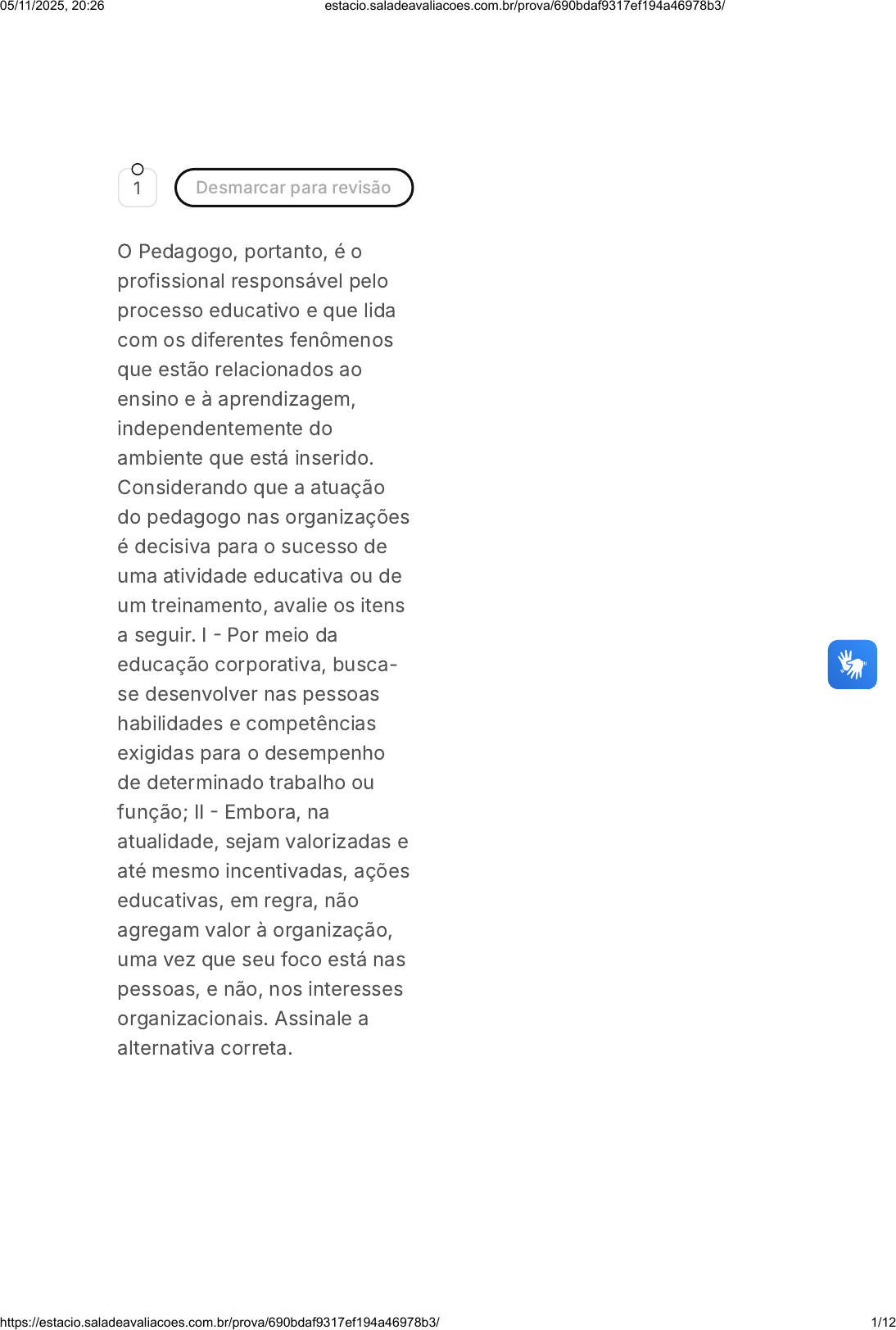 1 Desmarcar para revisão O Pedagogo, portanto, é o profissional responsável pelo processo educativo e que lida com os diferentes fenômenos que estão relacionados ao ensino e à aprendizagem, independentemente do ambiente que está inserido. Considerando que a atuação do pedagogo nas organizações é decisiva para o sucesso de uma atividade educativa ou de um treinamento, avalie os itens a seguir. I - Por meio da educação corporativa, busca- se desenvolver nas pessoas habilidades e competências exigidas para o desempenho de determinado trabalho ou função; II - Embora, na atualidade, sejam valorizadas e até mesmo incentivadas, ações educativas, em regra, não agregam valor à organização, uma vez que seu foco está nas pessoas, e não, nos interesses organizacionais. Assinale a alternativa correta. 05/11/2025, 20:26 estacio.saladeavaliacoes.com.br/prova/690bdaf9317ef194a46978b3/ https://estacio.saladeavaliacoes.com.br/prova/690bdaf9317ef194a46978b3/ 1/12 A B C D E Ambos estão corretos. Apenas I encontra-se correto. Apenas II encontra-se correto. Ambos estão incorretos. As afirmativas não dialogam, apesar de corretas. 2 Desmarcar para revisão O atendimento pedagógico domiciliar deve ser desenvolvido por um profissional habilitado, uma vez que ele possui formação para entender a condição da criança e suas necessidades. Dentre as opções a seguir, qual é esse profissional? 05/11/2025, 20:26 estacio.saladeavaliacoes.com.br/prova/690bdaf9317ef194a46978b3/ https://estacio.saladeavaliacoes.com.br/prova/690bdaf9317ef194a46978b3/ 2/12 A B C D E O médico que acompanha diariamente a criança e que conhece todo o diagnóstico. A enfermeira responsável pela oferta da medicação prescrita para a criança. O professor capacitado, designado pela autoridade competente. O terapeuta ocupacional, pois a criança vai precisar de reabilitação funcional. O psicólogo que busca entender o sofrimento psíquico da criança, após sua saída do hospital. 3 Desmarcar para revisão O pedagogo é um profissional de viva experiência para formar o sujeito. Considerada como a ciência da educação, a 05/11/2025, 20:26 estacio.saladeavaliacoes.com.br/prova/690bdaf9317ef194a46978b3/ https://estacio.saladeavaliacoes.com.br/prova/690bdaf9317ef194a46978b3/ 3/12 A B C D E pedagogia faz parte de todos os cursos de formação de professores. Assinale a alternativa que apresenta uma habilidade que precisa ser desenvolvida para atuar em ambientes de projetos. Ministrar com perfeição a disciplina que o foi imbuído passando todo o conteúdo. Reger a turma mantendo a autoridade e o controle dos alunos. Desenvolver os alunos para que sejam capazes de realizar tarefas previamente definidas. Promover aprendizagens que contribuam para solucionar problemas do cotidiano. Aprofundar os conhecimentos escolares formais e o exercício de decorar suas funções. 05/11/2025, 20:26 estacio.saladeavaliacoes.com.br/prova/690bdaf9317ef194a46978b3/ https://estacio.saladeavaliacoes.com.br/prova/690bdaf9317ef194a46978b3/ 4/12 A B C 4 Desmarcar para revisão Uma criança é hospitalizada para tratamento de câncer e passará por um longo período no hospital. Ela estava cursando o 6º ano do ensino fundamental II e precisou interromper os estudos presenciais na metade do primeiro semestre. Qual ação pode ser desenvolvida pelo pedagogo hospitalar, nessa situação? Nenhuma, pois a criança não poderá dar continuidade à escolarização formal, uma vez que não poderá frequentar a escola. Poderá prestar, apenas, apoio emocional e humanístico à criança pois ela não poderá continuar os estudos, uma vez que não frequentará a escola. Poderá oferecer classe hospitalar para que a criança dê continuidade à escolarização. 00 hora : 40 min : 53 seg Ocultar Questão 10 de 10 Respondidas (10) Em branco (0) Finalizar prova 1 2 3 4 5 6 7 8 9 10 Prova AVS Prática De Ensino Em… 05/11/2025, 20:26 estacio.saladeavaliacoes.com.br/prova/690bdaf9317ef194a46978b3/ https://estacio.saladeavaliacoes.com.br/prova/690bdaf9317ef194a46978b3/ 5/12 D E A B C Poderá oferecer atividades recreativas para a criança, pois não será possível dar prosseguimento à escolarização. Poderá oferecer apoio humanístico à criança e algumas atividades recreativas. 5 Desmarcar para revisão Desenvolve a capacidade contínua para se adaptar e mudar quando necessário por meio do conhecimento. É flexível, adaptável e com capacidade de se ajustar a novas tendências, sempre buscando e atualizando seus conhecimentos. O texto acima refere-se: À educação corporativa. À teoria da criação do conhecimento. A uma organização que aprende. 05/11/2025, 20:26 estacio.saladeavaliacoes.com.br/prova/690bdaf9317ef194a46978b3/ https://estacio.saladeavaliacoes.com.br/prova/690bdaf9317ef194a46978b3/ 6/12 D E A B À gestão de pessoas. Atuação do pedagogo nos Recursos Humanos. 6 Desmarcar para revisão Uma das áreas de atuação do pedagogo em ambientes corporativos refere-se à gestão de pessoas por competências. Dentro desse contexto, analise os itens que seguem: I - As competências, relacionadas principalmente à vivência dos profissionais, agregam valor econômico e social a indivíduos apenas; II - De acordo com o modelo de gestão por competências, a atuação estratégica da área de recursos humanos permite o alinhamento das competências pessoais e organizacionais visando ao alcance das metas organizacionais. Assinale a alternativa correta. Ambos estão corretos. Apenas I encontra-se correto. 05/11/2025, 20:26 estacio.saladeavaliacoes.com.br/prova/690bdaf9317ef194a46978b3/ https://estacio.saladeavaliacoes.com.br/prova/690bdaf9317ef194a46978b3/ 7/12 C D E A B C Apenas II encontra-se correto. Ambos estão incorretos. As duas afirmativas corretas, mas não dialogam. 7 Desmarcar para revisão Para a Comissão Nacional sobre os Determinantes Sociais da Saúde (CNDSS), são vários os fatores que influenciam a ocorrência de proble