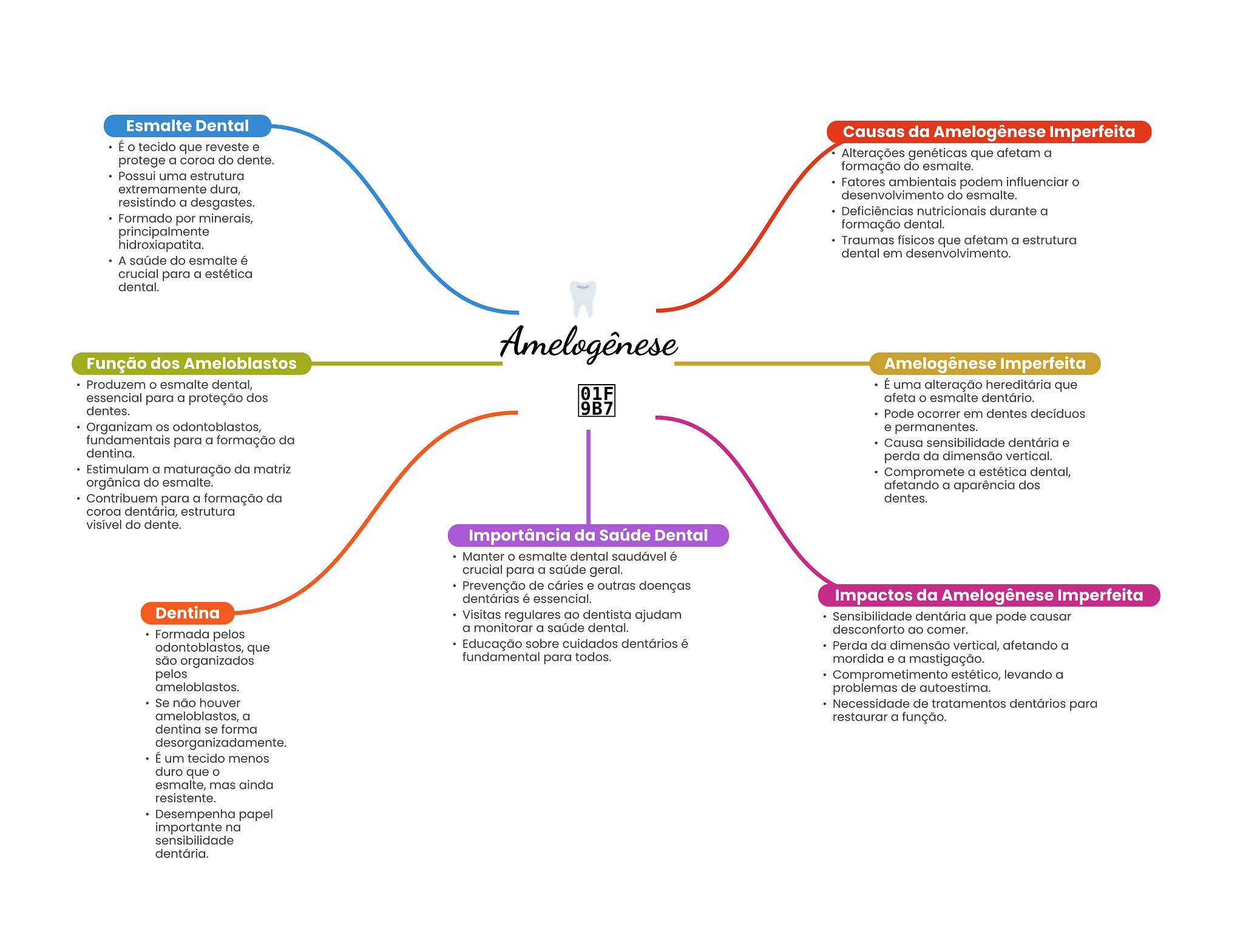 Esmalte Dental Causas da Amelogênese Imperfeita É tecido que reveste e Alterações genéticas que afetam a protege a coroa do dente. formação do esmalte. Possui uma estrutura extremamente dura, Fatores ambientais podem influenciar desenvolvimento do esmalte. resistindo a desgastes. Deficiências nutricionais durante a Formado por minerais, principalmente formação dental. hidroxiapatita. Traumas físicos que afetam a estrutura dental em desenvolvimento. A saúde do esmalte é crucial para a estética dental. Amelogênese Função dos Ameloblastos Amelogênese Imperfeita Produzem esmalte dental, É uma alteração hereditária que essencial para a proteção dos 01F afeta esmalte dentário. dentes. 9B7 Pode ocorrer em dentes decíduos Organizam OS odontoblastos, e permanentes. fundamentais para a formação da Causa sensibilidade dentária e dentina. perda da dimensão vertical. Estimulam a maturação da matriz Compromete a estética dental, orgânica do esmalte. afetando a aparência dos Contribuem para a formação da dentes. coroa dentária, estrutura visível do dente. Importância da Saúde Dental Manter esmalte dental saudável é crucial para a saúde geral. Prevenção de cáries e outras doenças dentárias é essencial. Impactos da Amelogênese Imperfeita Dentina Visitas regulares ao dentista ajudam Sensibilidade dentária que pode causar a monitorar a saúde dental. Formada pelos desconforto ao comer. odontoblastos, que Educação sobre cuidados dentários é Perda da dimensão vertical, afetando a são organizados fundamental para todos. mordida e a mastigação. pelos Comprometimento estético, levando a ameloblastos. problemas de autoestima. Se não houver Necessidade de tratamentos dentários para ameloblastos, a restaurar a função. dentina se forma É um tecido menos duro que esmalte, mas ainda resistente. Desempenha papel importante na sensibilidade dentária.