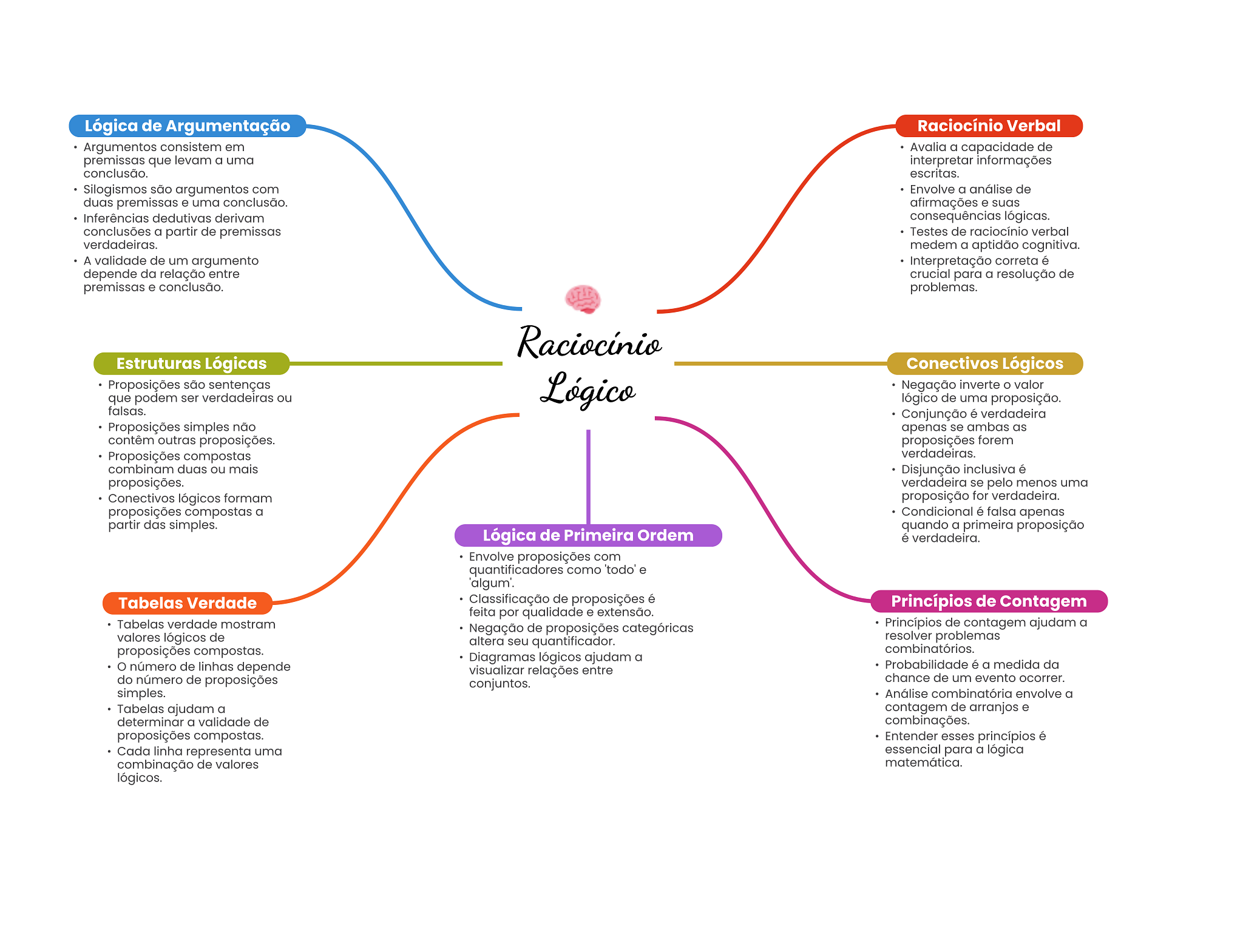 Lógica de Argumentação Raciocínio Verbal Argumentos consistem em Avalia a capacidade de premissas que levam a uma interpretar informações conclusão. escritas. Silogismos são argumentos com Envolve a análise de duas premissas e uma conclusão. afirmações e suas Inferências dedutivas derivam consequências lógicas. conclusões a partir de premissas Testes de raciocínio verbal verdadeiras. medem a aptidão cognitiva. A validade de um argumento Interpretação correta é depende da relação entre crucial para a resolução de premissas e conclusão. problemas. Raciocínio Estruturas Lógicas Conectivos Lógicos Proposições são sentenças Lógico Negação inverte O valor que podem ser verdadeiras ou lógico de uma proposição. falsas. Conjunção é verdadeira Proposições simples não apenas se ambas as contêm outras proposições. proposições forem Proposições compostas verdadeiras. combinam duas ou mais Disjunção inclusiva é proposições. verdadeira se pelo menos uma Conectivos lógicos formam proposição for verdadeira. proposições compostas a Condicional é falsa apenas partir das simples. quando a primeira proposição Lógica de Primeira Ordem é verdadeira. Envolve proposições com quantificadores como 'todo' e Tabelas Verdade Classificação de proposições é Princípios de Contagem feita por qualidade e extensão. Tabelas verdade mostram Negação de proposições categóricas Princípios de contagem ajudam a valores lógicos de altera seu quantificador. resolver problemas proposições compostas. combinatórios. Diagramas lógicos ajudam a número de linhas depende Probabilidade é a medida da visualizar relações entre do número de proposições chance de um evento ocorrer. conjuntos. simples. Análise combinatória envolve a Tabelas ajudam a contagem de arranjos e determinar a validade de combinações. proposições compostas. Entender esses princípios é Cada linha representa uma essencial para a lógica combinação de valores matemática. lógicos.