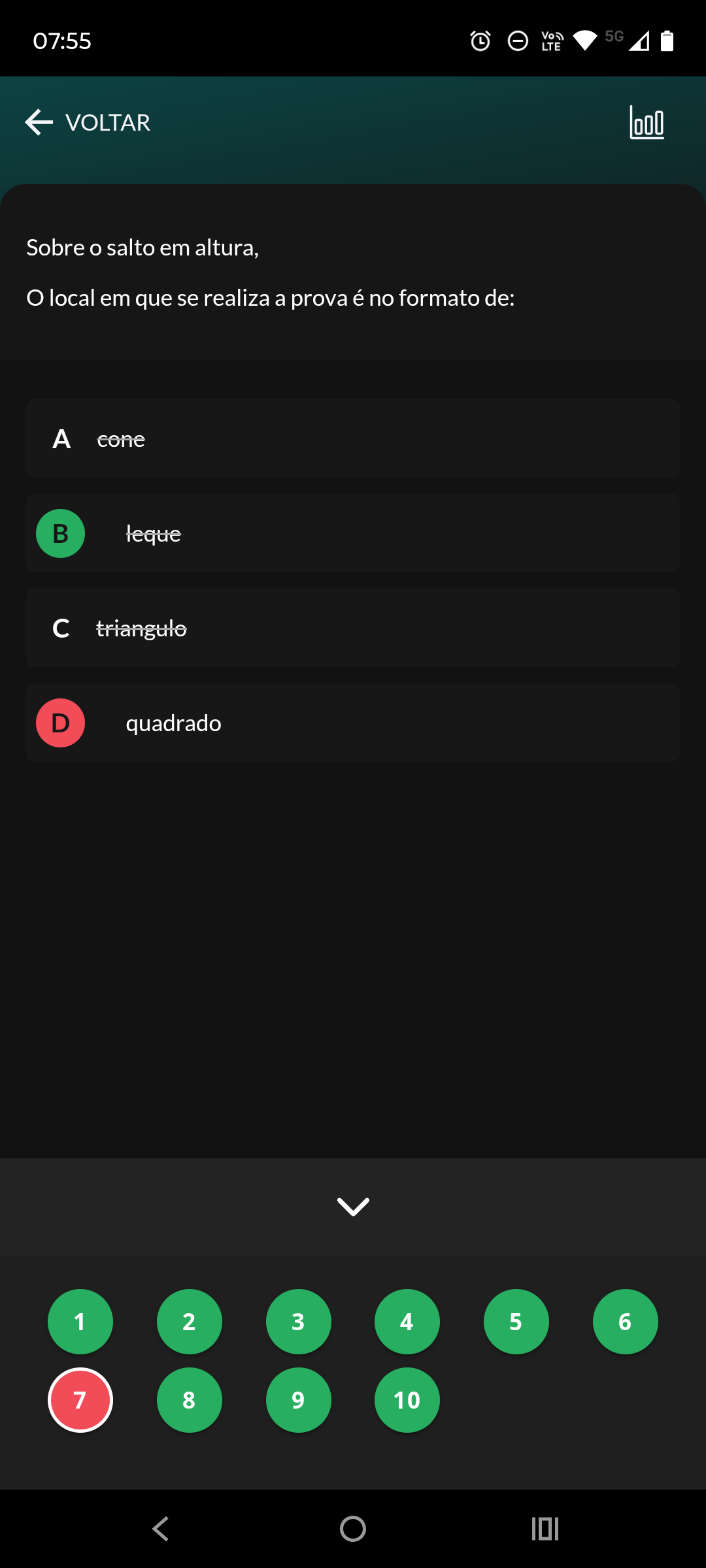 07:55 L 5G LTE VOLTAR Sobre o salto em altura, local em que se realiza a prova é no formato de: A cone leque c triangulo D quadrado 1 2 3 4 5 6 7 8 9 10
