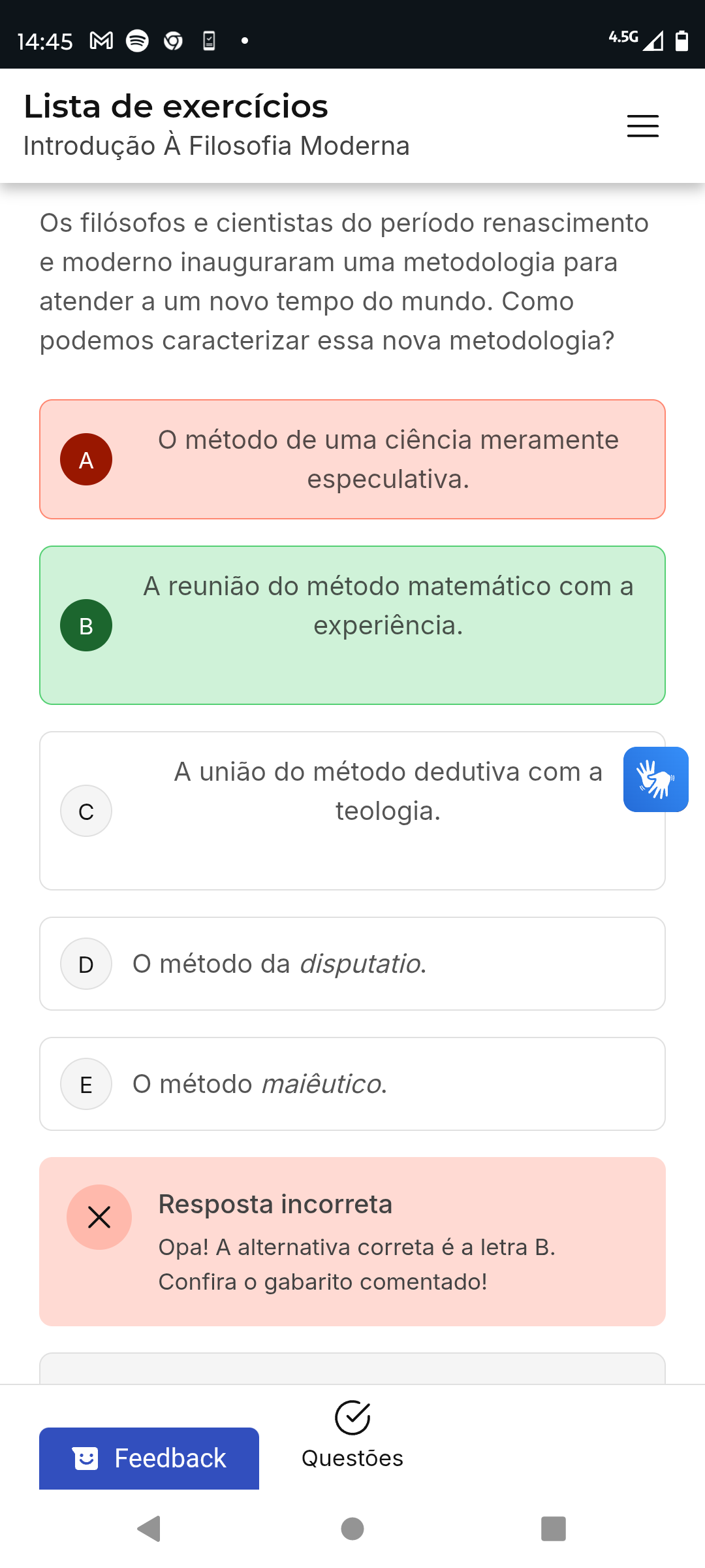 14:45 M 4.5G Lista de exercícios Introdução À Filosofia Moderna Os filósofos e cientistas do período renascimento e moderno inauguraram uma metodologia para atender a um novo tempo do mundo. Como podemos caracterizar essa nova metodologia? método de uma ciência meramente A especulativa. A reunião do método matemático com a B experiência. A união do método dedutiva com a c teologia. D método da disputatio. E método maiêutico. X Resposta incorreta A alternativa correta é a letra B. Confira gabarito comentado! Feedback Questões
