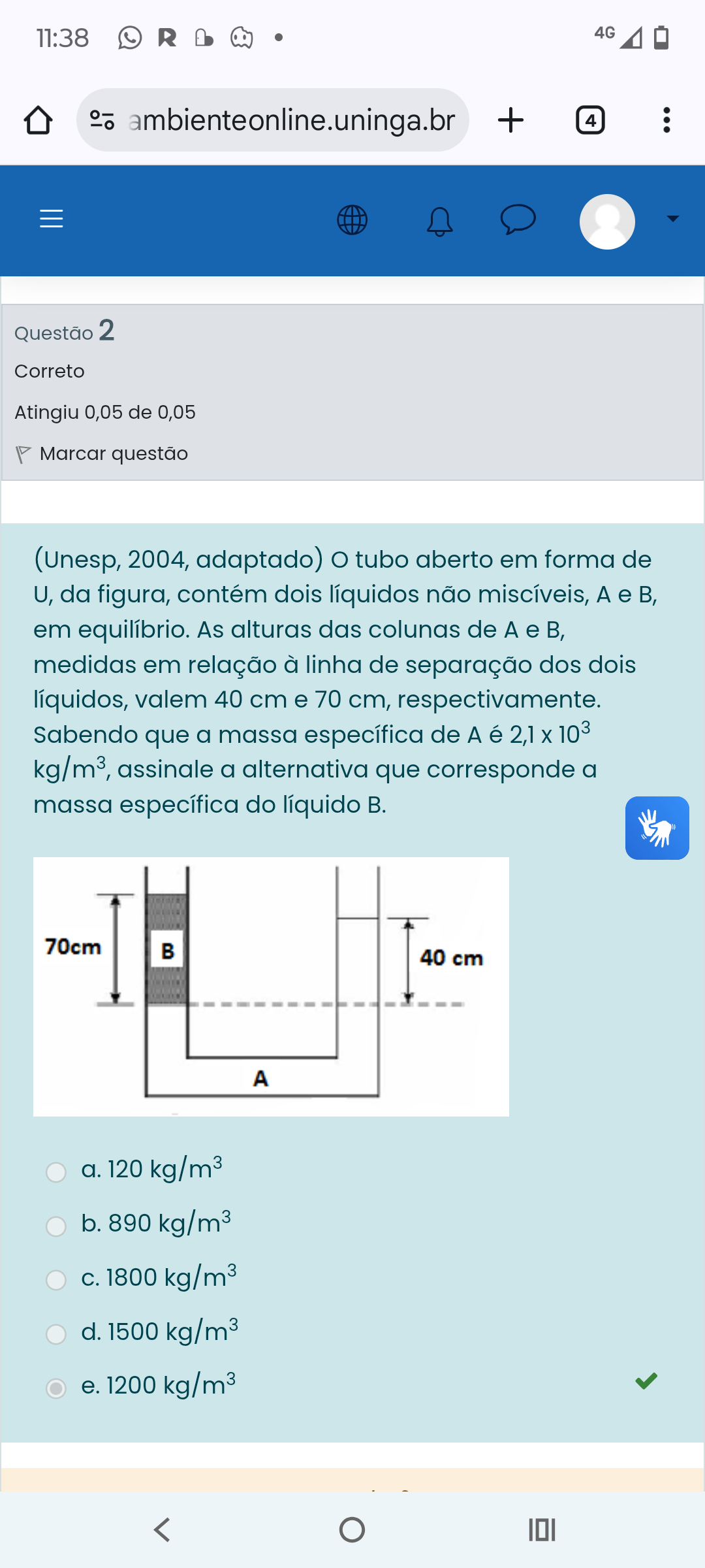 11:38 R 4G + 4 Questão 2 Correto Atingiu 0,05 de 0,05 Marcar questão (Unesp, 2004, adaptado) tubo aberto em forma de U, da figura, contém dois líquidos não miscíveis, e B, em equilíbrio. As alturas das colunas de e B, medidas em relação à linha de separação dos dois líquidos, valem 40 cm e 70 cm, respectivamente. Sabendo que a massa específica de é 2,1 X 10³ assinale a alternativa que corresponde a massa específica do líquido B. 70cm 40 cm A a. 120 b. 890 1800 d. 1500 e. 1200