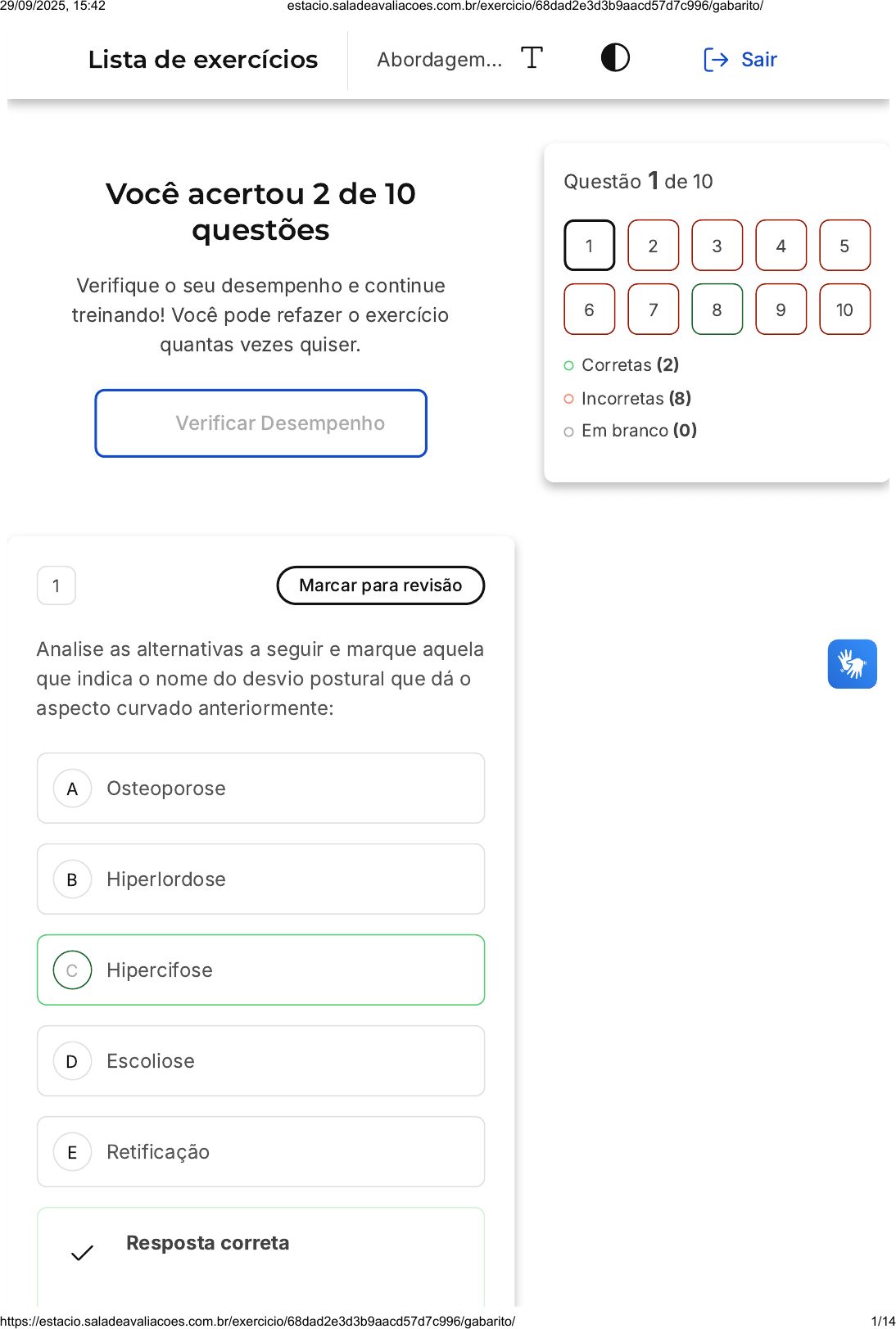 Você acertou 2 de 10 questões Verifique o seu desempenho e continue treinando! Você pode refazer o exercício quantas vezes quiser. Verificar Desempenho A B C D E 1 Marcar para revisão Analise as alternativas a seguir e marque aquela que indica o nome do desvio postural que dá o aspecto curvado anteriormente: Osteoporose Hiperlordose Hipercifose Escoliose Retificação Resposta correta Questão 1 de 10 Corretas (2) Incorretas (8) Em branco (0) 1 2 3 4 5 6 7 8 9 10 Lista de exercícios Abordagem… Sair 29/09/2025, 15:42 estacio.saladeavaliacoes.com.br/exercicio/68dad2e3d3b9aacd57d7c996/gabarito/ https://estacio.saladeavaliacoes.com.br/exercicio/68dad2e3d3b9aacd57d7c996/gabarito/ 1/14 Parabéns, você selecionou a alternativa correta. Confira o gabarito comentado! Gabarito Comentado A hipercifose é o desvio postural que dá o aspecto curvado anteriormente. Este desvio é caracterizado por uma curvatura excessiva da coluna vertebral na região torácica, fazendo com que a pessoa adote uma postura curvada para frente. As demais alternativas, osteoporose, hiperlordose, escoliose e retificação, referem-se a outras condições que não correspondem à descrição dada na questão. 2 Marcar para revisão (PUC-PR - 2017 - Prefeitura de Fazenda Rio Grande - PR - Médico da Família) A dor lombar, aguda e crônica, é uma queixa muito prevalente em consultas ambulatoriais, tanto nas Unidades de Saúde quanto nos serviços de urgência, sendo muito importante para o médico analisar os sinais de alerta envolvidos para direcionar o tratamento adequado a cada caso. Assinale a alternativa CORRETA a respeito do manejo da lombalgia. 29/09/2025, 15:42 estacio.saladeavaliacoes.com.br/exercicio/68dad2e3d3b9aacd57d7c996/gabarito/ https://estacio.saladeavaliacoes.com.br/exercicio/68dad2e3d3b9aacd57d7c996/gabarito/ 2/14 A B C D E A maioria das lombalgias são de origem mecânica, sem irradiação, constituindo 90% dos casos, sem necessidade de Raio X para investigação complementar. Os raios X da coluna lombar são aliados essenciais para o esclarecimento das principais causas de lombalgia. Trata-se de um recurso barato e de simples realização. Paciente que relata dor lombar com piora ou acontecendo à noite ou ao deitar sinaliza quadro de simulação de dor com objetivo de vantagem (atestado médico, benefícios) considerando que os quadros de dor lombar pioram com os esforços. Os achados mais frequentes em raio x de coluna lombar que se relacionam e explicam o quadro de dor lombar crônica são presença de osteófitos marginais e encurtamento dos espaços intervertebrais. A primeira escolha para tratamento da dor lombar de origem mecânica não irradiada é corticoide injetável (dexametasona) IM em dose única, associada a anti-inflamatórios não hormonais VO até melhora da dor. Resposta incorreta Opa! A alternativa correta é a letra A. Confira o gabarito comentado! 29/09/2025, 15:42 estacio.saladeavaliacoes.com.br/exercicio/68dad2e3d3b9aacd57d7c996/gabarito/ https://estacio.saladeavaliacoes.com.br/exercicio/68dad2e3d3b9aacd57d7c996/gabarito/ 3/14 A B Gabarito Comentado A alternativa correta é a "A". A lombalgia, ou dor lombar, é uma condição comum que afeta muitas pessoas. A maioria dessas dores é de origem mecânica, ou seja, relacionada ao movimento ou postura, e não apresenta irradiação para outras partes do corpo. Esses casos representam cerca de 90% das lombalgias. Além disso, na maioria das vezes, não é necessário realizar um Raio X para investigação complementar, pois o diagnóstico pode ser feito com base nos sintomas e no exame físico do paciente. 3 Marcar para revisão (IDECAN - 2017 - CBM-DF - Aspirante do Corpo de Bombeiro) O Traumatismo Raquimedular (TRM) é uma lesão traumática definida como um conjunto de situações que comprometem a função da medula espinhal em graus variados de extensão. Sobre o TRM, assinale a alternativa INCORRETA. Lesão medular incompleta: há alguma função motora ou sensitiva abaixo do nível da lesão Choque medular: é a perda de todas as funções neurológicas abaixo do nível da lesão medular 29/09/2025, 15:42 estacio.saladeavaliacoes.com.br/exercicio/68dad2e3d3b9aacd57d7c996/gabarito/ https://estacio.saladeavaliacoes.com.br/exercicio/68dad2e3d3b9aacd57d7c996/gabarito/ 4/14 C D E Lesão medular completa: as funções motoras e sensitivas estão ausentes abaixo do nível da lesão. Fisioterapia precoce: ainda no período hospitalar, por meio de diferentes técnicas cinesioterapêuticas, não é eficaz nessa fase da doença. Tetraplegia: Ausência de movimento dos membros superiores e inferiores e tronco. Resposta incorreta Opa! A alternativa correta é a letra D. Confira o gabarito comentado! Gabarito Comentado A resposta certa é:Fisioterapia precoce: ainda no período hospitalar, por meio de diferentes técnicas cinesioterapêuticas, não é eficaz nessa fase da doença. 4 Marcar para revisão (Marinha - 2011 - CSM - Primeiro Tenente - Fisioterapia) Na região do quadril, o nervo isquiático pode ser comprimido pelo músculo piriforme (síndrome do piriforme). Quando este músculo é afetado, o paciente apresenta dor e fraqueza nos movimentos de: 29/09/2025, 15:42 estacio.saladeavaliacoes.com.br/exercicio/68dad2e3d3b9aacd57d7c996/gabarito/ https://estacio.saladeavaliacoes.com.br/exercicio/68dad2e3d3b9aacd57d7c996/gabarito/ 5/14 A B C D E Adução e rotação interna do quadril Extensão e rotação interna do quadril Abdução e rotação externa do quadril Flexão e adução do quadril Flexão e abdução do quadril Resposta incorreta Opa! A alternativa correta é a letra C. Confira o gabarito comentado! Gabarito Comentado A resposta certa é:Abdução e rotação externa do quadril 5 Marcar para revisão (IADES/2014 - adaptada) A postura inadequada durante a execução do trabalho é uma das principais causas responsáveis pela ocorrência de lombalgias e lesões na coluna entre os trabalhadores. Para contornar esses da