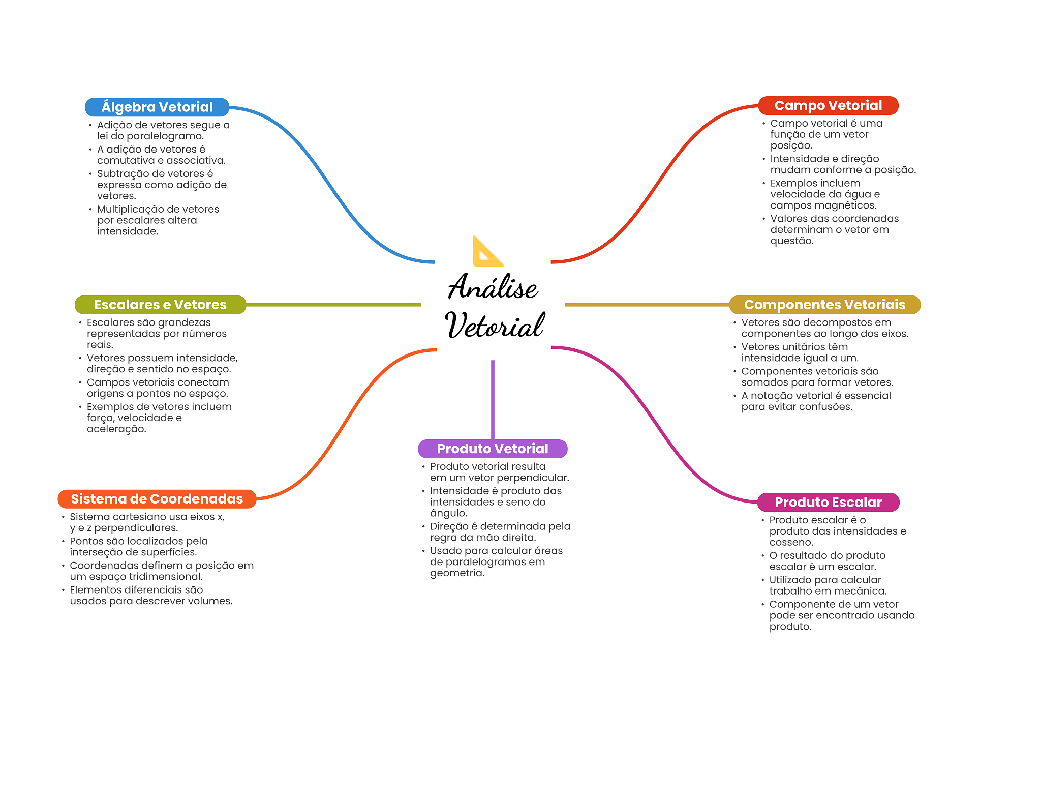Álgebra Vetorial Campo Vetorial Adição de vetores segue a Campo vetorial é uma lei do paralelogramo. função de um vetor A adição de vetores é posição. comutativa e associativa. Intensidade e direção Subtração de vetores é mudam conforme a posição. expressa como adição de Exemplos incluem vetores. velocidade da água e Multiplicação de vetores campos magnéticos. por escalares altera Valores das coordenadas intensidade. determinam O vetor em questão. Análise Escalares e Vetores Componentes Vetoriais Escalares são grandezas Vetorial Vetores são decompostos em representadas por números componentes ao longo dos eixos. reais. Vetores unitários têm Vetores possuem intensidade, intensidade igual a um. direção e sentido no espaço. Componentes vetoriais são Campos vetoriais conectam somados para formar vetores. origens a pontos no espaço. A notação vetorial é essencial Exemplos de vetores incluem para evitar confusões. força, velocidade e aceleração. Produto Vetorial Produto vetorial resulta em um vetor perpendicular. Intensidade é produto das Sistema de Coordenadas intensidades e seno do Produto Escalar Sistema cartesiano usa eixos X, ângulo. Produto escalar é y e Z perpendiculares. Direção é determinada pela produto das intensidades e Pontos são localizados pela regra da mão direita. cosseno. interseção de superfícies. Usado para calcular áreas O resultado do produto Coordenadas definem a posição em de paralelogramos em escalar é um escalar. um espaço tridimensional. geometria. Utilizado para calcular Elementos diferenciais são trabalho em mecânica. usados para descrever volumes. Componente de um vetor pode ser encontrado usando produto.