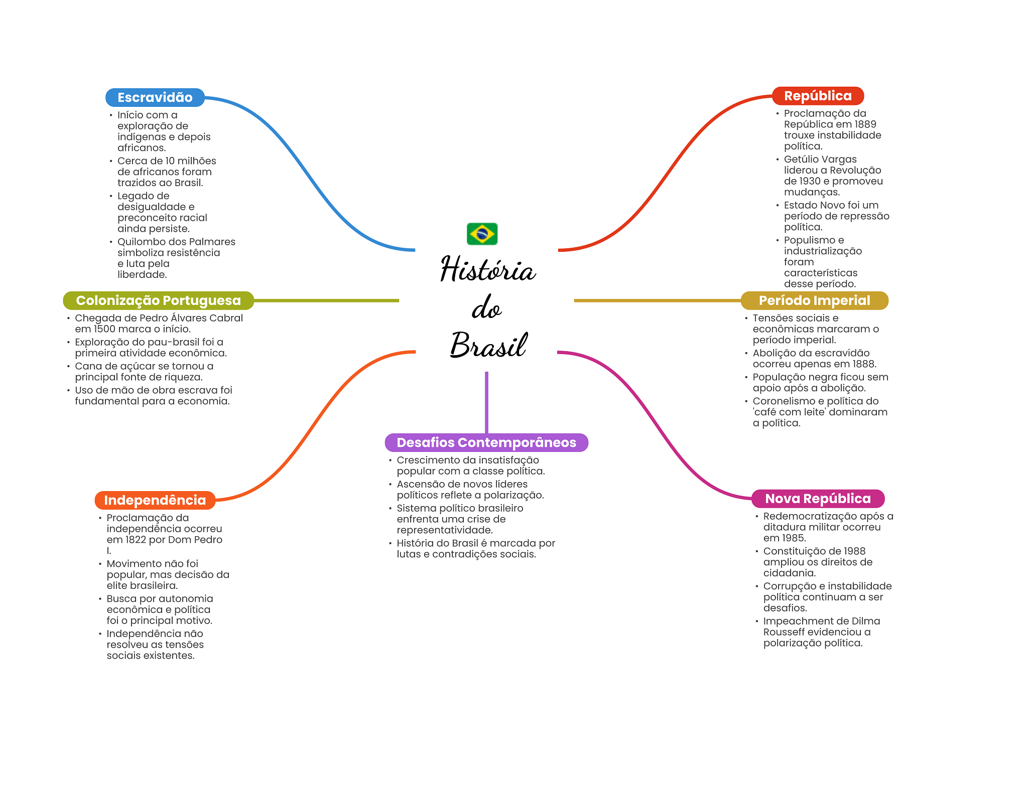 Escravidão República Início com a Proclamação da exploração de República em 1889 indígenas e depois trouxe instabilidade africanos. política. Cerca de 10 milhões Getúlio Vargas de africanos foram liderou a Revolução trazidos ao Brasil. de 1930 e promoveu Legado de mudanças. desigualdade e Estado Novo foi um preconceito racial período de repressão ainda persiste. política. Quilombo dos Palmares Populismo e simboliza resistência industrialização e luta pela História foram liberdade. características desse período. Colonização Portuguesa do Período Imperial Chegada de Pedro Álvares Cabral Tensões sociais e em 1500 marca início. econômicas marcaram Exploração do pau-brasil foi a primeira atividade econômica. Brasil período imperial. Abolição da escravidão Cana de açúcar se tornou a ocorreu apenas em 1888. principal fonte de riqueza. População negra ficou sem Uso de mão de obra escrava foi apoio após a abolição. fundamental para a economia. Coronelismo e política do café com leite' dominaram a política. Desafios Contemporâneos Crescimento da insatisfação popular com a classe política. Ascensão de novos líderes Independência políticos reflete a polarização. Nova República Sistema político brasileiro Proclamação da enfrenta uma crise de Redemocratização após a independência ocorreu representatividade. ditadura militar ocorreu em 1822 por Dom Pedro em 1985. História do Brasil é marcada por I. lutas e contradições sociais. Constituição de 1988 Movimento não foi ampliou direitos de popular, mas decisão da cidadania. elite brasileira. Corrupção e instabilidade Busca por autonomia política continuam a ser econômica e política desafios. foi principal motivo. Impeachment de Dilma Independência não Rousseff evidenciou a resolveu as tensões polarização política. sociais existentes.