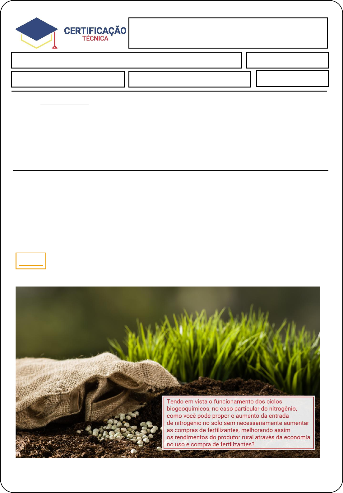 Avaliação Pesquisa/Prática O nitrogênio representa um dos fatores limitantes mais marcantes no crescimento das plantas. Isso é válido para as plantas cultivadas, e isso implica que os fertilizantes e compostos contendo nitrogênio são de vital importância para a produção agrícola. Um exemplo é que em 2007, o Brasil produziu 1% dos fertilizantes nitrogenados no mercado mundial, mas consumiu 3% da produção mundial. Isso significa que o Brasil foi um grande importador de fertilizantes a base de nitrogênio. Fonte http://www.ibram.org.br/cbminas/palestras/25_11_00_Vicente%20Lobo.pdf Considere a parte da entrada de nitrogênio da atmosfera para o solo. Ecologia Aluno (a): Alex Dos Reis Oliveira Data: 15/06/2025 Avaliação Pesquisa/Prática NOTA: INSTRUÇÕES: ❖ Esta Avaliação contém 1 (uma) questão, totalizando 10 (dez) pontos. ❖ Você deve preencher dos dados no Cabeçalho para sua identificação o Nome / Data de entrega ❖ As respostas devem ser digitadas abaixo de cada pergunta. ❖ Ao terminar, grave o arquivo com o nome Avaliação Pesquisa/Prática. ❖ Envio o arquivo pelo sistema. http://www.ibram.org.br/cbminas/palestras/25_11_00_Vicente%20Lobo.pdf http://lrq.sagah.com.br/uasdinamicas/uploads/layouts/1345353399_1571342154a28d8ac53ba7981c2c0cd0a88e247d101e282eda.jpg Avaliação Pesquisa/Prática Escreva sua entrada de nitrogênio da atmosfera para o solo é uma etapa fundamental do ciclo do nitrogênio, um dos ciclos biogeoquímicos essenciais à vida. Essa entrada ocorre principalmente por fixação do nitrogênio atmosférico (N₂), que pode se dar por três vias principais: Fixação Biológica Bactérias fixadoras de nitrogênio convertem o N₂ da atmosfera em compostos nitrogenados utilizáveis pelas plantas, como a amônia (NH₃). Ex: Rhizobium (associadas a raízes de leguminosas), Azotobacter, Cyanobacteria (como as do gênero Anabaena). Fixação Abiótica (Atmosférica) Ocorre por descargas elétricas (raios) durante tempestades. A energia do raio quebra a molécula de N₂, permitindo que ele reaja com o oxigênio e forme óxidos de nitrogênio (NO, NO₂), que se dissolvem na água da chuva e entram no solo como nitratos (NO₃⁻). Fixação Industrial (Processo Haber-Bosch) Em atividades humanas, o N₂ atmosférico é convertido em amônia para produção de fertilizantes. Esses fertilizantes adicionam nitrogênio diretamente ao solo.