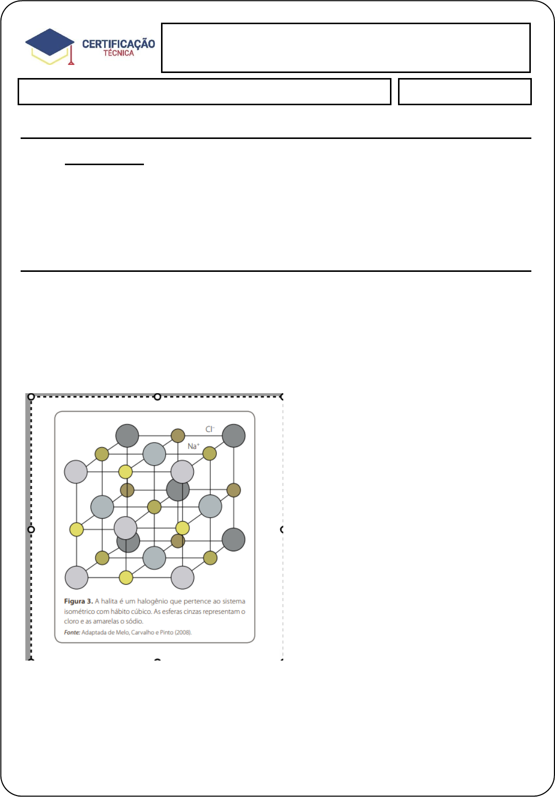 1) Segundo o capítulo do livro base da disciplina, esse cubo de face centrada, quando ocorre uma dissolução em água, cria que cátion e que ânion? RESPOSTA: Na dissolução de um composto de cubo de face centrada, formam- se cátions e ânions específicos ao composto. O SiO4 possui uma geometria tetraédrica e pertence à classe dos silicatos. Mineralogia - sg Aluno (a): ALEX DOS REIS OLIVEIRA Data:15-07-25 INSTRUÇÕES: ❖ Este Laboratório contém questões, totalizando 10 (dez) pontos. ❖ Você deve preencher dos dados no Cabeçalho para sua identificação o Nome / Data de entrega ❖ As perguntas e respostas devem ser retiradas do Roteiro e digitadas logo abaixo. ❖ Ao terminar, grave o arquivo em PDF com o nome do Laboratório Escolhido. ❖ Envio o arquivo pelo sistema. Dissolução de Compostos e Estrutura do SiO4 Quando falamos de um cubo de face centrada, estamos nos referindo a uma estrutura cristalina comum em metais e alguns compostos iônicos. Na dissolução em água, os compostos iônicos se dissociam em seus respectivos cátions e ânions. Por exemplo, se estivermos lidando com um composto como o cloreto de sódio (NaCl), ele se dissociará em Na+ (cátion) e Cl- (ânion). Para determinar quais cátions e ânions são formados, é necessário conhecer a composição química do composto específico que possui a estrutura de cubo de face centrada. Sem essa informação, não podemos identificar os íons exatos formados. Quanto ao SiO4, ele é conhecido como o íon silicato. Este íon possui uma geometria tetraédrica, onde um átomo de silício está centralizado e ligado a quatro átomos de oxigênio. Esta estrutura é bastante estável e é a base para muitos minerais de silicato encontrados na natureza. Os silicatos são uma classe química importante na geologia e na química, devido à sua abundância e variedade de formas. Em resumo, a dissolução de um composto com estrutura de cubo de face centrada em água resultará na formação de cátions e ânions específicos ao composto, enquanto o SiO4 possui uma geometria tetraédrica e pertence à classe dos silicatos. 2) A classificação química mineral baseada nos ânions é de extrema valia para estudos mineralógicos, pois as características em diferentes minerais que têm o mesmo ânion ou pertencem ao mesmo grupo aniônico são muito semelhantes. Os minerais de mesmo grupo aniônico ocorrem em ambientes semelhantes, como é o caso de sulfetos (minerais variados que têm em comum o ânion enxofre — S — em sua fórmula química). Essas características não são marcadas por mesmos cátions; a siderita (FeCO3) tem mais afinidade com a calcita (CaCO3) ou com magnesita (MgCO3) do que com pirita (FeS2) ou com hematita (FeO3), onde o ânion é o oxigênio (O) e o cátion é o ferro (Fe). A química sozinha, todavia, não pode caracterizar um mineral. A classificação deve estar baseada em composição e estrutura interna do mineral, pois em uma classificação química as diferenças estruturais entre minerais podem ser variadas. Identifique a estrutura abaixo, quanto a família química e sua estrutura geométrica, explicando o porquê. RESPOSTA: 1. Família Química •Sulfetos: Contêm o ânion enxofre (S) e incluem minerais como pirita (FeS₂). •Carbonatos: Contêm o ânion carbonato (CO₃²⁻) e incluem minerais como siderita (FeCO₃), calcita (CaCO₃) e magnesita (MgCO₃). •Óxidos: Contêm o ânion oxigênio (O) e incluem minerais como hematita (Fe₂O₃). 2. Estrutura Geométrica •Carbonatos: Os carbonatos possuem uma estrutura em que o grupo carbonato (CO₃²⁻) está em uma configuração trigonal planar. •Sulfetos: Os sulfetos frequentemente têm uma estrutura onde o enxofre está ligado a metais, formando uma estrutura cristalina geralmente cúbica ou hexagonal. •Óxidos: Os óxidos podem ter várias estruturas, como cúbica (por exemplo, a estrutura da hematita é trigonal com a fórmula Fe₂O₃) ou outras formas geométricas dependendo dos cátions. Exemplos Específicos: •Siderita (FeCO₃): Pertence ao grupo dos carbonatos e tem uma estrutura em que o grupo carbonato está coordenado ao ferro. •Calcita (CaCO₃): Também é um carbonato e possui uma estrutura cristalina romboédrica. •Pirita (FeS₂): Pertence ao grupo dos sulfetos e tem uma estrutura cúbica (sistema cristalino). Identificação: Se a estrutura descrita é baseada na presença de ânions como o carbonato (CO₃²⁻), então se enquadra na família dos carbonatos e tem uma estrutura trigonal planar. Se a estrutura é baseada em ânions como o enxofre (S), então faz parte da família dos sulfetos e pode ter uma estrutura cúbica. Para óxidos, a estrutura pode variar, mas frequentemente segue padrões cúbicos ou trigonal. Portanto, a identificação precisa de uma estrutura específica necessitaria de mais detalhes sobre a configuração geométrica. A estrutura geométrica pode ser determinada observando a forma do cristal e como os ânions e cátions se organizam em um arranjo tridimensional 3) Dê exemplos de metais nativos em mineralogia. Qual seria o melhor transmissor de elétrons ou energia? RESPOSTA:Na mineralogia, os metais nativos são aqueles que ocorrem na natureza em sua forma metálica, sem estarem combinados com outros elementos como compostos. Aqui estão alguns exemplos de metais nativos: 1. Ouro (Au): É um dos metais mais valiosos e conhecidos por sua resistência à corrosão e beleza. Historicamente, foi utilizado em joalheria, moeda e como um padrão internacional de valor monetário. 2. Prata (Ag): Conhecido por sua elevada condutividade elétrica e térmica, a prata é usada em uma variedade de aplicações que incluem eletrônica, joalheria, fotografia e como um catalisador em reações químicas. 3. Cobre (Cu): Outra escolha bastante comum, o cobre é amplamente usado em aplicações elétricas devido à sua excelente capacidade de conduzir eletricidade. É também 