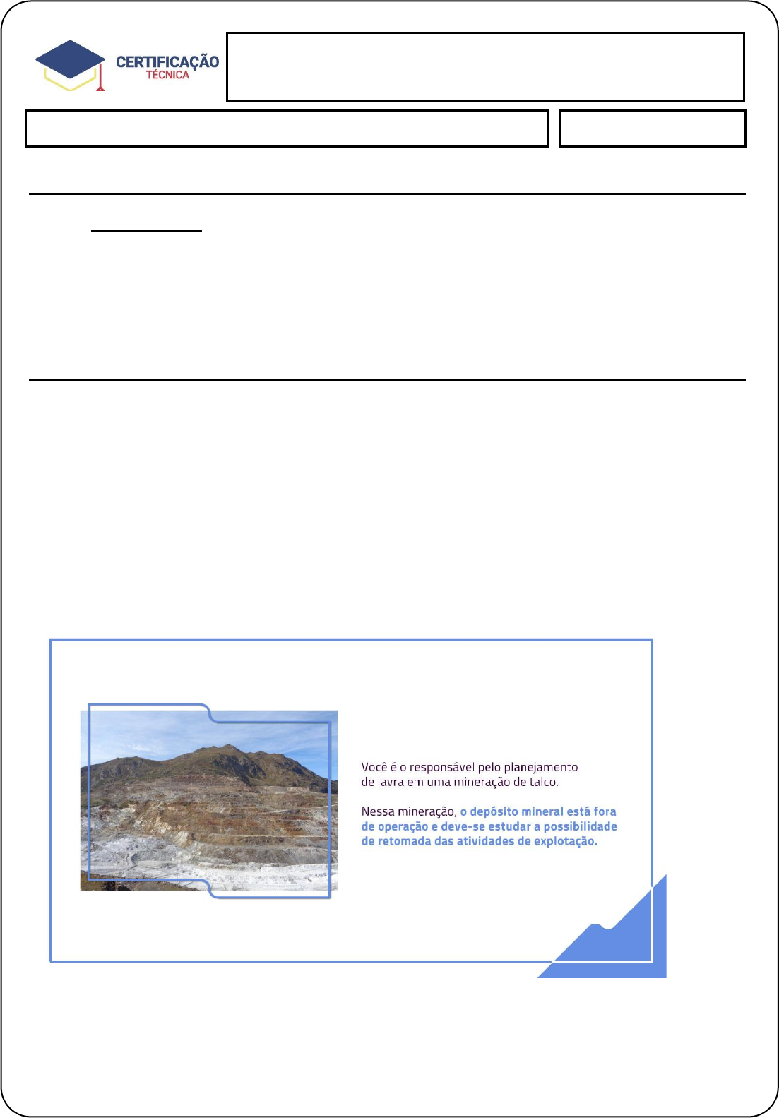 Na mineração, é essencial a constante busca pelo aumento da produtividade nas operações unitárias e redução de custos de produção. Esses objetivos são alcançados a partir da utilização de ferramentas e métodos que auxiliem a tomada de decisão nas rotinas de trabalho dos diversos setores do processo produtivo dessa indústria, que abrangem desde a pesquisa mineral, o planejamento das atividades e controle das operações unitárias inerentes ao ciclo produtivo mineral até o monitoramento das áreas mineradas. Imagine que você atua como engenheiro de minas. Nesse contexto, o que você faria para planejar a retomada das operações de lavra? Justifique sua resposta e apresente como você desenvolveria a solução. Topografia de Minas - sg Aluno (a): ALEX DOS REIS OLIVEIRA Data:20-08-25 INSTRUÇÕES: ❖ Este Laboratório contém questões, totalizando 10 (dez) pontos. ❖ Você deve preencher dos dados no Cabeçalho para sua identificação o Nome / Data de entrega ❖ As perguntas e respostas devem ser retiradas do Roteiro e digitadas logo abaixo. ❖ Ao terminar, grave o arquivo em PDF com o nome do Laboratório Escolhido. ❖ Envio o arquivo pelo sistema. RESPOSTA: 1.Avaliação do Depósito Mineral: Primeiro, eu realizaria uma avaliação completa do depósito mineral para entender a quantidade e a qualidade do talco disponível. Isso envolveria a coleta e análise de amostras do depósito. 2. Estudo de Viabilidade**: Em seguida, eu conduziria um estudo de viabilidade para determinar se a retomada das operações de mineração seria economicamente viável. Isso incluiria a análise dos custos de produção, preços de mercado do talco, demanda esperada e possíveis receitas. 3. Planejamento da Lavra**: Com base nos resultados do estudo de viabilidade, eu desenvolveria um plano de lavra detalhado. Isso incluiria a definição das técnicas de mineração a serem utilizadas, o sequenciamento das operações de mineração e a estimativa dos recursos necessários. 4. Gestão Ambiental**: Eu também desenvolveria um plano de gestão ambiental para minimizar o impacto das operações de mineração no meio ambiente. Isso incluiria medidas para prevenir a poluição, proteger a biodiversidade local e recuperar a área após a conclusão das operações de mineração. 5. Segurança e Saúde Ocupacional**: Por fim, eu implementaria medidas para garantir a segurança e a saúde dos trabalhadores. Isso incluiria a formação de uma equipe de segurança, a implementação de protocolos de segurança e a realização de treinamentos regulares de segurança. Esses passos ajudariam a garantir que a retomada das operações de mineração seja realizada de maneira eficiente, rentável e sustentável.