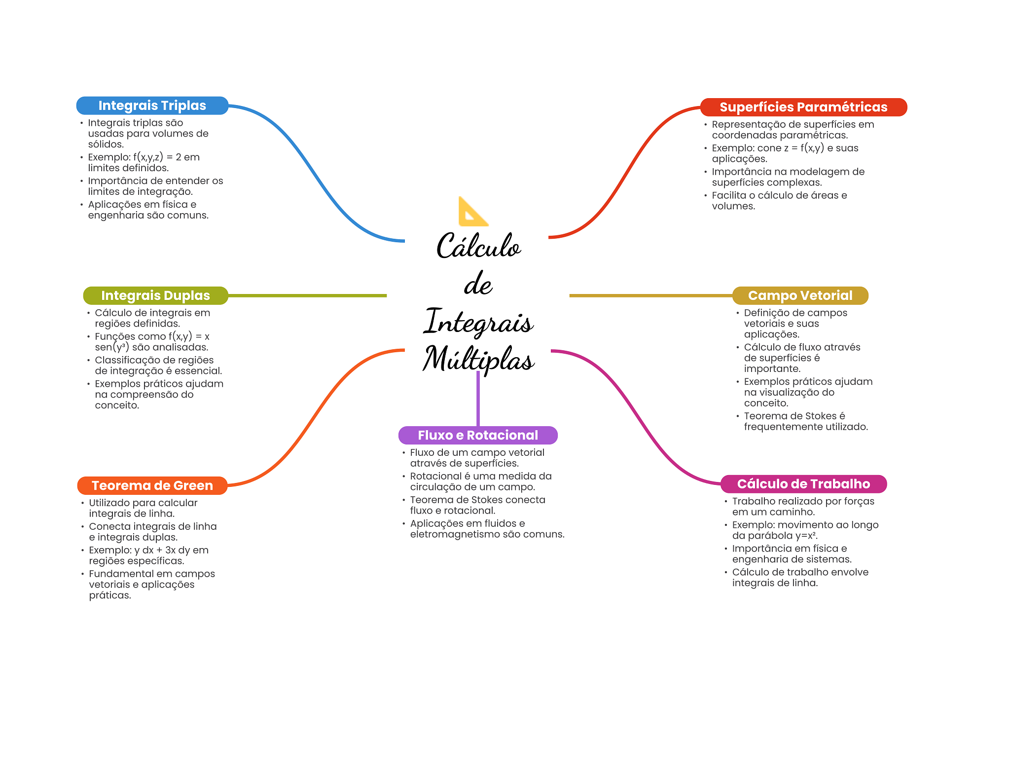 Integrais Triplas Superfícies Paramétricas Integrais triplas são Representação de superfícies em usadas para volumes de coordenadas paramétricas. sólidos. Exemplo: cone Z = f(x,y) e suas Exemplo: f(x,y,z) = 2 em aplicações. limites definidos. Importância na modelagem de Importância de entender OS superfícies complexas. limites de integração. Facilita cálculo de áreas e Aplicações em física e volumes. engenharia são comuns. Cálculo de Integrais Duplas Campo Vetorial Cálculo de integrais em Integrais Definição de campos regiões definidas. vetoriais e suas Funções como f(x,y) = X aplicações. são analisadas. Cálculo de fluxo através Classificação de regiões Múltiplas de superfícies é de integração é essencial. importante. Exemplos práticos ajudam Exemplos práticos ajudam na compreensão do na visualização do conceito. conceito. Teorema de Stokes é frequentemente utilizado. Fluxo e Rotacional Fluxo de um campo vetorial através de superfícies. Rotacional é uma medida da Teorema de Green circulação de um campo. Cálculo de Trabalho Utilizado para calcular Teorema de Stokes conecta Trabalho realizado por forças integrais de linha. fluxo e rotacional. em um caminho. Conecta integrais de linha Aplicações em fluidos e Exemplo: movimento ao longo e integrais duplas. eletromagnetismo são comuns. da parábola Exemplo: y dx + 3x dy em Importância em física e regiões específicas. engenharia de sistemas. Fundamental em campos Cálculo de trabalho envolve vetoriais e aplicações integrais de linha. práticas.