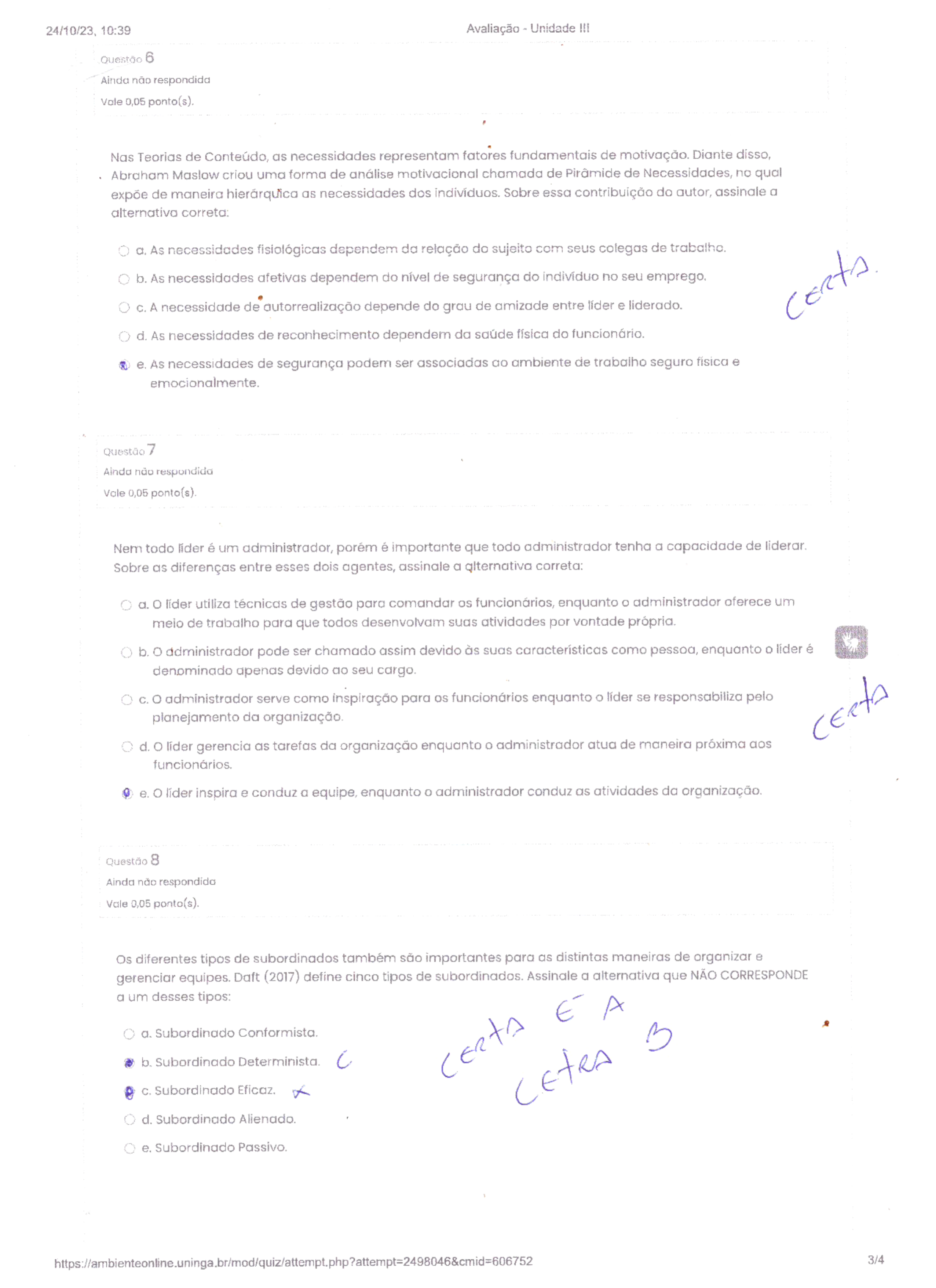 24/10/23, 10:39 Avaliação Unidade III 6 Ainda não respondida Vale 0,05 ponto(s). Nas Teorias de Conteúdo, as necessidades representam fatores fundamentais de motivação. Diante disso, Abraham Maslow criou uma forma de análise motivacional chamada de Pirâmide de Necessidades, no qual expõe de maneira hierárquica as necessidades dos indivíduos. Sobre essa contribuição do autor, assinale a alternativa correta: As necessidades fisiológicas dependem da relação do sujeito com seus colegas de trabalho. b. As necessidades afetivas dependem do nível de segurança do no seu emprego. C. A necessidade de autorrealização depende do grau de amizade entre líder e liderado. d. As necessidades de reconhecimento dependem da saúde física do funcionário. e. necessidades de segurança podem ser associadas ambiente de trabalho seguro física e emocionalmente. Questão 7 Ainda não respondida Vole 0,05 ponto(s). Nem todo lider é um administrador, porém é importante que todo administrador tenha a capacidade de liderar. Sobre as diferenças entre esses dois agentes, assinale a alternativa correta: a. utiliza técnicas de gestão para comandar funcionários, enquanto administrador oferece um de trabalho para que todos desenvolvam suas atividades por vontade própria. b. administrador pode ser chamado assim devido às suas características como pessoa, enquanto lider é denominado apenas devido ao seu cargo. administrador serve como inspiração para os funcionários enquanto o líder se responsabiliza pelo planejamento da organização. d. gerencia as tarefas da organização enquanto administrador atua de maneira próxima aos funcionários. e. inspira e conduz a equipe, enquanto o administrador conduz as atividades da organização. Questão 8 Ainda não respondida Vale 0,05 ponto(s). Os diferentes tipos de subordinados também são importantes para as distintas maneiras de organizar e gerenciar equipes. Daft (2017) define cinco tipos de subordinados. Assinale a alternativa que NÃO CORRESPONDE a um desses tipos: a. Subordinado Conformista. b. Subordinado C. Subordinado Eficaz. d. Subordinado Alienado. e. Subordinado 3/4