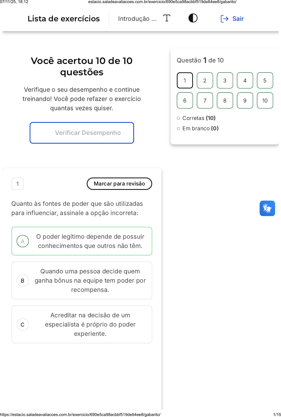 Você acertou 10 de 10 questões Verifique o seu desempenho e continue treinando! Você pode refazer o exercício quantas vezes quiser. Verificar Desempenho A B C 1 Marcar para revisão Quanto às fontes de poder que são utilizadas para influenciar, assinale a opção incorreta: O poder legítimo depende de possuir conhecimentos que outros não têm. Quando uma pessoa decide quem ganha bônus na equipe tem poder por recompensa. Acreditar na decisão de um especialista é próprio do poder experiente. Questão 1 de 10 Corretas (10) Em branco (0) 1 2 3 4 5 6 7 8 9 10 Lista de exercícios Introdução … Sair 07/11/25, 18:12 estacio.saladeavaliacoes.com.br/exercicio/690e5ca98acbbf519de84ee8/gabarito/ https://estacio.saladeavaliacoes.com.br/exercicio/690e5ca98acbbf519de84ee8/gabarito/ 1/15 D E Um espião pode exercer sua influência pelo seu poder por informação. Respeitar as decisões de um familiar querido é um exemplo do poder referencial. Resposta correta Parabéns, você selecionou a alternativa correta. Confira o gabarito comentado! Gabarito Comentado A alternativa A está incorreta porque o poder legítimo não depende de possuir conhecimentos que outros não têm. O poder legítimo é baseado na posição hierárquica ou no status de uma pessoa dentro de uma organização ou grupo. Ele não está necessariamente ligado ao conhecimento que a pessoa possui. Portanto, a afirmação de que o poder legítimo depende de possuir conhecimentos que outros não têm é falsa. 2 Marcar para revisão Em relação às escolas de pesquisa sobre liderança, a escola Contingencial acredita que: 07/11/25, 18:12 estacio.saladeavaliacoes.com.br/exercicio/690e5ca98acbbf519de84ee8/gabarito/ https://estacio.saladeavaliacoes.com.br/exercicio/690e5ca98acbbf519de84ee8/gabarito/ 2/15 A B C D E O comportamento dos líderes deve ser estudado em situações específicas. Os atributos pessoais determinam a efetividade da liderança. Deve ser estudada a relação entre os líderes e os seguidores. Ser um bom líder depende de certas características biológicas. A verdadeira liderança transforma os membros do grupo e a si mesma. Resposta correta Parabéns, você selecionou a alternativa correta. Confira o gabarito comentado! Gabarito Comentado A escola Contingencial de pesquisa sobre liderança defende a ideia de que o comportamento dos líderes deve ser estudado em situações específicas. Isso significa que, para essa escola, a eficácia da liderança é altamente dependente do contexto ou da situação em que o líder se encontra. Portanto, a alternativa correta é: "O comportamento dos líderes deve ser estudado em situações específicas". 3 Marcar para revisão 07/11/25, 18:12 estacio.saladeavaliacoes.com.br/exercicio/690e5ca98acbbf519de84ee8/gabarito/ https://estacio.saladeavaliacoes.com.br/exercicio/690e5ca98acbbf519de84ee8/gabarito/ 3/15 A B C D E Uma empresa de consultoria adotou um estilo de liderança transformacional, buscando inspirar e motivar os empregados a alcançar objetivos ambiciosos e inovadores. O foco está na criação de uma visão compartilhada e no encorajamento de ideias criativas. Qual é a característica principal da liderança transformacional adotada pela empresa de consultoria? Enfatizar a hierarquia e o controle. Inspirar e motivar empregados para alcançar metas ambiciosas. Reduzir a inovação e criatividade. Priorizar processos burocráticos. Focar na manutenção do status quo. Resposta correta Parabéns, você selecionou a alternativa correta. Confira o gabarito comentado! Gabarito Comentado A liderança transformacional, conforme aplicada na empresa de consultoria, destaca-se por inspirar e motivar os empregados a alcançar metas ambiciosas e inovadoras. Diferencia-se de abordagens que priorizam controle, redução da criatividade, burocracia ou manutenção do status quo, enfatizando em vez disso a 07/11/25, 18:12 estacio.saladeavaliacoes.com.br/exercicio/690e5ca98acbbf519de84ee8/gabarito/ https://estacio.saladeavaliacoes.com.br/exercicio/690e5ca98acbbf519de84ee8/gabarito/ 4/15 A B C D E visão compartilhada, inovação e a motivação dos colaboradores. 4 Marcar para revisão Um dos princípios da liderança ética é a contribuição para a comunidade, que se manifesta: Quando se busca o benefício dos trabalhadores acima de tudo. Quando a atividade da organização tem um impacto positivo na sociedade. Quando se realizam ações para ajudar as famílias dos líderes. Quando se entregam produtos ou realizam serviços de graça aos órgãos de poder locais. Quando a empresa contribui para ações culturais de incentivo fiscal. Resposta correta Parabéns, você selecionou a alternativa correta. Confira o gabarito comentado! Gabarito Comentado A alternativa correta é a B, que afirma que a contribuição para a comunidade se 07/11/25, 18:12 estacio.saladeavaliacoes.com.br/exercicio/690e5ca98acbbf519de84ee8/gabarito/ https://estacio.saladeavaliacoes.com.br/exercicio/690e5ca98acbbf519de84ee8/gabarito/ 5/15 A B C manifesta quando a atividade da organização tem um impacto positivo na sociedade. Isso significa que a organização, através de suas atividades, deve gerar benefícios para a sociedade, seja por meio de produtos, serviços ou ações que promovam o bem-estar social. Isso está alinhado com o princípio da liderança ética, que preza pela responsabilidade social e pelo compromisso com a comunidade. 5 Marcar para revisão A capacidade de tomar decisões assertivas é uma qualidade valiosa em qualquer líder, envolvendo análise crítica, consideração de diferentes perspectivas e escolha de ações que alinham com os objetivos e valores do grupo. Luís, presidente do grêmio estudantil, enfrenta uma decisão difícil sobre a alocação de recursos limitados para projetos. Como ele pode demonstrar liderança assertiva na tomada de decisão? Seguir sua intuição sem consultar outros membros. Convocar uma votação para que a maioria decida. Realizar uma an