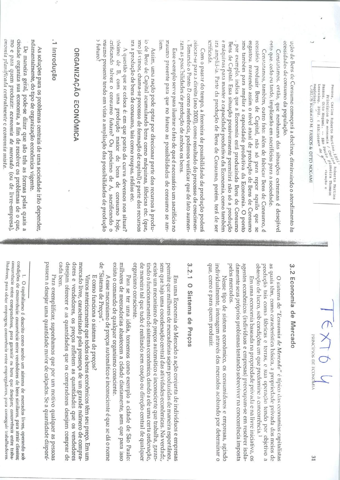1951 Roberto Martins Passos, Carlos Roberto pioneira Thomson Princípios de economia Passos, Otto Paulo e Nogami. TEXTO Learning, 2002. Biblioteca de negócios) PRINCÍPIOS DE ECONOMIA 31 CARLOS ROBERTO M. PASSOS & OTTO NOGAMI ução de Bens de Consumo começará a declinar, diminuindo atendimento às 3.2 Economia de Mercado ecessidades de consumo da população. Constatamos, então, que nenhuma das situações extremas é desejável sistema de "Economia de Mercado" é típico das economias capitalistas osto que. cedo ou tarde, implicarão em sacrifícios para a sociedade. as quais têm, como característica básica, a propriedade privada dos meios de Constatamos, também, outro fato: além de fabricar Bens de Consumo, é produção tais como fábricas e terras, e sua operação tendo por objetivo a ecessário produzir Bens de Capital, não só para repor aquilo que se obtenção de lucro, sob condições em que predomine a concorrência. mantendo assim o nível atual de produção de Bens de Consumo Em uma economia baseada na propriedade privada e na livre iniciativa, os omo também para ampliar a capacidade produtiva da Economia. O ponto agentes econômicos (indivíduos empresas) preocupam-se em resolver isola- por exemplo, indica que a Economia está produzindo Bens de Consumo damente seus próprios problemas tentando sobreviver na concorrência imposta Bens de Capital. Essa situação possivelmente permitirá não só a produção pelos mercados. e máquinas para manter a capacidade produtiva da Economia, como também Nesse tipo de sistema econômico, os consumidores e empresas, agindo ara ampliá-la. Parte da produção de Bens de Consumo, porém, terá de ser individualmente, interagem através dos mercados acabando por determinar o que, como e para quem produzir. Com o passar do tempo, a fronteira de possibilidade de produção poderá eslocar-se para a direita (ano 2000), como resultado do processo de crescimen- Tomando o Ponto D como referência, podemos verificar que de fato aumen- 3.2.1 Sistema de Preços ram as possibilidades de produção de ambos OS bens. Esse exemplo serve para ilustrar o fato de que é necessário um sacrifício no Em uma Economia de Mercado a ação conjunta de indivíduos e empresas presente para que no futuro as possibilidades de consumo se am- permite que milhares de mercadorias sejam produzidas de maneira espontânea, liem. sem que haja uma coordenação central das atividades econômicas. Na verdade, Assim, uma nação pode optar por direcionar parte dos recursos à produ- existe um mecanismo de preços automático e inconsciente que trabalha, garan- de Bens de Capital acumulando bens como máquinas, fábricas etc. (que, tindo o funcionamento do sistema econômico, dando a ele uma certa ordenação, já vimos, chama-se processo de formação de capital) e parte dos recursos de maneira tal que tudo é realizado sem coação ou direção central de qualquer ara a produção de bens de consumo, tais como roupas, rádios etc. organismo consciente. Para se ter uma idéia, tomemos como exemplo a cidade de São Paulo: A questão que se coloca é: em que ponto da curva devemos nos situar? de B, com uma produção maior de bens de consumo hoje, milhares de mercadorias abastecem a cidade diariamente, sem que para isso crificando talvez consumo futuro? Ou próximo de A, sacrificando o exista comando de qualquer organismo consciente. presente tendo em vista a ampliação das possibilidades de produção A esse mecanismo de preços automático e inconsciente é que se dá o nome ) futuro? de "Sistema de Preços". E como funciona o sistema de preços? Vimos anteriormente que todos OS bens econômicos têm seu preço. Em um ORGANIZAÇÃO ECONÔMICA mercado livre, caracterizado pela presença de um grande número de compra- dores e vendedores, preços refletem as quantidades que os vendedores desejam oferecer e as quantidades que compradores desejam comprar de cada bem. .1 Introdução Para exemplificar, suponhamos que por um motivo qualquer as pessoas passem a desejar uma quantidade de calçados. Se a quantidade disponí- As soluções para os problemas centrais de uma sociedade irão depender, ndamentalmente, do tipo de organização econômica vigente. De maneira geral, pode-se dizer que são três as formas pelas quais a 1. capitalismo é descrito como sendo um sistema de mercados livres, operando sob ciedade organiza sua economia, a fim de resolver problemas de o que, condições de concorrência: entre vendedores de bens similares, para atrair clientes; mo e para quem produzir: economia de mercado (ou de livre-empresa), concorrência entre compradores, para garantir bens que desejam; concorrência entre traba- onomia planificada centralmente e economia mista. lhadores, para obter empregos; concorrência entre empregadores, para conseguir trabalhadores.PRINCÍPIOS DE ECONOMIA 33 32 CARLOS ROBERTO M. PASSOS & OTTO NOGAMI Estado o estabelecimento de regras visando proteger a liberdade econômica, vel de calçados for menor que a quantidade procurada, então haverá uma zelando, assim, pelo livre jogo da oferta e procura. Uma economia de mercado disputa entre os compradores para garantir a aquisição desse bem. Isso fará resolve os três problemas econômicos fundamentais simultaneamente, conci- com que o preço do calçado acabe se elevando, em parte porque as pessoas se liando oferta e procura em cada mercado específico. Vejamos como isso ocorre: dispõem a pagar mais pelo produto, em parte porque os produtores, perceben- do o grande interesse pela sua mercadoria, acabam por elevar-lhe o preço. A elevação de preço acabará por excluir os que não dispõem de recursos para 3.2.2.1 Que Produzir? pagar preços mais altos. Com a alta do preço, os produtores de calçados serão estimulados a aumentar a produção. Se esse aumento na produção for muito Em um sistema econômico baseado nas ações apenas das famílias e das grande, poderá haver um excesso d