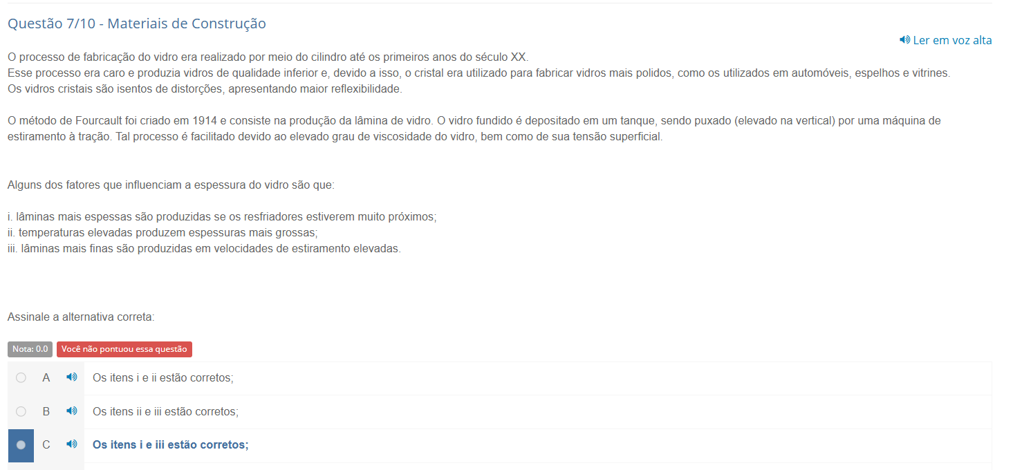 Questão 7/10 Materiais de Construção Ler em voz alta processo de fabricação do vidro era realizado por meio do cilindro até primeiros anos do século XX. Esse processo era caro e produzia vidros de qualidade inferior e, devido a isso, cristal era utilizado para fabricar vidros mais polidos, como utilizados em automóveis, espelhos e vitrines. Os vidros cristais são isentos de distorções, apresentando maior reflexibilidade. O método de Fourcault foi criado em 1914 e consiste na produção da lâmina de vidro. vidro fundido é depositado em um tanque, sendo puxado (elevado na vertical) por uma máquina de estiramento à tração. Tal processo é facilitado devido ao elevado grau de viscosidade do vidro, bem como de sua tensão superficial. Alguns dos fatores que influenciam a espessura do vidro são que: i. lâminas mais espessas são produzidas se resfriadores estiverem muito próximos; ii. temperaturas elevadas produzem espessuras mais grossas; iii. lâminas mais finas são produzidas em velocidades de estiramento elevadas. Assinale a alternativa correta: Nota: 0.0 Você não pontuou essa questão A Os itens i e ii estão corretos; B Os itens ii e iii estão corretos; C Os itens i e iii estão corretos;