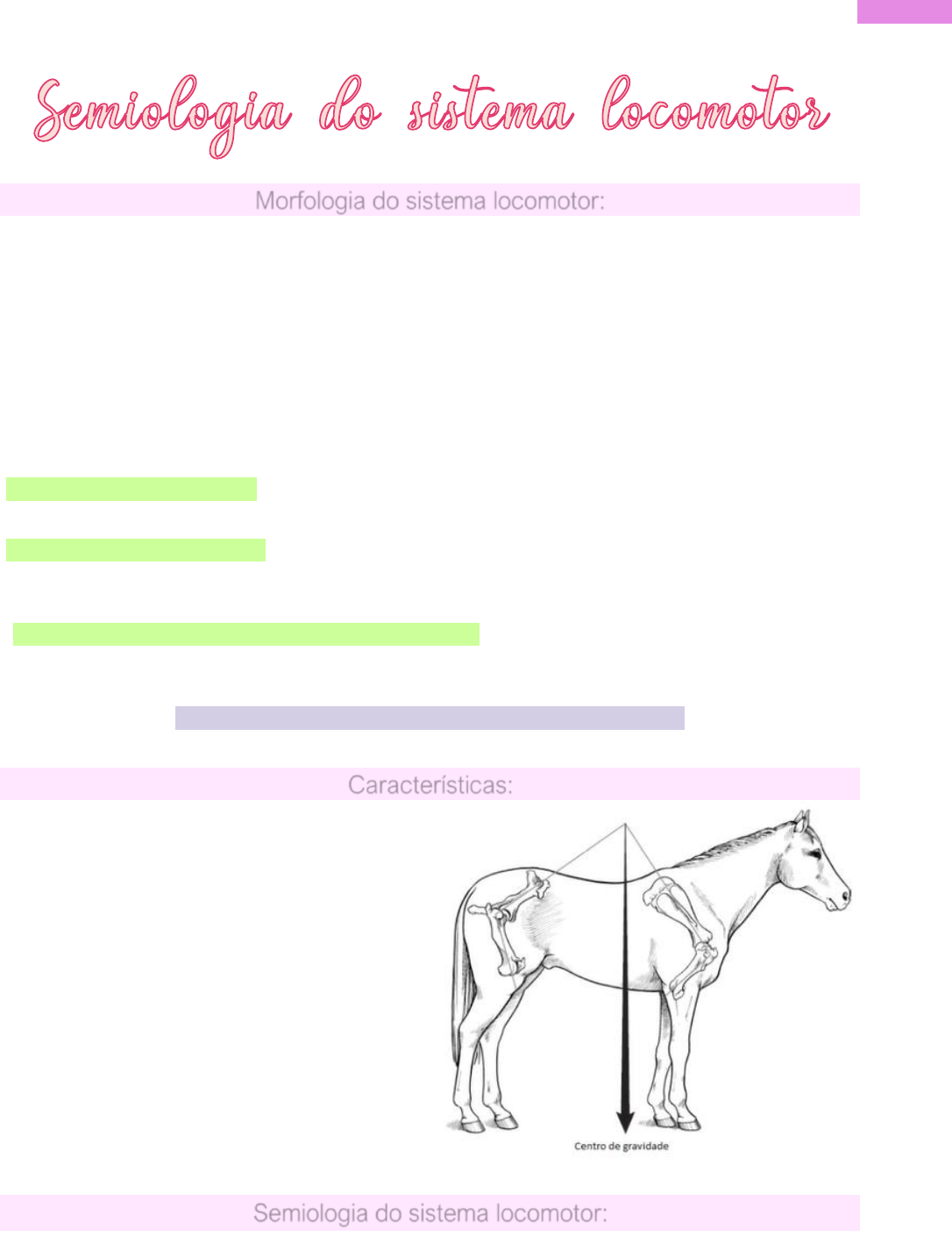 1 01 a 22 de março de 2021 – Clínica de grandes animais I Morfologia do sistema locomotor: • Membros locomotores: torácicos (anteriores) e pélvicos (posteriores). • Coluna: cervical e toracolombar. • Tecidos que auxiliam na locomoção: - tecido ósseo: sustentação e estrutura. - tecido muscular: promove a movimentação. - tendões: origem muscular e inserção óssea. Responsável pela movimentação juntamente com o músculo. - ligamentos: origem óssea e inserção óssea. Promove estabilidade. - articulações Tendão flexor digital profundo: origem no músculo flexor, se insere na falange distal. Se houver alguma lesão nele, o animal não vai mais conseguir flexionar a falange distal pois ele é o único ali. Tendão flexor digital superficial: origem no músculo flexor e possuí duas inserções, uma no distalmente na falange proximal e proximal na falange média. Um dos tendões responsável pela movimentação do boleto. Ligamento suspensor do boleto ou ligamento interósseo: mantém a estabilidade do boleto, origem na face proximal do terceiro metacarpiano/metatarsiano, ao longo ele se bifurca e tem inserção nos sesamóides proximais. *abaixo do carpo e abaixo do curvilhão, não há musculatura!* Características: • Apoio sobre um único dedo. • Centro de gravidade do cavalo: - MAS 70% : MPS 30% - por conta da maior parte do peso ser distribuída nos membros anteriores, isso gera um maior índice de claudicação de membros anteriores. • Sobrecarga em regiões específicas na dependência da utilização do animal. Semiologia do sistema locomotor: • Identificação • Histórico/anamnese • Exame físico • Inspeção • Palpação 2 01 a 22 de março de 2021 – Clínica de grandes animais I • Teste de flexão e extensão • Bloqueios anestésicos • Exames complementares IDENTIFICAÇÃO/ANAMNESE ➢ Dados do animal: - idade (ex: DOD= doença ortopédica do desenvolvimento, osteoartroses) - raça ➢ Manejo geral ➢ Manejo alimentar ➢ Uso do animal ➢ Queixa principal: - quando? - qual membro? - antes/durante/depois do treino? ➢ Informações subjetivas x objetivas INSPEÇÃO ➢ Com o animal parado: em diferentes ângulos - Posição - Atitude - Aprumos - Constituição física - normal: as mãos ficam paralelas paradas em estaca e os pés de tempo em tempo alternando o apoio. ➢ Sinais de dor (claudicação): - distúrbio estrutural ou funcional, visível normalmente durante a locomoção. ➢ Alterações visíveis: - aumento de volume - atrofia/assimetria Animal com lordose Animal com sifóse 3 01 a 22 de março de 2021 – Clínica de grandes animais I ➢ Inspeção em movimento: - em linha reta: membros anteriores preferencialmente vistos de frente e membros posteriores preferencialmente vistos de trás. - vista lateral: para ver a amplitude de movimento. ➢ Movimentos de cabeça: o animal abaixa a cabeça quando está pisando na mão boa. - o cavalo faz “sim” pra mão. ➢ Abaixamento/assimetria de garupa: ➢ Graduar a claudicação: 0-5 / 0-10 PALPAÇÃO ➢ Cranial > Caudal - musculatura - coluna ➢ Distal > proximal - membros - mobilidade das articulações - tendões e ligamentos - ossos - presença de efusões sinoviais - consistência TESTE DE FLEXÃO ➢ Serve para evidenciar a claudicação. ➢ Flexionar por 1 minuto e depois colocar para trotar. ➢ Sempre tomar o cuidado de flexionar uma articulação por vez. Teste do esparavão 4 01 a 22 de março de 2021 – Clínica de grandes animais I TESTE DE EXTENSÃO ➢ Não é feito por um minuto, e serve apenas para ver se o animal consegue fazer os movimentos ou não, então não precisa por para trotar logo após. BLOQUEIOS ANESTÉSICOS ➢ Bloqueios perineurais: são os mais feitos - feito no subcutâneo, ao redor dos nervos. ➢ Bloqueios intrarticulares: - antissepsia - luva estéril ➢ Bloqueios específicos: - bolsa do navicular - origem do ligamento suspensor EXAME RADIOGRÁFICO ➢ Princípios básicos: - qualidade do exame - leitura radiográfica - diagnóstico e/ou prognóstico ➢ Projeções radiográficas de acordo com a região desejada. EXAME ULTRASSONOGRÁFICO ➢ Exame dinâmico ➢ Zonas/sessões OUTROS EXAMES ➢ Ressonância magnética ➢ Tomografia computadorizada ➢ Coleta de líquido sinovial: animal em posição quadrupedal, antissepsia, analisar macro também. - analise laboratorial: proteína (até 2g/dL), hemácias (ausente), leucócitos (até 1000 cél/mm³). 5 01 a 22 de março de 2021 – Clínica de grandes animais I Hematoma subsolear e abscesso subsolear (broca) CAUSA ➢ Ferraduras mal colocadas ➢ Traumas: pisos, pedras, objetos penetrantes (pregos). LOCALIZAÇÃO ➢ Traumas: mais comum entre talões e ranilha ➢ Brocas: mais comum na sola. CAUSA ➢ Broca: infecção bacteriana, caracterizada por acúmulo de material enegrecido, mal cheiroso, necrótico. ➢ Diferentes organismos, mais comum fusobacterium necrophorum (anaeróbia). ➢ Relação com falha de manejo: falta de higiene e piso úmido. SINTOMAS ➢ Claudicação: relutância em apoiar o membro (apoio em pinça), encurtamento do passo. ➢ Pode ocorrer edema de membro (godet positivo!). DIAGNÓSTICO ➢ Aumento na temperatura do casco ➢ Resposta ao pinçamento do casco (dor) ➢ Regiões enegrecidas na sola ➢ Bloqueio diagnóstico: - em casos assim de inflamação o bloqueio não pega. TRATAMENTO ➢ Correção da ferradura (etiologia?) ➢ Descompressão do casco (casqueamento) ➢ Pedilúvios quentes para os abcessos ficarem ao ponto de serem drenados e pedilúvios antissépticos para limpeza do casco: - hipoclorito de sódio (água sanitária)/permanganato de potássio. ➢ Analgésicos/anti-inflamatórios não esteroidais: - fenilbutazona (2,2 mg/kg a 4,4 mg/kg) ou flunixina meglumina (banamini) 1,1 mg/kg, BID por 5 a 7 dias ➢ Antibioticoterapia (para tratar os abscessos) ➢ Soro antitetânico (vacina) dose de 5.000 a 10.000 UI COMPLICAÇÕES ➢ Osteit