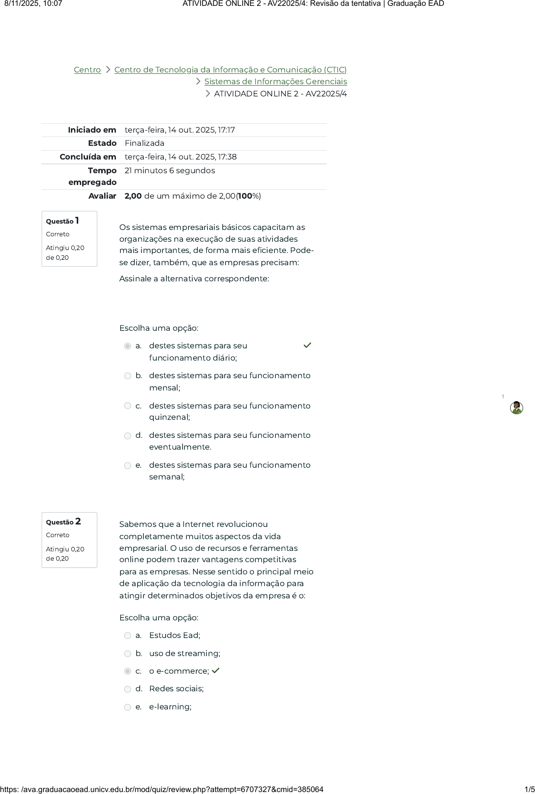Centro 〉 Centro de Tecnologia da Informação e Comunicação (CTIC) 〉 Sistemas de Informações Gerenciais 〉 ATIVIDADE ONLINE 2 - AV22025/4 Questão 1 Correto Atingiu 0,20 de 0,20 Questão 2 Correto Atingiu 0,20 de 0,20 Iniciado em terça-feira, 14 out. 2025, 17:17 Estado Finalizada Concluída em terça-feira, 14 out. 2025, 17:38 Tempo empregado 21 minutos 6 segundos Avaliar 2,00 de um máximo de 2,00(100%) Os sistemas empresariais básicos capacitam as organizações na execução de suas atividades mais importantes, de forma mais eficiente. Pode- se dizer, também, que as empresas precisam: Assinale a alternativa correspondente: Escolha uma opção: a. destes sistemas para seu funcionamento diário; ✓ b. destes sistemas para seu funcionamento mensal; c. destes sistemas para seu funcionamento quinzenal; d. destes sistemas para seu funcionamento eventualmente. e. destes sistemas para seu funcionamento semanal; Sabemos que a Internet revolucionou completamente muitos aspectos da vida empresarial. O uso de recursos e ferramentas online podem trazer vantagens competitivas para as empresas. Nesse sentido o principal meio de aplicação da tecnologia da informação para atingir determinados objetivos da empresa é o: Escolha uma opção: a. Estudos Ead; b. uso de streaming; c. o e-commerce; ✓ d. Redes sociais; e. e-learning; 1 08/11/2025, 10:07 ATIVIDADE ONLINE 2 - AV22025/4: Revisão da tentativa | Graduação EAD https://ava.graduacaoead.unicv.edu.br/mod/quiz/review.php?attempt=6707327&cmid=385064 1/5 https://ava.graduacaoead.unicv.edu.br/course/index.php?categoryid=267 https://ava.graduacaoead.unicv.edu.br/course/index.php?categoryid=269 https://ava.graduacaoead.unicv.edu.br/course/view.php?id=13562#section-9 Questão 3 Correto Atingiu 0,20 de 0,20 Questão 4 Correto Atingiu 0,20 de 0,20 A substituição de papéis e processos manuais por processos eletrônicos pode levar as empresas a economizar, e é aqui que entram os sistemas de informações, mais precisamente a internet, e suas possibilidades de uso. Essa economia são basicamente: Assinale a opção correta: Escolha uma opção: a. impostos, esforço e assessorias; b. tempo, mão de obra e suprimentos; c. Horas extras, tempo e impostos; d. tempo, esforço e dinheiro; ✓ e. Materiais de limpeza, terceirizações e bônus; Conforme expõe Lucca (2015), a expressão data mining, ou mineração de dados, surgiu na década de 1980, quando as organizações decidiram tornar útil a análise de suas grandes massas de dados, em busca de relações coerentes que pudessem identificar tendências estratégicas. Como eram analisadas as massas de dados antes da criação da Mineração de Dados? Assinale a opção correta: Escolha uma opção: a. Até então, esse grande volume de dados eram inutilizados, pois gerir as atividades operacionais era caro para a empresa. b. Até então, esse pequeno volume de dados era utilizado, momentaneamente, para gerir as atividades gerenciais. c. Até então, esse grande volume de dados era descartado, as atividades operacionais eram, no máximo, para fins de relatórios gerenciais do nível tático. d. Até então, esse grande volume de dados era utilizado, momentaneamente, para gerir as atividades operacionais e, no máximo, para fins de relatórios gerenciais do nível tático. ✓ e. Até então, esses dados eram utilizados, momentaneamente, para gerir as atividades rotineiras e, no máximo, para fins de relatórios para arquivos. 1 08/11/2025, 10:07 ATIVIDADE ONLINE 2 - AV22025/4: Revisão da tentativa | Graduação EAD https://ava.graduacaoead.unicv.edu.br/mod/quiz/review.php?attempt=6707327&cmid=385064 2/5 Questão 5 Correto Atingiu 0,20 de 0,20 Questão 6 Correto Atingiu 0,20 de 0,20 Questão 7 Correto Atingiu 0,20 de 0,20 Os sistemas básicos de negócios sistemas geralmente têm centenas a milhares de usuários, tornando-se importantes para a empresa pois fornecem dados: Assinale a alternativa correspondente: Escolha uma opção: a. Para o nível gerencial da organização. b. para o nível mais alto da empresa. c. apenas ao nível operacional da empresa; d. do nível operacional para o nível intermediário da empresa; e. do nível operacional para o nível mais alto da empresa; ✓ Considerando que os recursos nas organizações são limitados (tempo, espaço, dinheiro ou matéria-prima), a análise de correlações pode gerar ideias para otimizar a utilização de tais recursos, estamos falando do proposito da utilização de mineração de dados: Assinale a alternativa correta: Escolha uma opção: a. Desoneração. b. Identificação; c. Classificação; d. Otimização; ✓ e. Previsão; Sobre os sistemas de informação departamentais comuns, é uma atribuição do departamento de Serviço de atendimento ao cliente: Assinale a opção correta: Escolha uma opção: a. Elaboração orçamentária; b. Gerenciamento de pedidos; c. Remuneração; d. Gestão de clientes; e. Monitoramento de vendas; ✓ 1 08/11/2025, 10:07 ATIVIDADE ONLINE 2 - AV22025/4: Revisão da tentativa | Graduação EAD https://ava.graduacaoead.unicv.edu.br/mod/quiz/review.php?attempt=6707327&cmid=385064 3/5 Questão 8 Correto Atingiu 0,20 de 0,20 Questão 9 Correto Atingiu 0,20 de 0,20 A mineração de dados é um método eficiente, que possibilita a análise do comportamento do cliente, facilitando e: Assinale a opção correta: Escolha uma opção: a. fidelizando o cliente; b. Organizando o controle de filiais; c. Organizando o processo contábil. d. aliando-se ao poder de fazer projeções; ✓ e. facilitando a emissão de relatórios; Para Inmon e Hackathorn (1999), um cubo de decisão é um sistema de apoio muito útil para relacionar tabelas em um banco de dados, gerando: Assinale a opção correta: Escolha uma opção: a. relatórios, por meio de gráficos ou de planilhas, que envolvem o levantamento e o cálculo de demandas solicitados pela diretoria; b. relatórios, por meio de formulários, que envolvem