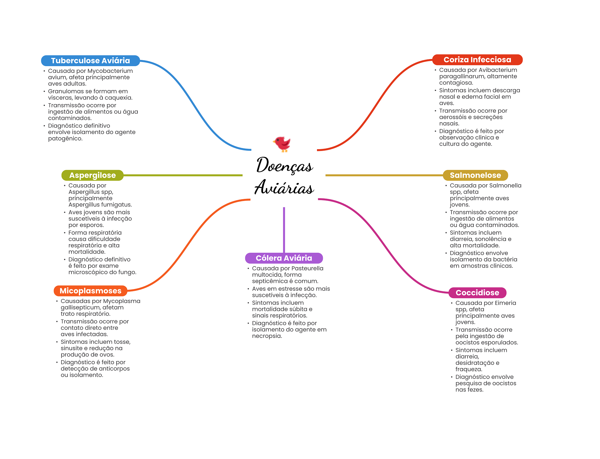 Tuberculose Aviária Coriza Infecciosa Causada por Mycobacterium Causada por Avibacterium avium, afeta principalmente paragallinarum, altamente aves adultas. contagiosa. Granulomas se formam em Sintomas incluem descarga vísceras, levando à caquexia. nasal e edema facial em Transmissão ocorre por aves. ingestão de alimentos ou água Transmissão ocorre por contaminados. aerossóis e secreções Diagnóstico definitivo nasais. envolve isolamento do agente Diagnóstico é feito por patogênico. observação clínica e cultura do agente. Doenças Aspergilose Salmonelose Causada por Aviárias Causada por Salmonella Aspergillus spp, spp, afeta principalmente principalmente aves Aspergillus fumigatus. jovens. Aves jovens são mais Transmissão ocorre por suscetíveis à infecção ingestão de alimentos por esporos. ou água contaminados. Forma respiratória Sintomas incluem causa dificuldade diarreia, sonolência e respiratória e alta alta mortalidade. mortalidade. Diagnóstico envolve Diagnóstico definitivo Cólera Aviária isolamento da bactéria é feito por exame Causada por Pasteurella em amostras clínicas. microscópico do fungo. multocida, forma septicêmica é comum. Micoplasmoses Aves em estresse são mais suscetíveis à infecção. Coccidiose Causadas por Mycoplasma Sintomas incluem Causada por Eimeria gallisepticum, afetam mortalidade súbita e spp, afeta trato respiratório. sinais respiratórios. principalmente aves Transmissão ocorre por Diagnóstico é feito por jovens. contato direto entre isolamento do agente em Transmissão ocorre aves infectadas. necropsia. pela ingestão de Sintomas incluem tosse, oocistos esporulados. sinusite e redução na Sintomas incluem produção de ovos. diarreia, Diagnóstico é feito por desidratação e detecção de anticorpos fraqueza. ou isolamento. Diagnóstico envolve pesquisa de oocistos nas fezes.