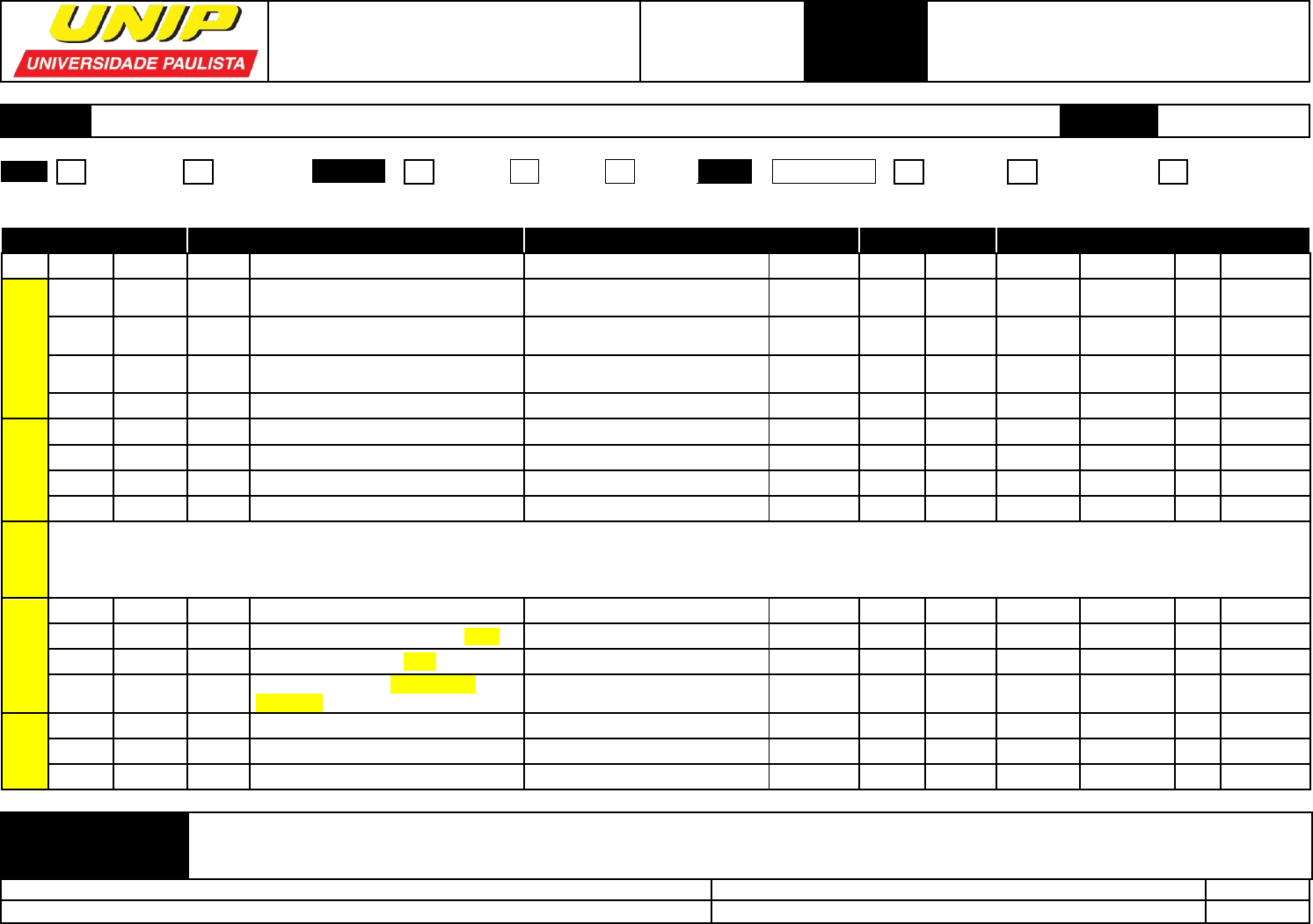 FFOORRMMUULLÁÁRRIIOO DDEE HHOORRÁÁRRIIOO CCAAMMPPUUSS BBRRAASSÍÍLLIIAA 22002244//22 TTUURRMMAASS PPSS66PP3300 –– PPSS55PP3300 // 66ºº ee 55ºº SSeemm GGrraaddee 22002222//11--22 CURSO PSICOLOGIA INÍCIO 05/08/2024 INÍCIO FEVEREIRO X AGOSTO TURNO MANHà TARDE X NOITE TIPO SEMESTRAL X NORMAL DEPENDÊNCIA ESTÁGIO HORÁRIO DISCIPLINA PROFESSOR AULA FREQUÊNCIA Dia Início Término Código Nome Nome Funcional Teórica Prática Semanal Quinzenal 1/3 Mensal SEG 18h20 19h10 D91B Psicol Organizac E do Trabalho Mônica de Oliveira Almeida Bouza 230167 X X 19h10 20h25 761R Desdobram da Teoria Psicanalit Mônica de Oliveira Almeida Bouza 230167 X X 20h45 22h00 761R Desdobram da Teoria Psicanalit Mônica de Oliveira Almeida Bouza 230167 X X TER 18h20 19h10 D105 Métodos de Pesquisa Dionísio Adárcio Ramos 760986 X X 19h10 20h25 987W Técnicas Projetivas Corina Lins Solorzano 233183 X X 20h45 22h00 987W Técnicas Projetivas Corina Lins Solorzano 233183 X X QUA Horário para atividades de ED, APS, atividades de extensão, AC e estágio de PSS. QUI 18h20 19h10 D61E Políticas Públicas E Psicolog + ED Rejane Arruda Ribeiro 082061 X X 19h10 20h25 53C6 Psicologia Escolar + APS Rejane Arruda Ribeiro 082061 X X 20h45 22h00 53C6 Psicologia Escolar + Projeto de Extensão Rejane Arruda Ribeiro 082061 X X SEX 19h10 20h25 979W Práticas Sociais e Subjetividade Ana C. F. Roque 35968 X X X 20h45 22h00 Informe eventuais junções de turmas ou outras observações Disciplinas AVAs o professor vai encaminhar aos representantes as datas de início* Nome do Coordenador(a) Nome do Diretor Data Profª Débora Adriana Birmann Pereira Ramos Prof. Antonio Adias Nogueira 05/08/2024