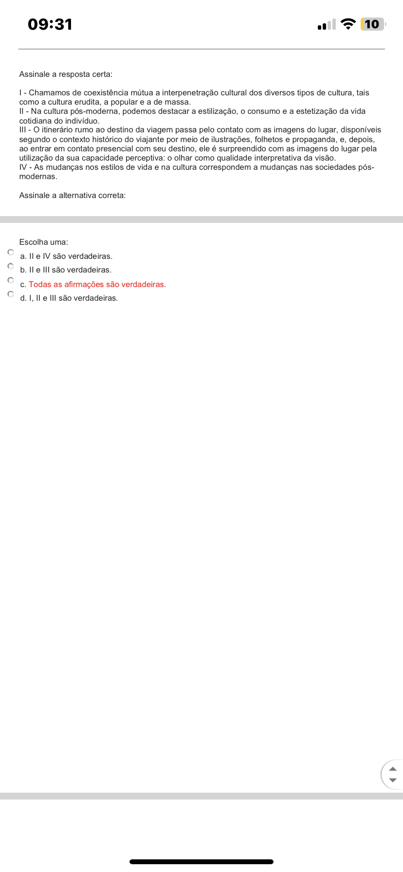 09:31 10 Assinale a resposta certa: Chamamos de coexistência mútua a interpenetração cultural dos diversos tipos de cultura, tais como a cultura erudita, a popular e a de massa. Na cultura pós-moderna, podemos destacar a estilização, consumo e a estetização da vida cotidiana do indivíduo. III itinerário rumo ao destino da viagem passa pelo contato com as imagens do lugar, disponíveis segundo contexto histórico do viajante por meio de ilustrações, folhetos e propaganda, e, depois, ao entrar em contato presencial com seu destino, ele é surpreendido com as imagens do lugar pela utilização da sua capacidade perceptiva: olhar como qualidade interpretativa da visão. IV As mudanças nos estilos de vida e na cultura correspondem a mudanças nas sociedades pós- modernas. Assinale a alternativa correta: Escolha uma: a. II e IV são verdadeiras. b. II e III são verdadeiras. C. Todas as afirmações são verdadeiras. d. I, II e III são verdadeiras.