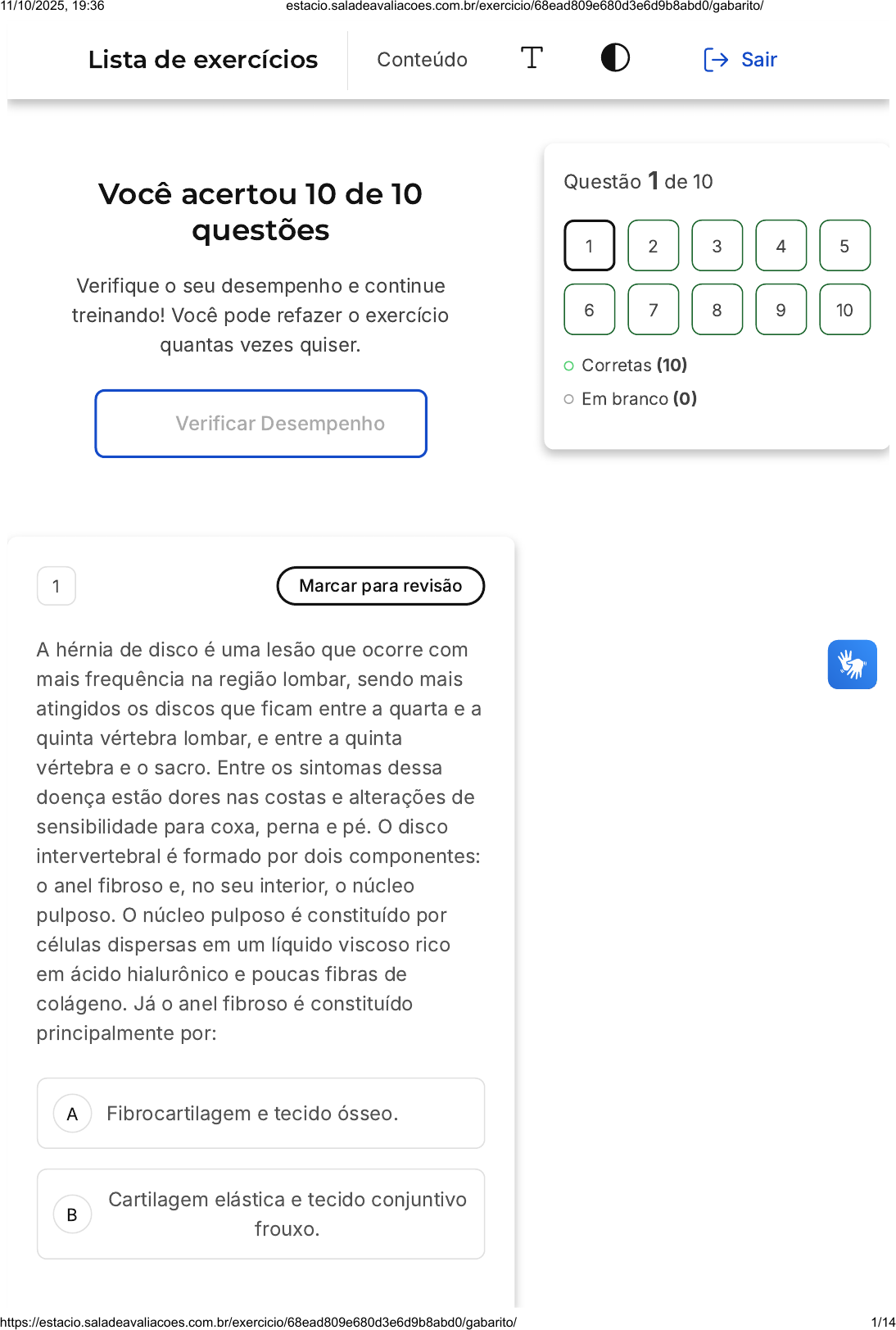 Você acertou 10 de 10 questões Verifique o seu desempenho e continue treinando! Você pode refazer o exercício quantas vezes quiser. Verificar Desempenho A B 1 Marcar para revisão A hérnia de disco é uma lesão que ocorre com mais frequência na região lombar, sendo mais atingidos os discos que ficam entre a quarta e a quinta vértebra lombar, e entre a quinta vértebra e o sacro. Entre os sintomas dessa doença estão dores nas costas e alterações de sensibilidade para coxa, perna e pé. O disco intervertebral é formado por dois componentes: o anel fibroso e, no seu interior, o núcleo pulposo. O núcleo pulposo é constituído por células dispersas em um líquido viscoso rico em ácido hialurônico e poucas fibras de colágeno. Já o anel fibroso é constituído principalmente por: Fibrocartilagem e tecido ósseo. Cartilagem elástica e tecido conjuntivo frouxo. Questão 1 de 10 Corretas (10) Em branco (0) 1 2 3 4 5 6 7 8 9 10 Lista de exercícios Conteúdo Sair 11/10/2025, 19:36 estacio.saladeavaliacoes.com.br/exercicio/68ead809e680d3e6d9b8abd0/gabarito/ https://estacio.saladeavaliacoes.com.br/exercicio/68ead809e680d3e6d9b8abd0/gabarito/ 1/14 C D E Tecido conjuntivo denso e cartilagem hialina. Tecido conjuntivo denso e fibrocartilagem. Cartilagem hialina e tecido ósseo. Resposta correta Parabéns, você selecionou a alternativa correta. Confira o gabarito comentado! Gabarito Comentado O anel fibroso é constituído principalmente por tecido conjuntivo denso e fibrocartilagem, pois é uma estrutura que precisa ser resistente e flexível ao mesmo tempo. O tecido conjuntivo denso é formado por fibras de colágeno, que são muito resistentes, enquanto a fibrocartilagem é um tipo de cartilagem que é mais flexível que a cartilagem hialina. 2 Marcar para revisão O tecido muscular representa um dos quatro tipos de tecido do corpo e é responsável pelo movimento do corpo como um todo e pelas mudanças no tamanho e formato dos órgãos internos. A seguir, são listadas algumas características da contração muscular. Assinale a alternativa que apresenta uma característica correta do processo de contração muscular. 11/10/2025, 19:36 estacio.saladeavaliacoes.com.br/exercicio/68ead809e680d3e6d9b8abd0/gabarito/ https://estacio.saladeavaliacoes.com.br/exercicio/68ead809e680d3e6d9b8abd0/gabarito/ 2/14 A B C D E O sistema de túbulos transversais garante que a contração muscular se dê de maneira uniforme por todo o músculo. Durante a contração do músculo estriado, as miofibrilas se encurtam e causam o encurtamento de todo o sarcômero. Quando a fibra do nervo motor recebe um impulso nervoso, seu terminal axônico libera norepinefrina que se associa a receptores do sarcolema. A contração tem fim quando a membrana do retículo transfere os íons de cálcio para o interior das suas cisternas, em um processo passivo. No músculo liso, com o estímulo do sistema nervoso autônomo, os íons de cálcio migram do retículo sarcoplasmático para o sarcoplasma. Resposta correta Parabéns, você selecionou a alternativa correta. Confira o gabarito comentado! Gabarito Comentado O sistema de túbulos transversais garante que a contração muscular se dê de maneira uniforme por todo o músculo. Isso ocorre porque os túbulos transversais, também conhecidos como túbulos T, são extensões da membrana plasmática 11/10/2025, 19:36 estacio.saladeavaliacoes.com.br/exercicio/68ead809e680d3e6d9b8abd0/gabarito/ https://estacio.saladeavaliacoes.com.br/exercicio/68ead809e680d3e6d9b8abd0/gabarito/ 3/14 A B C D E (sarcolema) que penetram o interior da fibra muscular, permitindo que o potencial de ação se propague rapidamente para todas as partes da fibra. Assim, garantem que a contração muscular seja simultânea em todas as partes do músculo, proporcionando uma contração uniforme. 3 Marcar para revisão O desenvolvimento e a reparação óssea são processos complexos que envolvem a formação de novo tecido ósseo. Existem dois processos principais de ossificação responsáveis pela formação óssea durante o desenvolvimento embrionário e a cicatrização de fraturas. Qual dos seguintes processos descreve a formação óssea que ocorre diretamente dentro de uma membrana conjuntiva, sem um modelo cartilaginoso prévio? Ossificação endocondral. Ossificação intramembranosa. Ossificação perióstea. Ossificação condrogênica. Ossificação sinovial. Resposta correta 11/10/2025, 19:36 estacio.saladeavaliacoes.com.br/exercicio/68ead809e680d3e6d9b8abd0/gabarito/ https://estacio.saladeavaliacoes.com.br/exercicio/68ead809e680d3e6d9b8abd0/gabarito/ 4/14 Parabéns, você selecionou a alternativa correta. Confira o gabarito comentado! Gabarito Comentado A ossificação intramembranosa é o processo pelo qual o tecido ósseo se forma diretamente dentro de membranas de tecido conjuntivo, sem a necessidade de um modelo cartilaginoso prévio. Esse processo é típico na formação de ossos planos do crânio. 4 Marcar para revisão ''O tecido cartilaginoso é uma forma especializada de tecido conjuntivo de consistência rígida. Desempenha a função de suporte de tecidos moles, reveste superfícies articulares, absorvendo choques, e facilita o deslizamento dos ossos na articulação. A cartilagem é essencial para a formação e o crescimento do osso longo, na vida intrauterina e depois do nascimento.¿ (adaptado de Histologia Interativa, Universidade Federal de Alfenas. Disponível em: . Acesso em 22/04/2021. Sobre o crescimento e processo de reparo da cartilagem, analise as afirmativas a seguir: I. Uma vez danificada, a capacidade de cicatrização da cartilagem é quase nula, mesmo em casos de lesões leves. II. A expressão do fator de crescimento SOX-9 induz a diferenciação das células mesenquimais em condroblastos. 11/10/2025, 19:36 estacio.saladeavaliacoes.com.br/exercicio/68ead809e680d3e6d9b8abd0/gabarito/ https://estacio.saladeavaliacoes.com.br/exercicio/68ead809e680d3e6d9b8abd0