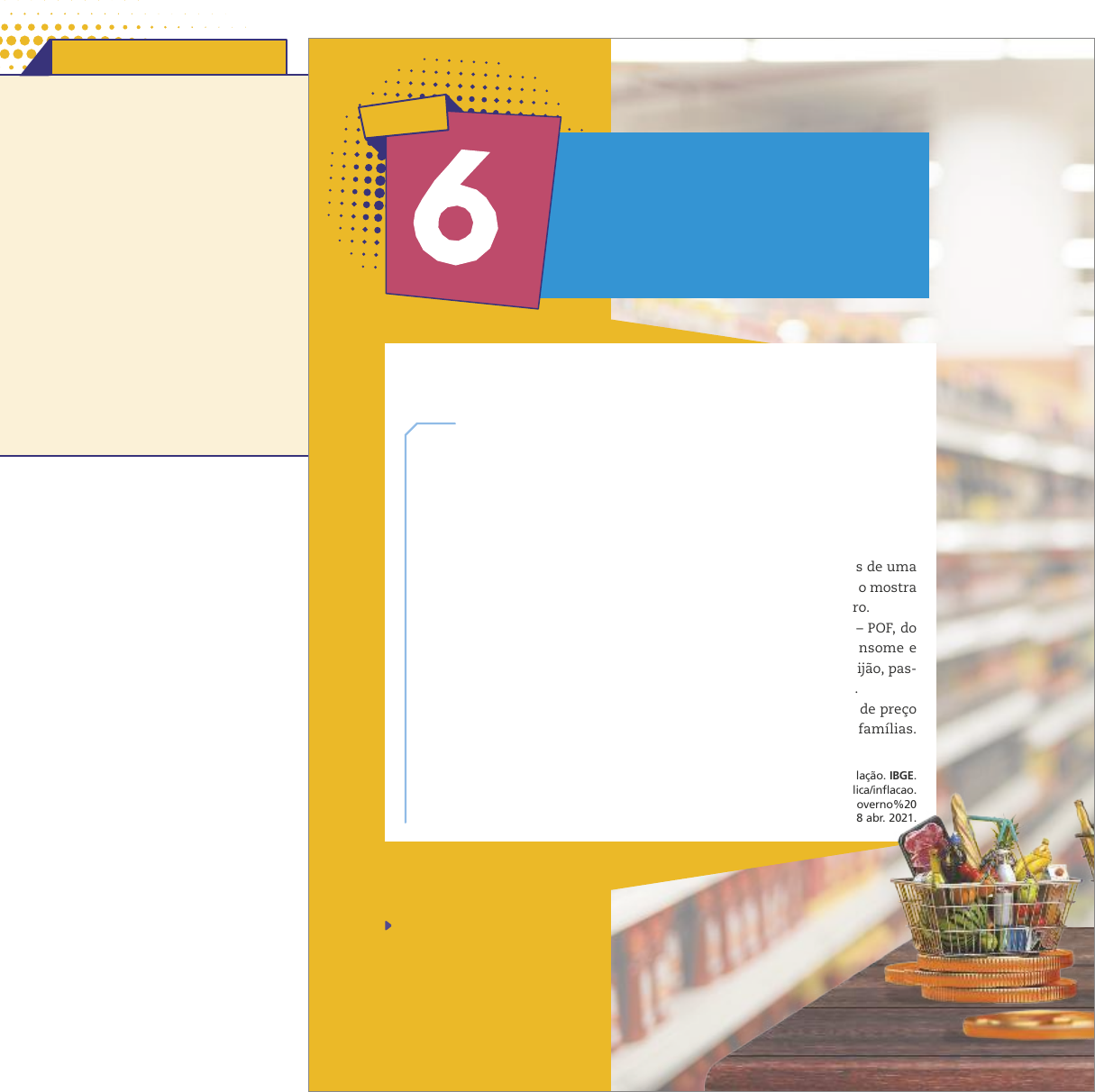 INTRODUÇÃO À UNIDADE Esta Unidade está organizada em quatro capítulos e apresenta os conteúdos por meio de exemplos e atividades diversificadas, além de seções que propiciam momentos que possibilitam o desenvolvimento das competências gerais 1, 4 e 7. No primeiro capítulo, é reto- mado o cálculo de porcentagem com ênfase nos percentuais sucessi- vos favorecendo o desenvolvimento da habilidade EF09MA05. No segundo capítulo, aborda-se o estudo da probabilidade de eventos independentes e dependentes, o que favorece o desenvolvimento da habilidade EF09MA20. No terceiro capítulo, o objetivo é discutir as principais caracterís- ticas de cada tipo de gráfico, bem como determinar o gráfico mais adequado para representar um conjunto de dados, colabo- rando para o desenvolvimento das habilidades EF09MA21 e EF09MA22. No quarto capítulo, são abordados os passos de uma pesquisa estatística, com foco na realização de pesquisas amostrais, favorecendo o desenvolvimento da habilidade EF09MA23. OBJETIVOS • Compreender e resolver problemas que en- volvam porcentagem. • Compreender e diferenciar o regime de juro simples e de juro composto. • Resolver problemas envolvendo juro simples e juro composto. • Utilizar tecnologias digitais para resolver pro- blemas envolvendo percentuais e juros. • Reconhecer e calcular a probabilidade de even- tos aleatórios dependentes. • Identificar elementos que podem induzir a erros de leitura em gráficos. • Construir o gráfico mais adequado para re- presentar um conjunto de dados. • Planejar, realizar pesquisas e comunicar os re- sultados por meio de relatório. BNCC NA UNIDADE Competências gerais: • 1, 2, 4, 5, 7, 9 e 10 Competências específicas: • 2, 4, 5, 7 e 8 Habilidades: Números • EF09MA05 Probabilidade e estatística • EF09MA20 • EF09MA21 • EF09MA22 • EF09MA23 Temas Contemporâneos Transversais: • Educação Ambiental • Educação Financeira • Processo de envelhecimento, respeito e valorização do Idoso Você sabe o que é inflação? Leia o texto a seguir. [...] Inflação é o nome dado ao aumento dos preços de produtos e ser- viços. Ela é calculada pelos índices de preços, comumente chamados de índices de inflação. O IBGE produz dois dos mais importantes índices de preços: o IPCA, considerado o oficial pelo governo federal, e o INPC. [...] O propósito de ambos é o mesmo: medir a variação de preços de uma cesta de produtos e serviços consumida pela população. O resultado mostra se os preços aumentaram ou diminuíram de um mês para o outro. A cesta é definida pela Pesquisa de Orçamentos Familiares – POF, do IBGE, que, entre outras questões, verifica o que a população consome e quanto do rendimento familiar é gasto em cada produto: arroz, feijão, pas- sagem de ônibus, material escolar, médico, cinema, entre outros. Os índices, portanto, levam em conta não apenas a variação de preço de cada item, mas também o peso que ele tem no orçamento das famílias. […] INSTITUTO BRASILEIRO DE GEOGRAFIA E ESTATÍSTICA. Inflação. IBGE. Rio de Janeiro, c2022. Disponível em: https://www.ibge.gov.br/explica/inflacao. php#:~:text=Infla%C3%A7%C3%A3o%20%C3%A9%20o%20nome%20dado,governo%20 federal%2C%20e%20o%20INPC. Acesso em: 8 abr. 2021. UNIDADE PORCENTAGEM, PROBABILIDADE E ESTATÍSTICA6 A imagem de uma cesta de compras sobre uma pilha de moedas cada vez maior representa que o valor dessa mesma cesta pode variar em virtude da inflação. NVS MY WORLD/SHUTTERSTOCK.COM, M AXX-STUDIO/ SHUTTERSTOCK.COM, BB DESIGN STOCK/SHUTTERSTOCK.COM 176 D2-MAT-F2-2103-V9-U6-176-203-LA-G24_AV3.indd 176D2-MAT-F2-2103-V9-U6-176-203-LA-G24_AV3.indd 176 27/06/22 11:4127/06/22 11:41 176 D2_AV2-MAT-F2-2103-V9-U6-176-203-MPE-G24.indd 176D2_AV2-MAT-F2-2103-V9-U6-176-203-MPE-G24.indd 176 06/09/22 18:2006/09/22 18:20 ORIENTAÇÕES DIDÁTICAS Abertura de Unidade A abertura explora o conceito de inflação e o Índice de Preços ao Consumidor Amplo (IPCA). Verificar se os estudantes possuem algum conhecimento a respeito da inflação e como podemos utilizá-la para obter informações da evolução de preços dos mais diversos produtos. Ao iniciar a Unidade, fazer uma retomada sobre porcentagens e suas aplicações. Se possível, acessar o site https:// www3.bcb.gov.br/CALCIDADAO /publico/corrigirPorIndice.do? method=corrigirPorIndice (acesso em: 2 fev. 2022) e explicar aos estudantes como utilizar a ferra- menta “Calculadora de inflação”. Selecione o IPCA fornecido pelo IBGE e faça simulações com perí- odos a partir de 2010 para que os estudantes possam comparar valores e dialogar sobre experiências financeiras. De preferência, no campo “Valor a ser corrigido”, digitar números múltiplos de 100 para esse primeiro momento. JUSTIFICATIVAS DOS OBJETIVOS Nesta Unidade, os conteúdos trabalhados nos capítulos possibilitam o desenvolvimento das habilidades EF09MA05, EF09MA20, EF09MA21, EF09MA22 e EF09MA23. No boxe Fórum, o objetivo é promover a reflexão e um debate sobre as fakes news e como os dados estatísticos podem ser manipulados para produção de informações falsas ou que induzem ao erro de inter- pretação, favorecendo o desenvolvimento da competência geral 2 e da competência específica 4 da área de Matemática. Na seção Por toda parte, os estudantes são convidados a realizar a leitura de uma pirâmide etária, bem como fazer uma pesquisa sobre a qualidade de vida dos idosos próximos a eles, contribuindo para o desenvolvimento do Tema Contemporâneo Transversal Processo de envelhecimento, respeito e valorização do Idoso, bem como da competência geral 10 e da competência específica 7 da área de Matemática. No gráfico a seguir, foram apresentados os percentuais do IPCA acumulado em 2021. IPCA acumulado em 2021 Elaborado com base em: INSTITUTO BRASILEIRO DE GEOGRAFIA E ESTATÍSTICA. Sistema Nacional de Índices de Preços ao Consumidor – IPCA e INPC. Indicadores IBGE,