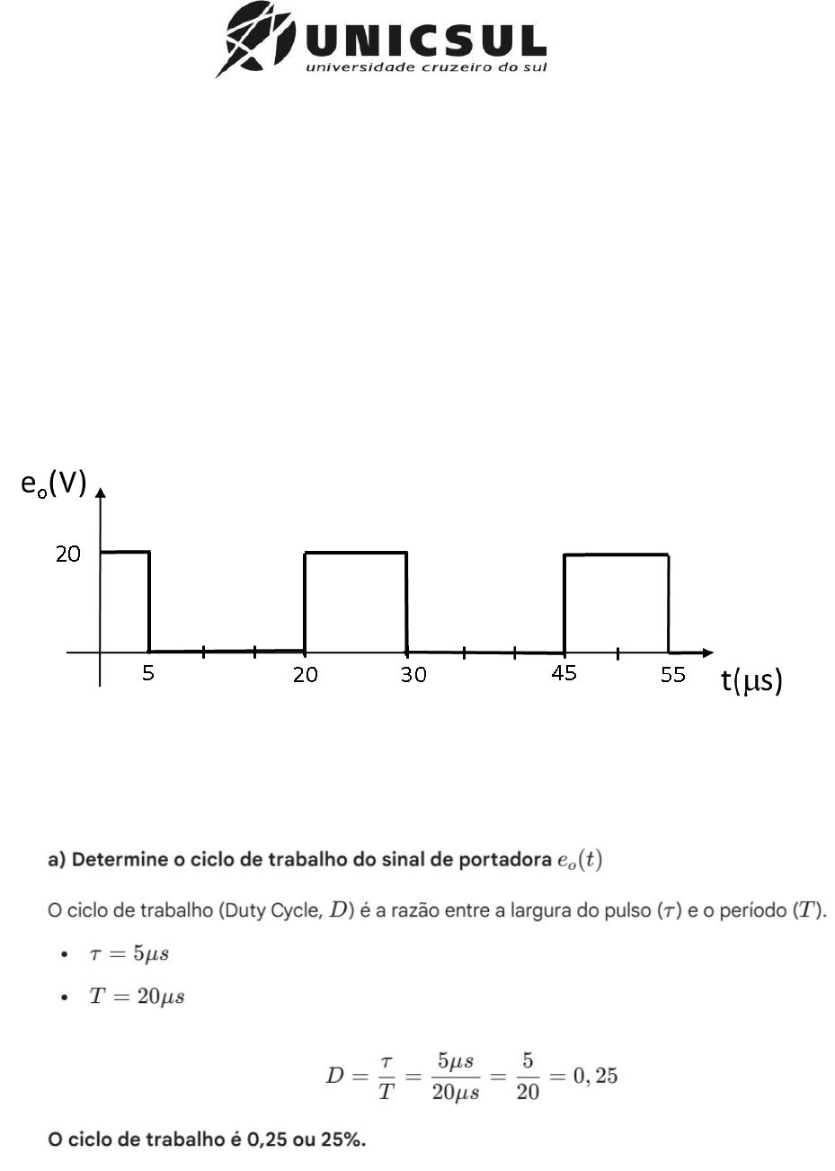 Curso: Engenharia Elétrica Data: 05/11/2025 Prof.: Cláudio Domienikan 2ª ATIVIDADE REMOTA DE PRINCÍPIOS DA COMUNICAÇÃO APLICADA O sinal da figura abaixo é utilizado como portadora para um modulador PAM. O sinal modulante é uma cossenóide de 500 Hz e 2 Vpp, somada a um nível CC de + 4 V. A constante de modulação K é de 0,2 V-1. Nessas condições: a) Determine o ciclo de trabalho do sinal de portadora eo(t); b) Determine o fator de atenuação para n=1, n=2, n=3, n=4 e n=5; c) Apresente a Série de Fourier do sinal eo(t) até o quinto elemento harmônico; d) Apresente a Série de Fourier do sinal modulado ePAM(t) até o quinto elemento harmônico; e) Desenhe o espectro de amplitudes do sinal ePAM(t); image6.png image7.png image8.png image9.png image1.jpg image2.png image3.png image4.png image5.png