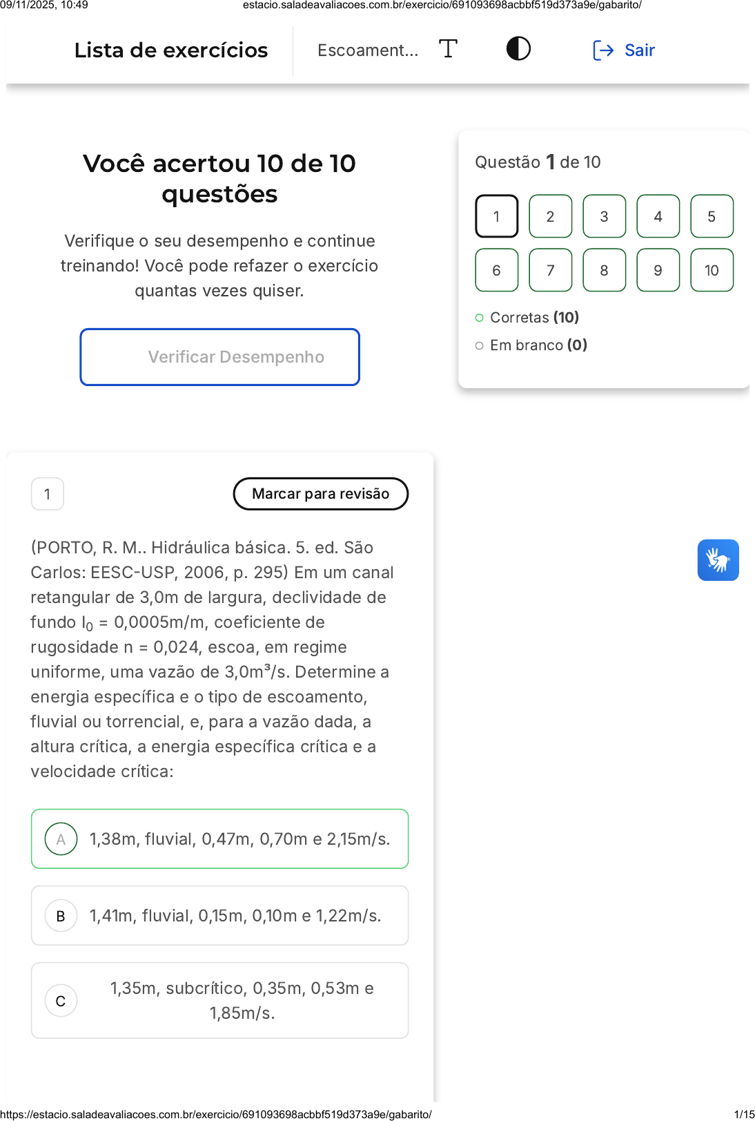 Você acertou 10 de 10 questões Verifique o seu desempenho e continue treinando! Você pode refazer o exercício quantas vezes quiser. Verificar Desempenho A B C 1 Marcar para revisão (PORTO, R. M.. Hidráulica básica. 5. ed. São Carlos: EESC-USP, 2006, p. 295) Em um canal retangular de 3,0m de largura, declividade de fundo I = 0,0005m/m, coeficiente de rugosidade n = 0,024, escoa, em regime uniforme, uma vazão de 3,0m³/s. Determine a energia específica e o tipo de escoamento, fluvial ou torrencial, e, para a vazão dada, a altura crítica, a energia específica crítica e a velocidade crítica: 0 1,38m, fluvial, 0,47m, 0,70m e 2,15m/s. 1,41m, fluvial, 0,15m, 0,10m e 1,22m/s. 1,35m, subcrítico, 0,35m, 0,53m e 1,85m/s. Questão 1 de 10 Corretas (10) Em branco (0) 1 2 3 4 5 6 7 8 9 10 Lista de exercícios Escoament… Sair 09/11/2025, 10:49 estacio.saladeavaliacoes.com.br/exercicio/691093698acbbf519d373a9e/gabarito/ https://estacio.saladeavaliacoes.com.br/exercicio/691093698acbbf519d373a9e/gabarito/ 1/15 D E 1,41m, subcrítico, 0,15m, 0,10m e 1,22m/s. 1,38m, subcrítico, 0,47m, 0,70m e 2,15m/s. Resposta correta Parabéns, você selecionou a alternativa correta. Confira o gabarito comentado! Gabarito Comentado A alternativa correta é a A, que indica que a energia específica é de 1,38m, o tipo de escoamento é fluvial, a altura crítica é de 0,47m, a energia específica crítica é de 0,70m e a velocidade crítica é de 2,15m/s. Esses valores são obtidos através de cálculos hidráulicos que levam em consideração a largura do canal, a declividade do fundo, o coeficiente de rugosidade e a vazão. O tipo de escoamento, fluvial ou torrencial, é determinado pela relação entre a velocidade do escoamento e a velocidade crítica. 2 Marcar para revisão (INEA - Engenheiro Hidráulico - 2008) Um canal de seção constante e declividade do fundo do canal (I) muito pequena, escoando em regime permanente e uniforme, apresentará uma perda de carga total entre duas seções distantes de L. Essa perda de carga pode ser calculada? 09/11/2025, 10:49 estacio.saladeavaliacoes.com.br/exercicio/691093698acbbf519d373a9e/gabarito/ https://estacio.saladeavaliacoes.com.br/exercicio/691093698acbbf519d373a9e/gabarito/ 2/15 A B C D E Sim, por I. Sim, por I x L. Sim, por I/L. Sim, por I^2 /2g. Não, esses dados são insuficientes; é necessário conhecer a linha de energia do escoamento. Resposta correta Parabéns, você selecionou a alternativa correta. Confira o gabarito comentado! Gabarito Comentado A alternativa correta é "Sim, por I x L". Isso ocorre porque, em um canal de seção constante e declividade do fundo do canal (I) muito pequena, escoando em regime permanente e uniforme, a perda de carga total entre duas seções distantes de L é calculada multiplicando a declividade do fundo do canal (I) pela distância entre as duas seções (L). Portanto, a perda de carga pode ser calculada por I x L. 3 Marcar para revisão 09/11/2025, 10:49 estacio.saladeavaliacoes.com.br/exercicio/691093698acbbf519d373a9e/gabarito/ https://estacio.saladeavaliacoes.com.br/exercicio/691093698acbbf519d373a9e/gabarito/ 3/15 A B C (Prefeitura de Palhoça/SC - Engenheiro Civil - 2019) O ressalto hidráulico ou salto hidráulico é o fenômeno que ocorre na transição de um escoamento torrencial ou supercrítico para um escoamento fluvial ou subcrítico. A respeito do ressalto hidráulico, analise as afirmações e assinale a alternativa incorreta: O aspecto físico do ressalto hidráulico varia de acordo com a velocidade na seção de montante, o que torna desnecessária a utilização do número de Froude. O ressalto hidráulico é, principalmente, utilizado como dissipador de energia cinética de uma lâmina líquida que desce pelo paramento de um vertedor, evitando o aparecimento de um processo erosivo no leito do canal de restituição. O escoamento do ressalto hidráulico é caracterizado por uma elevação brusca no nível d'água, sobre uma distância curta, acompanhada de uma instabilidade na superfície com ondulações e entrada de ar do ambiente, adicionada por uma consequente perda de energia em forma de grande turbulência. 09/11/2025, 10:49 estacio.saladeavaliacoes.com.br/exercicio/691093698acbbf519d373a9e/gabarito/ https://estacio.saladeavaliacoes.com.br/exercicio/691093698acbbf519d373a9e/gabarito/ 4/15 D E O ressalto hidráulico pode ser encontrado em estações de tratamento de água, como, por exemplo, na calha Parshall, com o propósito de promover uma boa mistura de produtos químicos para tratamento. O aspecto físico do ressalto hidráulico varia de acordo diretamente proporcional com o diâmetro da seção de montante, tornando desnecessária a utilização do número de Froude. Resposta correta Parabéns, você selecionou a alternativa correta. Confira o gabarito comentado! Gabarito Comentado A alternativa A está incorreta. O aspecto físico do ressalto hidráulico, de fato, varia de acordo com a velocidade na seção de montante, porém, a utilização do número de Froude é essencial para a análise desse fenômeno. O número de Froude é uma medida adimensional importante na hidrodinâmica, pois é utilizado para determinar o tipo de escoamento (subcrítico ou supercrítico). Portanto, sua utilização é necessária para a correta análise e compreensão do ressalto hidráulico. 4 Marcar para revisão 09/11/2025, 10:49 estacio.saladeavaliacoes.com.br/exercicio/691093698acbbf519d373a9e/gabarito/ https://estacio.saladeavaliacoes.com.br/exercicio/691093698acbbf519d373a9e/gabarito/ 5/15 A B C D E (PORTO, R. M.. Hidráulica básica. 5. ed. São Carlos: EESC-USP, 2006, p. 316) Um canal circular de raio R escoa uma determinada vazão com uma altura d'água correspondente à meia seção, e o regime é crítico. Determine a relação y /E :c c 0,718 1,393 0,241 0,560 0,389 Resposta correta Parabéns, você selecionou a alternativa correta. Confira o gabarito comentado! Gabarito Comentado A ques