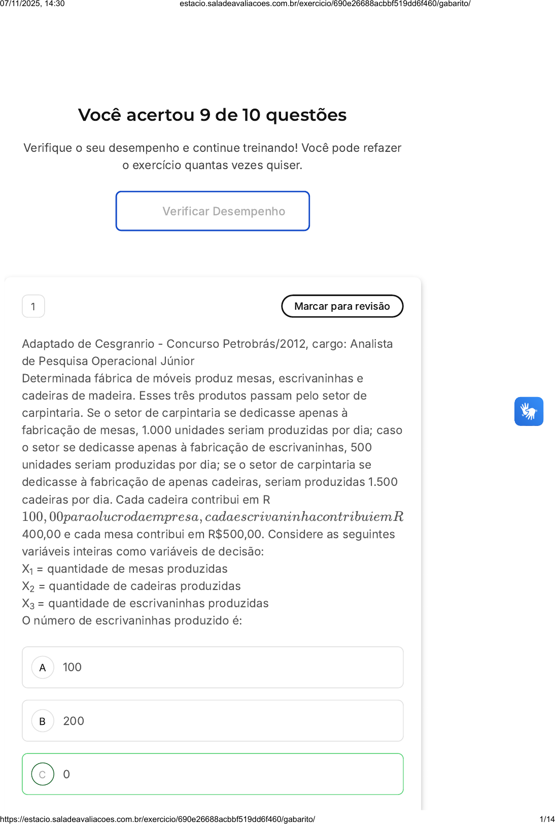 Você acertou 9 de 10 questões Verifique o seu desempenho e continue treinando! Você pode refazer o exercício quantas vezes quiser. Verificar Desempenho A B C 1 Marcar para revisão Adaptado de Cesgranrio - Concurso Petrobrás/2012, cargo: Analista de Pesquisa Operacional Júnior Determinada fábrica de móveis produz mesas, escrivaninhas e cadeiras de madeira. Esses três produtos passam pelo setor de carpintaria. Se o setor de carpintaria se dedicasse apenas à fabricação de mesas, 1.000 unidades seriam produzidas por dia; caso o setor se dedicasse apenas à fabricação de escrivaninhas, 500 unidades seriam produzidas por dia; se o setor de carpintaria se dedicasse à fabricação de apenas cadeiras, seriam produzidas 1.500 cadeiras por dia. Cada cadeira contribui em R 400,00 e cada mesa contribui em R$500,00. Considere as seguintes variáveis inteiras como variáveis de decisão: X = quantidade de mesas produzidas X = quantidade de cadeiras produzidas X = quantidade de escrivaninhas produzidas O número de escrivaninhas produzido é: 100, 00paraolucrodaempresa, cadaescrivaninhacontribuiemR 1 2 3 100 200 0 07/11/2025, 14:30 estacio.saladeavaliacoes.com.br/exercicio/690e26688acbbf519dd6f460/gabarito/ https://estacio.saladeavaliacoes.com.br/exercicio/690e26688acbbf519dd6f460/gabarito/ 1/14 D E 300 400 Resposta correta Parabéns, você selecionou a alternativa correta. Confira o gabarito comentado! Gabarito Comentado 2 Marcar para revisão Cesgranrio - Concurso Petrobrás/2012, cargo: Analista de Pesquisa Operacional Júnior Uma determinada fábrica de móveis produz mesas, escrivaninhas e cadeiras de madeira. Esses três produtos passam pelo setor de carpintaria. Se o setor de carpintaria se dedicasse apenas à fabricação de mesas, 1.000 unidades seriam produzidas por dia; caso o setor se dedicasse apenas à fabricação de escrivaninhas, 500 unidades seriam produzidas por dia; se o setor de carpintaria se dedicasse à fabricação de apenas cadeiras, seriam produzidas 1.500 cadeiras por dia. Cada cadeira contribui em R 400,00 e cada mesa contribui em R$500,00. Considere as seguintes variáveis inteiras como variáveis de decisão: X = quantidade de mesas produzidas X = quantidade de cadeiras produzidas X = quantidade de escrivaninhas produzidas 100, 00paraolucrodaempresa, cadaescrivaninhacontribuiemR 1 2 3 07/11/2025, 14:30 estacio.saladeavaliacoes.com.br/exercicio/690e26688acbbf519dd6f460/gabarito/ https://estacio.saladeavaliacoes.com.br/exercicio/690e26688acbbf519dd6f460/gabarito/ 2/14 A B C D E A(s) inequação(ões) que representa(m) a restrição de capacidade do setor de carpintaria é(são): X ≤ 1000, X ≤ 1500, X ≤ 5001 2 3 500≤ X ≤ 1000, 100 ≤X ≤ 1500, 400 X ≤ 5001 2 3 X + X + X ≤ 30001 2 3 3X + 6X + 2X ≤ 30001 2 3 3X + 2X + 6X ≤ 30001 2 3 Resposta correta Parabéns, você selecionou a alternativa correta. Confira o gabarito comentado! Gabarito Comentado A capacidade do setor de carpintaria deve ser considerada como um todo, e não individualmente para cada produto. Portanto, existe uma inequação que representa a capacidade máxima do mix de produção. Conhecemos as seguintes restrições: X ≤ 1000, X ≤ 1500, X ≤ 500 Com base nisso, podemos formular a seguinte inequação: 1,5X + X + 3X ≤ 1.500 Que também pode ser reescrita como: 3X + 2X + 6X ≤ 3.000 Portanto, a alternativa correta é a que apresenta a inequação 3X + 2X + 6X ≤ 3.000 que representa a restrição de capacidade do setor de carpintaria considerando a produção total de mesas, cadeiras e escrivaninhas. 1 2 3 1 2 3 1 2 3 1 2 3 07/11/2025, 14:30 estacio.saladeavaliacoes.com.br/exercicio/690e26688acbbf519dd6f460/gabarito/ https://estacio.saladeavaliacoes.com.br/exercicio/690e26688acbbf519dd6f460/gabarito/ 3/14 A B C D E 3 Marcar para revisão Adaptado de Cesgranrio - Concurso Petrobrás/2012, cargo: Analista de Pesquisa Operacional Júnior Determinada fábrica de móveis produz mesas, escrivaninhas e cadeiras de madeira. Esses três produtos passam pelo setor de carpintaria. Se o setor de carpintaria se dedicasse apenas à fabricação de mesas, 1.000 unidades seriam produzidas por dia; caso o setor se dedicasse apenas à fabricação de escrivaninhas, 500 unidades seriam produzidas por dia; se o setor de carpintaria se dedicasse à fabricação de apenas cadeiras, seriam produzidas 1.500 cadeiras por dia. Cada cadeira contribui em R 400,00 e cada mesa contribui em R$500,00. Considere as seguintes variáveis inteiras como variáveis de decisão: X = quantidade de mesas produzidas X = quantidade de cadeiras produzidas X = quantidade de escrivaninhas produzidas O número de mesas produzidas é: 100, 00paraolucrodaempresa, cadaescrivaninhacontribuiemR 1 2 3 2000 3000 1000 100 0 Resposta correta Parabéns, você selecionou a alternativa correta. Confira o gabarito comentado! Gabarito Comentado 07/11/2025, 14:30 estacio.saladeavaliacoes.com.br/exercicio/690e26688acbbf519dd6f460/gabarito/ https://estacio.saladeavaliacoes.com.br/exercicio/690e26688acbbf519dd6f460/gabarito/ 4/14 A B C 4 Marcar para revisão Adaptado de Goldbarg e Luna (2005, p. 36) A Tabela a seguir apresenta a proporção de cada material na mistura para a obtenção das ligas passíveis de fabricação por uma metalúrgica que deseja maximizar sua receita bruta. O preço está cotado em reais por tonelada da liga fabricada. Também em toneladas estão expressas as restrições de disponibilidade de matéria-prima. A variável de decisão para a modelagem deste problema é x , que indica a quantidade em toneladas produzidas da liga especial de baixa resistência (i = 1) e da especial de alta resistência (i = 2). Assim, para a solução ótima deste problema, a produção de ligas especiais de baixa resistência pela metalúrgica deve ser de: i 1,4 11,4 20 07/11/2025, 14:30 estacio.saladeavaliacoes.com.br/exercicio/690e26688acbbf519dd6f460/gabarito/ https://estacio.saladeavaliacoes.com.br/exercicio/690e26688acbb