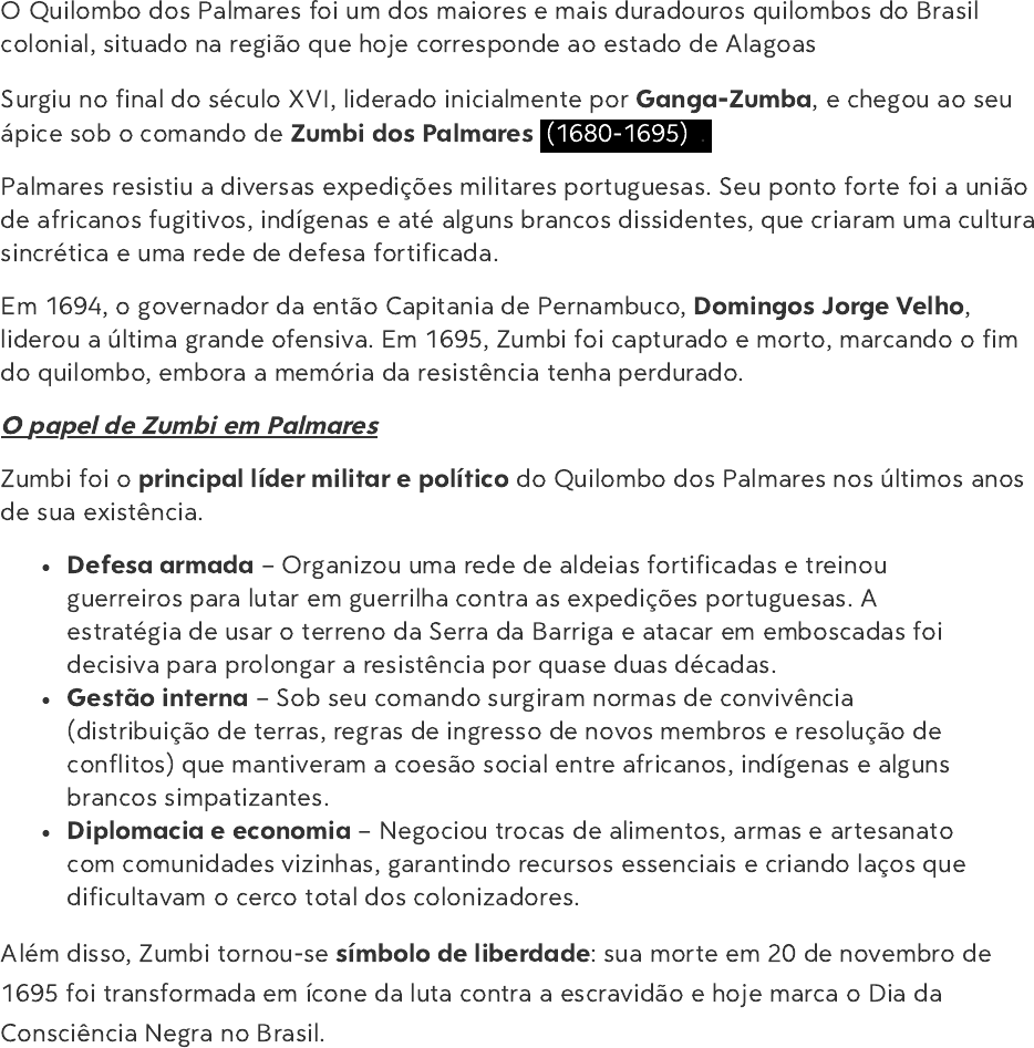 O Quilombo dos Palmares foi um dos maiores e mais duradouros quilombos do Brasil colonial, situado na região que hoje corresponde ao estado de Alagoas Surgiu no final do século XVI, liderado inicialmente por Ganga‑Zumba, e chegou ao seu ápice sob o comando de Zumbi dos Palmares (1680‑1695) . Palmares resistiu a diversas expedições militares portuguesas. Seu ponto forte foi a união de africanos fugitivos, indígenas e até alguns brancos dissidentes, que criaram uma cultura sincrética e uma rede de defesa fortificada. Em 1694, o governador da então Capitania de Pernambuco, Domingos Jorge Velho, liderou a última grande ofensiva. Em 1695, Zumbi foi capturado e morto, marcando o fim do quilombo, embora a memória da resistência tenha perdurado. O papel de Zumbi em Palmares Zumbi foi o principal líder militar e político do Quilombo dos Palmares nos últimos anos de sua existência. Defesa armada – Organizou uma rede de aldeias fortificadas e treinou guerreiros para lutar em guerrilha contra as expedições portuguesas. A estratégia de usar o terreno da Serra da Barriga e atacar em emboscadas foi decisiva para prolongar a resistência por quase duas décadas. Gestão interna – Sob seu comando surgiram normas de convivência (distribuição de terras, regras de ingresso de novos membros e resolução de conflitos) que mantiveram a coesão social entre africanos, indígenas e alguns brancos simpatizantes. Diplomacia e economia – Negociou trocas de alimentos, armas e artesanato com comunidades vizinhas, garantindo recursos essenciais e criando laços que dificultavam o cerco total dos colonizadores. Além disso, Zumbi tornou‑se símbolo de liberdade: sua morte em 20 de novembro de 1695 foi transformada em ícone da luta contra a escravidão e hoje marca o Dia da Consciência Negra no Brasil.