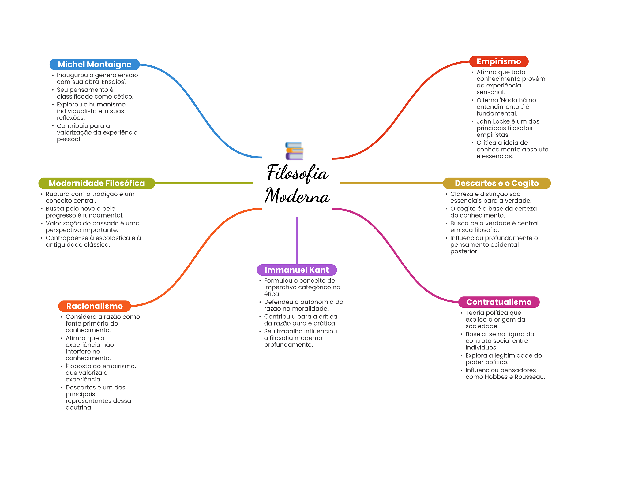 Michel Montaigne Empirismo Inaugurou gênero ensaio Afirma que todo com sua obra 'Ensaios'. conhecimento provém da experiência Seu pensamento é sensorial. classificado como cético. lema 'Nada há no Explorou humanismo entendimento..' é individualista em suas fundamental. reflexões. John Locke é um dos Contribuiu para a principais filósofos valorização da experiência empiristas. pessoal. Critica a ideia de conhecimento absoluto e essências. Filosofia Modernidade Filosófica Descartes e Cogito Ruptura com a tradição é um Moderna Clareza e distinção são conceito central. essenciais para a verdade. Busca pelo novo e pelo cogito é a base da certeza progresso é fundamental. do conhecimento. Valorização do passado é uma Busca pela verdade é central perspectiva importante. em sua filosofia. Contrapõe-se à escolástica e à Influenciou profundamente antiguidade clássica. pensamento ocidental posterior. Immanuel Kant Formulou conceito de imperativo categórico na ética. Defendeu a autonomia da Racionalismo Contratualismo razão na moralidade. Teoria política que Considera a razão como Contribuiu para a crítica explica a origem da fonte primária do da razão pura e prática. sociedade. conhecimento. Seu trabalho influenciou a filosofia moderna Baseia-se na figura do Afirma que a contrato social entre experiência não profundamente. indivíduos. interfere no conhecimento. Explora a legitimidade do É oposto ao empirismo, poder político. que valoriza a Influenciou pensadores experiência. como Hobbes e Rousseau. Descartes é um dos principais representantes dessa doutrina.