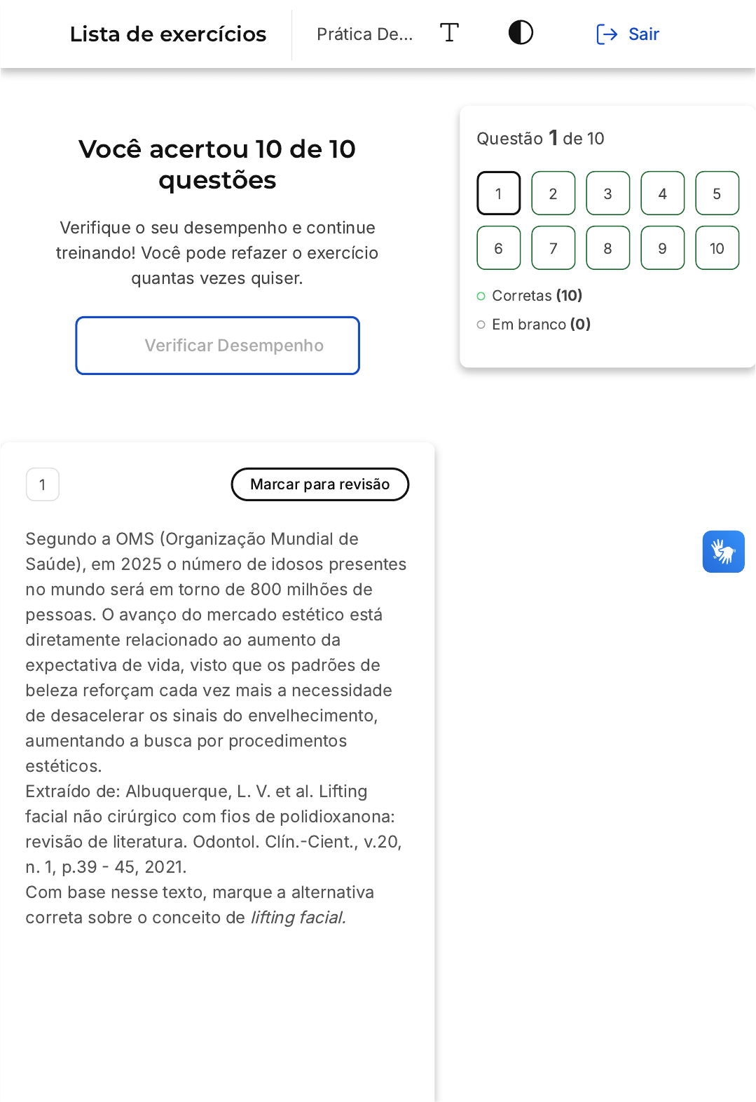 Você acertou 10 de 10 questões Verifique o seu desempenho e continue treinando! Você pode refazer o exercício quantas vezes quiser. Verificar Desempenho 1 Marcar para revisão Segundo a OMS (Organização Mundial de Saúde), em 2025 o número de idosos presentes no mundo será em torno de 800 milhões de pessoas. O avanço do mercado estético está diretamente relacionado ao aumento da expectativa de vida, visto que os padrões de beleza reforçam cada vez mais a necessidade de desacelerar os sinais do envelhecimento, aumentando a busca por procedimentos estéticos. Extraído de: Albuquerque, L. V. et al. Lifting facial não cirúrgico com fios de polidioxanona: revisão de literatura. Odontol. Clín.-Cient., v.20, n. 1, p.39 - 45, 2021. Com base nesse texto, marque a alternativa correta sobre o conceito de lifting facial. Questão 1 de 10 Corretas (10) Em branco (0) 1 2 3 4 5 6 7 8 9 10 Lista de exercícios Prática De… Sair A B C D E Procedimento cirúrgico que consiste em uma técnica para remover o excesso de pele da região da face e do pescoço, levando a incisão para o couro cabeludo e atrás das orelhas com a finalidade de esconder o procedimento. Não é uma cirurgia, podendo qualquer esteticista habilitado e capacitado realizar o procedimento estético, contribuindo consideravelmente com o quadro de aparência estética do paciente. Consiste em uma limpeza de pele profunda a fim de contribuir com o quadro de aparência estética, ou seja, sem comedões, miliuns e afinar a camada córnea. Consiste em um procedimento cirúrgico que não visa a remoção (descolar a pele facial, esticar e cortar), pois afetaria a recuperação e causaria cicatrizes como equimoses entre outros. Tratamento estético que consiste em uma técnica minuciosa para remover (descolar a pele facial, esticar e cortar) o excesso de pele da região da face e do pescoço, sem incisão cirúrgica. Resposta correta Parabéns, você selecionou a alternativa correta. Confira o gabarito comentado! Gabarito Comentado O lifting facial, conforme descrito na alternativa A, é um procedimento cirúrgico que utiliza uma técnica específica para remover o excesso de pele da região da face e do pescoço. A incisão é feita de maneira estratégica, sendo levada para o couro cabeludo e atrás das orelhas, com o objetivo de esconder o procedimento. Por ser um procedimento cirúrgico, ele deve ser realizado por um médico, especificamente um cirurgião plástico, e não por um esteticista. Além disso, é comum que alguns cirurgiões recomendem aos pacientes a realização de uma limpeza de pele antes do procedimento cirúrgico, com o intuito de melhorar a aparência estética, eliminando comedões, miliuns e afinando a camada córnea. Também é comum a realização de sessões de Drenagem Linfática Manual (DLM) que antecedem o preparo pré-cirúrgico, auxiliando na recuperação e acelerando a cicatrização, com menos equimoses entre outros efeitos. 2 Marcar para revisão As cirurgias estéticas faciais têm ganhado destaque devido à busca por padrões de beleza e rejuvenescimento. Entre os procedimentos estéticos faciais mais comuns, alguns são realizados para corrigir deformidades que A B C D E comprometem a harmonia e a autoestima. Qual dos procedimentos abaixo é realizado com o objetivo de corrigir deformidades na orelha, como a "orelha de abano"? Mentoplastia Blefaroplastia Otoplastia Rinoplastia Lifting facial Resposta correta Parabéns, você selecionou a alternativa correta. Confira o gabarito comentado! Gabarito Comentado A otoplastia é uma cirurgia estética que corrige deformidades da orelha, como a "orelha de abano" ou "orelha de lobo". O objetivo desse procedimento é proporcionar uma melhor harmonização facial, reduzindo possíveis impactos psicológicos decorrentes da aparência das orelhas. 3 Marcar para revisão A B C D E Em um protocolo de Drenagem Linfática Manual Facial (DLMF) realizado em pós-operatório imediato de cirurgia plástica, o profissional segue rigorosamente as orientações médicas. Qual procedimento deve ser evitado durante a técnica para garantir a segurança do paciente? Execução da manobra de semicírculo na região da glabela Realização de bombeamento nos linfonodos submandibulares Realização de pressão na região retroclavicular Deslizamento superficial (effleurage) na área do ECOM Rotação da cabeça para manipulação dos gânglios cervicais Resposta correta Parabéns, você selecionou a alternativa correta. Confira o gabarito comentado! Gabarito Comentado Durante o pós-operatório imediato, a rotação da cabeça para manipulação dos gânglios cervicais deve ser evitada, pois pode comprometer a integridade dos pontos cirúrgicos e aumentar o risco de dor e complicações. O ideal é manter a cabeça A B C D E em posição neutra durante todo o procedimento 4 Marcar para revisão Na DLM Facial, no pós-operatório imediato, várias medidas devem ser realizadas. As alternativas abaixo conferem medidas corretas adotadas pelo profissional, exceto: Elevar a cabeça do cliente antes de realizar o procedimento facial. Realizar o preenchimento da Ficha de Anamnese Remover os curativos ou talas que dificultam as manobras de DLM facial Não utilizar nenhum tipo de cosméticos neste cliente. Uso dos EPIs como luvas, jalecos, touca (Paramentação) Resposta correta Parabéns, você selecionou a alternativa correta. Confira o gabarito comentado! Gabarito Comentado A alternativa que não corresponde a uma medida correta a ser adotada pelo profissional no pós-operatório imediato de A B C D E DLM Facial é a alternativa C: "Remover os curativos ou talas que dificultam as manobras de DLM facial". Isso porque, no pós-operatório imediato, é importante manter os curativos ou talas para proteger a área operada e auxiliar na cicatrização. A remoção desses elementos pode prejudicar o processo de recuperação e causar desconforto ao paciente. Portanto, essa nã