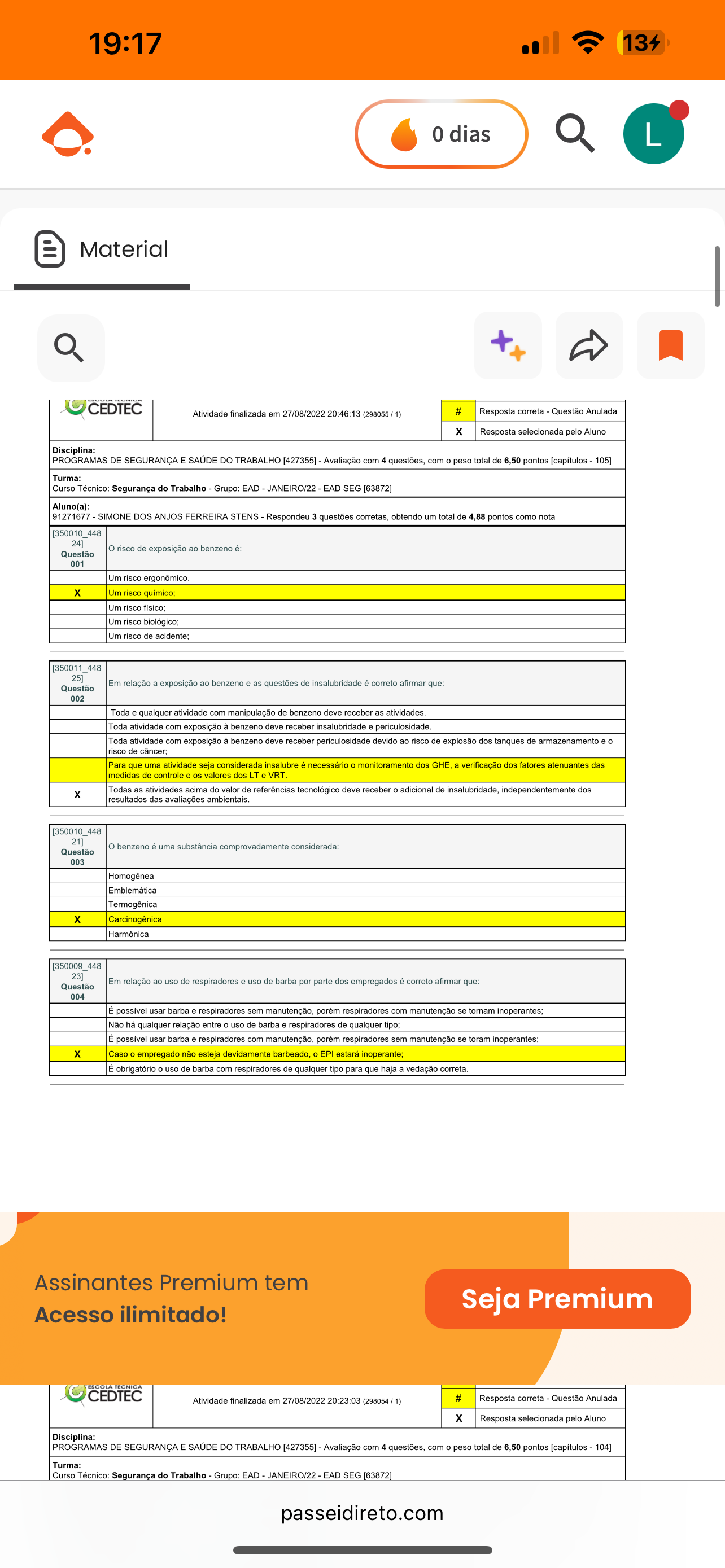 19:17 134 0 dias L Material CEDTEC Atividade finalizada em 27/08/2022 20:46:13 (298055 # Resposta correta Questão Anulada X Resposta selecionada pelo Aluno Disciplina: PROGRAMAS DE SEGURANÇA E SAÚDE DO TRABALHO [427355] Avaliação com 4 questões, com O peso total de 6,50 pontos [capítulos 105] Turma: Curso Técnico: Segurança do Trabalho Grupo: EAD JANEIRO/22 EAD SEG [63872] Aluno(a): 91271677 SIMONE DOS ANJOS FERREIRA STENS Respondeu 3 questões corretas, obtendo um total de 4,88 pontos como nota 24] risco de exposição ao benzeno é: Questão 001 Um risco ergonômico. Um risco Um risco Um risco biológico; Um risco de [350011 448 25] Em relação a exposição ao benzeno e as questões de insalubridade é correto afirmar que: Questão 002 Toda e qualquer atividade com manipulação de benzeno deve receber as Toda atividade com exposição à benzeno deve receber insalubridade e periculosidade. Toda atividade com exposição à benzeno deve receber periculosidade devido ao risco de explosão dos tanques de armazenamento e risco de câncer; Para que uma atividade seja considerada insalubre é necessário monitoramento dos GHE, a verificação dos fatores atenuantes das medidas de controle e os valores dos LT VRT X Todas as atividades acima do valor de referências tecnológico deve receber adicional de insalubridade, independentemente dos resultados das avaliações ambientais. [350010_448 21] benzeno é uma substância comprovadamente considerada: Questão 003 Homogênea Emblemática Termogênica X Carcinogênica Harmônica 23] Em relação ao uso de respiradores e uso de barba por parte dos empregados é correto afirmar que: Questão 004 É possível usar barba e respiradores sem manutenção, respiradores com manutenção se tornam inoperantes; Não há qualquer relação entre O uso de barba e respiradores de qualquer tipo; possível usar barba e respiradores com manutenção, respiradores sem manutenção se toram inoperantes; X Caso empregado não esteja devidamente barbeado, EPI estará inoperante; É obrigatório uso de barba com respiradores de qualquer tipo para que haja a vedação correta. Assinantes Premium tem Acesso ilimitado! Seja Premium CEDTEC Atividade finalizada em 27/08/2022 20:23:03 (298054 1) # Resposta correta Questão Anulada X Resposta selecionada pelo Aluno Disciplina: PROGRAMAS DE SEGURANÇA E SAÚDE DO TRABALHO [427355] Avaliação com 4 questões, com peso total de 6,50 pontos [capítulos 104] Turma: Curso Técnico: Segurança do Trabalho Grupo: EAD JANEIRO/22 EAD SEG [63872] passeidireto.com