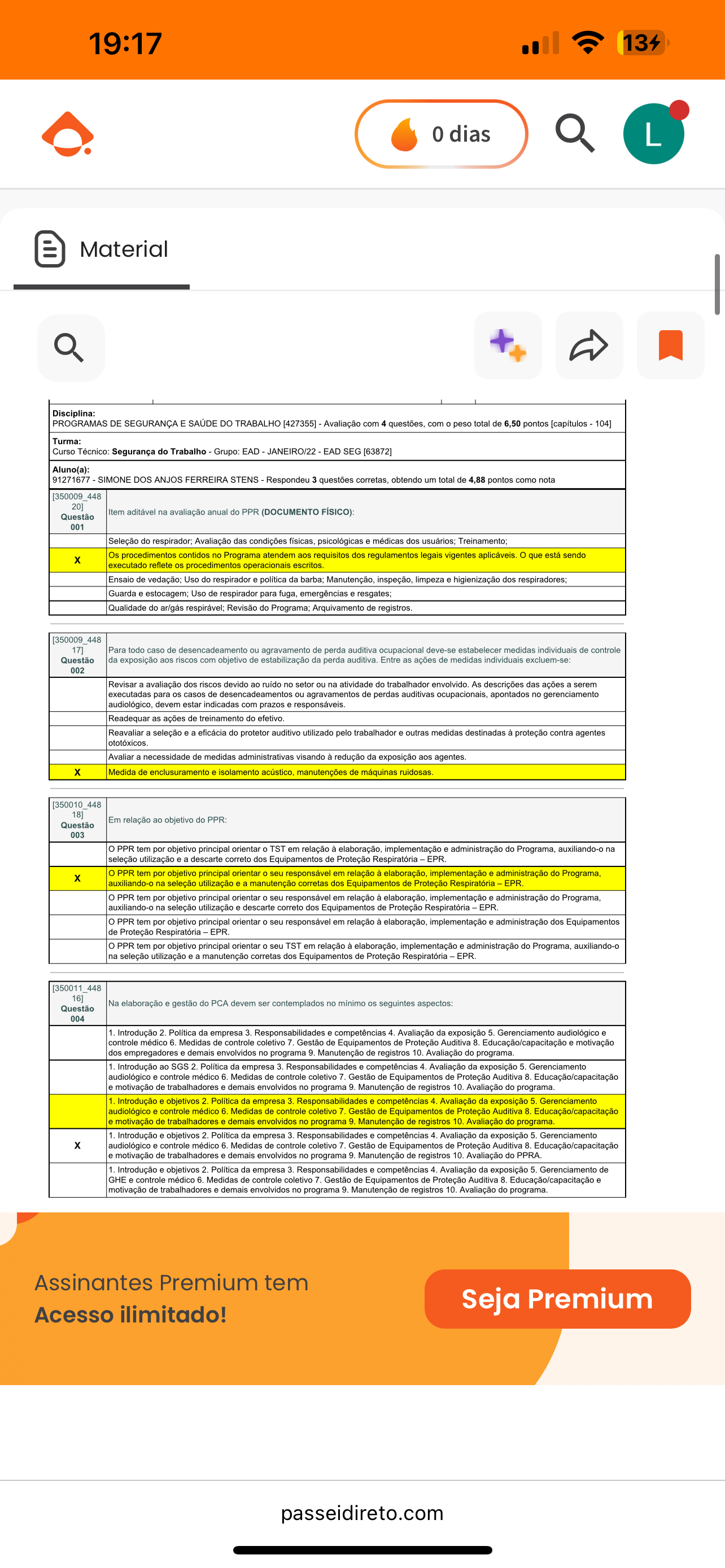 19:17 134 0 dias L Material Disciplina: PROGRAMAS DE SEGURANÇA E SAÚDE DO TRABALHO [427355] Avaliação com 4 questões, com O peso total de 6,50 pontos [capítulos 104] Turma: Curso Técnico: Segurança do Trabalho Grupo: EAD JANEIRO/22 EAD SEG [63872] Aluno(a): 91271677 SIMONE DOS ANJOS FERREIRA STENS Respondeu 3 questões corretas, obtendo um total de 4,88 pontos como nota 20] Item aditável na avaliação anual do PPR (DOCUMENTO FÍSICO): Questão 001 Seleção do respirador; Avaliação das condições físicas, psicológicas e médicas dos usuários; Treinamento; Os procedimentos contidos no Programa atendem aos requisitos dos regulamentos legais vigentes aplicáveis. que está sendo executado reflete os procedimentos operacionais escritos. Ensaio de vedação; Uso do respirador e política da barba; Manutenção, inspeção, limpeza e higienização dos respiradores; Guarda e estocagem; Uso de respirador para fuga, emergências e resgates; Qualidade do ar/gás respirável; Revisão do Programa; Arquivamento de [350009] 448 17] Para todo caso de desencadeamento ou agravamento de perda auditiva ocupacional deve-se estabelecer medidas individuais de controle Questão da exposição aos riscos com objetivo de estabilização da perda auditiva. Entre as ações de medidas individuais excluem-se: 002 Revisar a avaliação dos riscos devido ao ruído no setor ou na atividade do trabalhador envolvido. As descrições das ações a serem executadas para casos de ou agravamentos de perdas auditivas ocupacionais, apontados no gerenciamento audiológico, devem estar indicadas com prazos e responsáveis Readequar as ações de treinamento do efetivo. Reavaliar a seleção e a eficácia do protetor auditivo utilizado pelo trabalhador e outras medidas destinadas à proteção contra agentes Avaliar a necessidade de medidas administrativas visando à redução da exposição aos agentes. Medida de enclusuramento e isolamento acústico, manutenções de máquinas [350010_448 18] Em relação ao objetivo do PPR: Questão 003 PPR tem por objetivo principal orientar TST em relação à elaboração, implementação e administração do Programa, auxiliando-o na seleção utilização e a descarte correto dos Equipamentos de Proteção Respiratória EPR. PPR tem por principal orientar o seu responsável em relação à elaboração, implementação e administração do Programa, auxiliando-o na seleção utilização e a manutenção corretas dos Equipamentos de Proteção Respiratória PPR tem por objetivo principal orientar seu responsável em relação à elaboração, implementação e administração do Programa, auxiliando-o na seleção utilização e descarte correto dos Equipamentos de Proteção Respiratória EPR. PPR tem por objetivo principal orientar seu responsável em relação à elaboração, implementação e administração dos Equipamentos de Proteção Respiratória EPR. PPR tem por objetivo principal orientar seu TST em relação à elaboração, implementação e administração do Programa, auxiliando-o na seleção utilização e manutenção corretas dos Equipamentos de Proteção Respiratória EPR. [350011 16] Na elaboração e gestão do PCA devem ser contemplados no mínimo os seguintes aspectos: Questão 004 1. Introdução 2. Política da empresa 3. Responsabilidades e competências 4. Avaliação da exposição 5. Gerenciamento audiológico e controle médico 6. Medidas de controle coletivo 7. Gestão de Equipamentos de Proteção Auditiva Educação/capacitação e motivação dos empregadores e demais envolvidos no programa 9. Manutenção de registros 10. Avaliação do programa. 1. Introdução ao SGS 2. Política da empresa 3. Responsabilidades e competências 4. Avaliação da exposição 5. Gerenciamento audiológico e controle médico 6. Medidas de controle coletivo 7. Gestão de Equipamentos de Proteção Auditiva 8. Educação/capacitação e motivação de trabalhadores e demais envolvidos no programa 9. Manutenção de registros 10. Avaliação do programa. Introdução e objetivos 2 Política da empresa 3. Responsabilidades e competências 4 Avaliação da exposição 5. Gerenciamento audiológico e controle médico 6. Medidas de controle coletivo 7. Gestão de Equipamentos de Proteção Auditiva 8. Educação/capacitação e motivação de trabalhadores demais envolvidos no programa 9. Manutenção de registros Avaliação do programa 1. Introdução e objetivos 2. Política da empresa 3. Responsabilidades e competências 4. Avaliação da exposição 5. Gerenciamento X audiológico e controle médico 6. Medidas de controle coletivo 7. Gestão de Equipamentos de Proteção Auditiva 8. Educação/capacitação e motivação de trabalhadores e demais envolvidos no programa 9. Manutenção de registros 10. Avaliação do PPRA 1. Introdução e objetivos 2. Política da empresa 3. Responsabilidades e competências Avaliação da exposição 5. Gerenciamento de GHE controle médico 6. Medidas de controle coletivo 7 Gestão de Equipamentos de Proteção Auditiva 8. Educação/capacitação e motivação de trabalhadores e demais envolvidos no programa 9. Manutenção de registros 10. Avaliação do programa. Assinantes Premium tem Acesso ilimitado! Seja Premium passeidireto.com