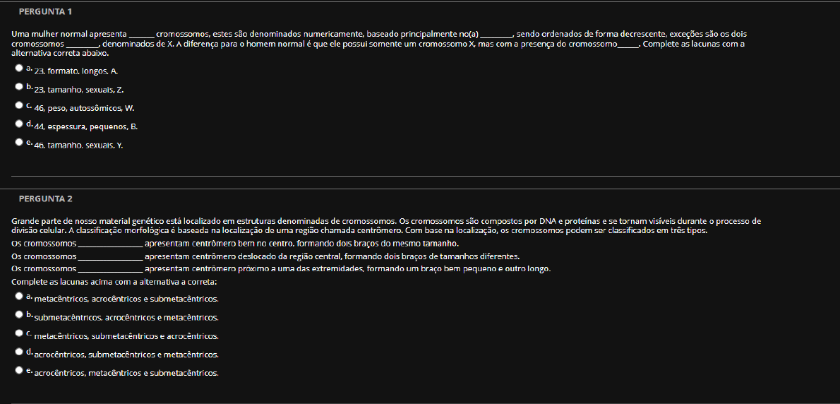 PERGUNTA 1 Uma mulher normal apresenta cromossomos, estes são denominados numericamente, baseado principalmente no(a) sendo ordenados de forma decrescente, exceções são os dois cromossomos denominados de X. A diferença para homem normal é que ele possui somente um cromossomo X, mas com a presença do cromossomo Complete as lacunas com a alternativa correta abaixo. a. 23, formato, longos, A. b. 23, tamanho, sexuais, 46, peso, autossômicos, W. d. 44, espessura, pequenos, e. 46, tamanho, sexuais, Y. PERGUNTA 2 Grande parte de nosso material genético está localizado em estruturas denominadas de cromossomos. Os cromossomos são compostos por DNA e proteínas e se tornam visíveis durante processo de divisão celular. A classificação morfológica é baseada na localização de uma região chamada centrômero. Com base na localização, os cromossomos podem ser classificados em três tipos. Os cromossomos apresentam centrômero bem no centro, formando dois braços do mesmo tamanho. Os cromossomos apresentam centrômero deslocado da região central, formando dois braços de tamanhos diferentes. Os cromossomos apresentam centrômero próximo a uma das extremidades, formando um braço bem pequeno e outro longo. Complete as lacunas acima com a alternativa a correta: a. metacêntricos, acrocêntricos e submetacêntricos. b. submetacêntricos, acrocêntricos e metacêntricos. metacêntricos, submetacêntricos e acrocêntricos. d. acrocêntricos, submetacêntricos e metacêntricos. e. acrocêntricos, metacêntricos e submetacêntricos.síndrome Cri-Du-Chat ou miado do gato foi originalmente descrita em 1963 pelo Dr. Lejeune, na França. Esta síndrome recebe esse nome pelo fato de seus portadores possuírem um choro semelhante ao miado agudo de um gato. Os afetados se caracterizam por apresentar assimetria facial, com microcefalia (cabeça pequena), má formação da laringe (daí choro lamentoso parecido com miado de gato), hipertelorismo ocular (aumento da distância entre os olhos), hipotonia (tônus muscular deficiente), fenda palpebral antimongoloide (canto interno dos olhos mais altos do que externo), pregas epicânticas, orelhas mal formadas e de implantação baixa dedos longos, prega única na palma das mãos, atrofia dos membros que ocasiona retardamento neuromotor e retardamento mental acentuado. Assinale a alternativa correta, que indica a necessidade de realizar um cariótipo para se detectar: a. Deleção. b. Translocação. Permuta. d. Inversão. e. Duplicação. PERGUNTA 4 Em relação à síndrome de Down, analise as afirmações abaixo: Pode ser considerada uma aberração cromossômica numérica. São verificados os casos de síndrome Down por deleção. A idade materna está relacionada ao surgimento dessa síndrome. correto que se afirma em: a. Somente na afirmação I. b. Somente nas afirmações I e II. Somente na afirmação II. d. Somente nas afirmações e III. e. Nas afirmações I, II e III.PERGUNTA 5 acúmulo de conhecimento na área de genética e em várias áreas correlatas ou não tem contribuído para a melhor compreensão da finalidade e funcionamento de muitos genes, que nos leva a um melhor conhecimento do corpo humano e sua psicologia. Por meio de serviços de aconselhamento genético, parte desse conhecimento é utilizado. A quem se destina aconselhamento genético? Considere as afirmativas abaixo: I. A pessoas com problemas genéticos. II. A pessoas com filhos com problemas genéticos. III. A casais com problemas reprodutivos. Assinale a alternativa correta: a. Somente a afirmativa I está correta. b. Somente as afirmativas I e estão corretas. Somente as afirmativas II e III estão corretas. d. Somente a afirmativa III está correta. e. As afirmativas I, e III estão corretas. PERGUNTA 6 estudo dos cromossomos é denominado de citogenética. Alterações no padrão normal levam a aberrações cromossômicas, sendo a aberração cromossômica numérica uma alteração do número de alguns cromossomos que acarreta síndromes características. Analise as alternativas abaixo e assinale a correta: a. Encontrar indivíduos com diminuição de cromossomos autossômicos é extremamente comum, já que temos um par de cada. b. A síndrome de Turner é causada pela ausência total de cromossomos sexuais. Um tipo aberração cromossômica numérica é chamado de aneuploidia, podendo ocorrer tanto nos cromossomos autossomos como nos sexuais. d. A poliploidia é comum nos seres humanos e ocorre quando temos pelo menos 20 cromossomos a mais. e. A síndrome de Klinefelter afeta homens e mulheres.PERGUNTA 7 Um médico avaliando paciente pediu exame como resultado, foi obtido 0 cariótipo mostrado abaixo: 7 9 10 11 12 13 14 15 16 17 18 19 20 21 22 Fonte: Adaptado de: https://tinyurl com/28sukhr3 Pacientes com essa síndrome são 45,X e possuem somente um cromossomo sexual, cromossomo X. São características dessa síndrome: a. Choro parecido com um miado, cabeça pequena, deficiência mental. b. "prega alada", são Alta estatura. são estéreis. ginecomastia. d. Baixa estatura, "olhos puxados", homens são estéreis. e. Presença de lábio leporino, deficiência mental, várias anomalias congênitas. PERGUNTA 8 A síndrome de Angelman e a síndrome de Prader-Willi são síndromes cromossômicas estruturais em que a maioria dos pacientes apresentam a falta do segmento q11-q13 do cromossomo 15. Assinale a alternativa correta. a. Indivíduos com a síndrome de Angelman possuem aparência feliz, com explosões de risos, mas com deficiência mental grave. b. Indivíduos com a síndrome de Prader-Willi possuem altura acima do normal e são sempre do sexo masculino. risco de recorrência para essas duas é muito alto. d. Em raras ocasiões, as pessoas com essas síndromes não apresentam retardo mental.PERGUNTA 9 A Sociedade Brasileira de Psico-Oncologia (SBPO) foi criada em 1° de maio de 1994 com objetivo de congregar profissionais com interesse na área para estudo, a di