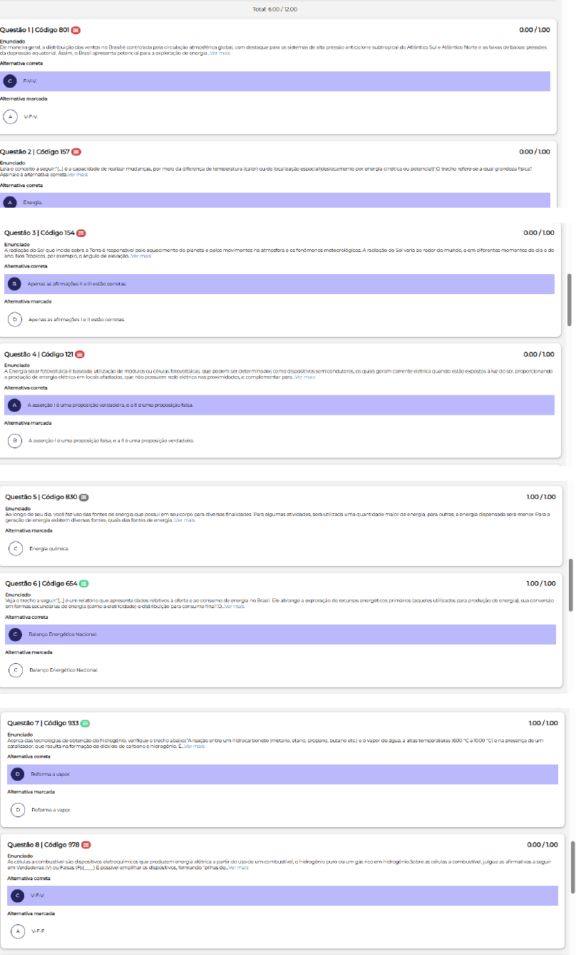 Total: 6.00/12.00 Questão 1 Código 801 0.00/1.00 Enunciado De maneira geral, distribuição dos ventos no Brasil controlada pela circulação atmosférica global, com destaque para sistemas de alta pressão anticiclone subtropical do Atlântico Sul Atlântico Norte as faixas de baixas pressões da depressão Assim Brasil apresenta potencial para exploração de energia. Ver mais Alternativa correta Alternativa marcada Questão 2 Código 157 0.00/1.00 Enunciado Leia conceito capacidade de realizar mudanças, por meio da diferença de temperatura (calor) ou de localização por energia cinética ou potencial) trecho refere se qual grandeza fisica? Assinale alternativa correta Ver mais Alternativa correta A Energia Questão 3 Código 154 0.00/1.00 Enunciado A radiação do Sol que incide sobre Terra é responsável pelo aquecimento do planeta e pelos movimentos na atmosfera os fenômenos meteorológicos A radiação do Sol varia ao redor do em diferentes momentos do dia do ano. Nos por o de Ver mais Alternativa correta Apenas as afirmações III estão Alternativa marcada D Apenas as afirmações estão corretas Questão 4 Código 121 0.00/1.00 Enunciado A Energia solar fotovoltaica baseada utilização de módulos ou células que podem ser determinados como dispositivos semicondutores, quais geram corrente elétrica quando estão expostos luz do sol, proporcionando a produção de energia elétrica em locais que não possuem rede elétrica nas proximidades, e complementar para. Ver mais Alternativa correta A asserção uma proposição uma proposição Alternativa marcada B A asserção uma proposição uma proposição Questão 5 Código 830 1.00/1.00 Enunciado Ao longo de seu dia, você faz uso das fontes de energia que possui em seu corpo para diversas Para algumas será utilizada uma quantidade maior de energia, para energia dispensada será menor Para a geração de energia existem diversas quais das fontes de energia... Ver mais Alternativa marcada Energia Questão 6 Código 654 1.00/1.00 Enunciado Veja trecho um relatório que apresenta dados relativos oferta ao consumo de energia no Ele abrange exploração de recursos energéticos primários (aqueles utilizados para produção de sua conversão em formas secundárias de energia (como eletricidade) distribuição para consumo Ver mais Alternativa correta Balanço Energético Alternativa marcada Balanço Energético Nacional Questão 7 Código 933 1.00/1.00 Enunciado Acerca das tecnologias de obtenção do hidrogênio, verifique trecho reação entre um hidrocarboneto (metano, etano, butano etc.) e vapor de água, altas temperaturas °C 1000 na presença de um que resulta na formação de dióxido de carbono hidrogênio. mais Alternativa correta D Reforma Alternativa marcada Reforma vapor Questão 8| Código 978 0.00/1.00 Enunciado As células combustivel são dispositivos que produzem energia elétrica a partir do uso de um hidrogênio puro ou um gás rico em hidrogênio. Sobre as células julgue as afirmativas seguir em Verdadeiras (V) ou Falsas (F).( empilhar os dispositivos, formando "pilhas de...Ver mais Alternativa correta V-F-V. Alternativa marcada V-F-F.Questão 9 Código 151 1.00/1.00 Enunciado Nos últimos mercado mundial de biodiesel tou um incremento devido ao aumento nos preços do à busca por de fontes renováveis, que provocou aumento da participação de nas matrizes Sobre biodiesel e os julgue as afirmativas seguir em Ver mais Alternativa marcada D F-F-V. Questão 10 Código 905 1.00/1.00 Enunciado Existe uma relação entre tipo de energia as fontes das quais ela a energia mecânica pode ser obtida de fontes como os ventos, marés e água; Sol é uma fonte de energia eletromagnética; energia química provém de fontes como biomassas e fósseis Ver mais Alternativa correta A asserção uma proposição uma proposição Alternativa marcada B asserção uma proposição uma proposição Questão 11 Código 931 0.00/1.00 Enunciado Os fósseis foram formados há milhares de anos por meio de processos naturais de morte, soterramento decomposição de seres vivos.Sobre combustiveis fósseis, julgue as afirmativas seguir em Verdadeiras (V) ou Questão 11 Código 931 0.00/1.00 Enunciado Os combustiveis fósseis foram formados há milhares de anos por meio de processos naturais de morte, soterramento decomposição de seres vivos Sobre fósseis, julgue as afirmativas seguir em Verdadeiras ou Falsas 70% do volume do gás natural formado por no entanto a Ver mais Alternativa correta A V-V-V. Alternativa marcada V-F-V. Questão 12 Código 657 1.00/1.00 Enunciado Os são as partes que sobram de processos derivados das atividades humanas e animal e de processos produtivos como matéria orgânica, lixo doméstico, os efluentes industriais gases liberados em processos industriais ou por A geração destinação adequada dos residuos sólidos gerados sempre...Ver mais Alternativa correta D Apenas as afirmações III estão corretas Alternativa marcada D Apenas as afirmações III estão