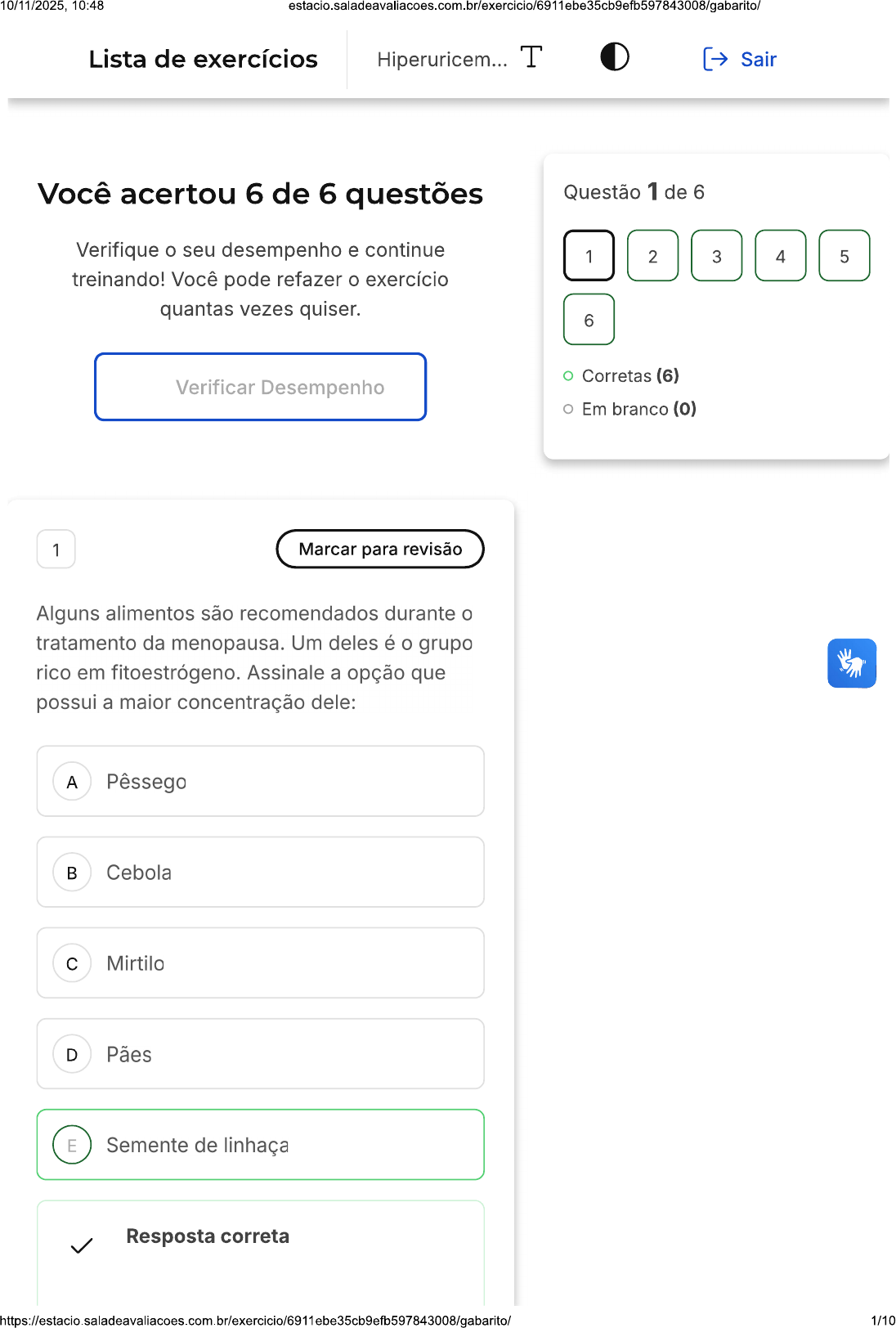 10/11/2025, 10:48 estacio.saladeavaliacoes.com.br/exercicio/6911ebe35cb9efb597843008/gabarito/ Lista de exercícios Hiperuricem... T Sair Você acertou 6 de 6 questões Questão 1 de 6 Verifique o seu desempenho e continue 1 2 3 4 5 treinando! Você pode refazer exercício quantas vezes quiser. 6 Corretas (6) Verificar Desempenho Em branco 1 Marcar para revisão Alguns alimentos são recomendados durante tratamento da menopausa. Um deles é grupo rico em fitoestrógeno. Assinale a opção que possui a maior concentração dele: A Pêssego Cebola c Mirtilo D Pães E Semente de linhaça Resposta correta 1/1010/11/2025, 10:48 estacio.saladeavaliacoes.com.br/exercicio/6911ebe35cb9efb597843008/gabarito/ Parabéns, você selecionou a alternativa correta. Confira gabarito comentado! Gabarito Comentado A semente de linhaça é a opção correta. Ela é conhecida por ser uma das maiores fontes de fitoestrógeno, um composto que tem uma estrutura química semelhante ao estrogênio, hormônio feminino. Durante a menopausa, os níveis de estrogênio no corpo da mulher diminuem, e o consumo de alimentos ricos em fitoestrógenos, como a semente de linhaça, pode ajudar a aliviar os sintomas associados a essa fase, como ondas de calor e suores noturnos. 2 Marcar para revisão A OMS define a osteoporose como uma doença metabólica óssea sistêmica, caracterizada por diminuição da massa óssea e deterioração da microarquitetura do tecido ósseo, com consequente aumento da fragilidade do osso e da suscetibilidade a fraturas. Na osteopenia, também ocorre diminuição da massa óssea, porém sem comprometimento da microarquitetura. Assinale a alternativa correta sobre os nutrientes que interagem com cálcio para a mineralização da massa óssea. 2/1010/11/2025, 10:48 estacio.saladeavaliacoes.com.br/exercicio/6911ebe35cb9efb597843008/gabarito/ A vitamina D é um hormônio esteroide, cuja principal função consiste na regulação da homeostase do cálcio, A formação e reabsorção óssea, através da sua interação com a paratireoide, os rins e intestino. 20 a 30% do magnésio encontram-se no tecido ósseo. excesso de vitamina favorece c microcalcificações em vários locais do organismo A deficiência de zinco pode significar uma queda de 45% na massa óssea. A D RDA desse mineral para gestantes maiores de 18 anos é de 40 mg. A concentração de cobre no leite de vaca é de 4 vezes maior que no leite humano e a biodisponibilidade no leite E humano é maior. A deficiência desse mineral provoca fragilidade anormal dos Resposta correta Parabéns, você selecionou a alternativa correta. Confira gabarito comentado! Gabarito Comentado A alternativa correta é a letra A vitamina D é um hormônio esteroide que desempenha um papel crucial na regulação da homeostase do cálcio, formação e reabsorção óssea. Ela interage com a 3/1010/11/2025, 10:48 paratireoide, os rins e intestino para realizar essas funções. Portanto, a vitamina D é um nutriente essencial que interage com cálcio para a mineralização da massa óssea, que é fundamental para a saúde óssea e a prevenção de doenças como a osteoporose. 3 Marcar para revisão A tireoide é uma glândula encontrada na região do pescoço que é responsável por produzir importantes hormônios. Analise a alternativa a seguir e marque aquela que indica dois hormônios produzidos pela tireoide: A Insulina e glucagon. Hormônio tireoestimulante e tiroxina. c Tri-iodotironina e tiroxina. Hormônio tireoestimulante e D calcitonina. E Tiroxina e adrenalina Resposta correta Parabéns, você selecionou a alternativa correta. Confira gabarito comentado! 4/1010/11/2025, 10:48 estacio.saladeavaliacoes.com.br/exercicio/6911ebe35cb9efb597843008/gabarito/ Gabarito Comentado A tireoide produz dois hormônios: a tri- iodotironina e a tiroxina. A tri-iodotironina é um hormônio mais potente que a tiroxina, e ambos os hormônios são responsáveis por regular o metabolismo do corpo. 4 Marcar para revisão A osteoporose é um distúrbio sistêmico do esqueleto, caracterizado pelo comprometimento da resistência e da qualidade mineral óssea, sendo uma doença que predispõe indivíduo ao risco de fraturas. A respeito desse assunto, assinale a opção correta. Uma porção de couve cozida tem conteúdo de cálcio equivalente a uma porção de leite integral, sendo, A portanto, um alimento estratégico de reposição de cálcio para indivíduos com intolerância à lactose. Em países tropicais, a osteoporose não é considerada um problema de saúde pública, em função da abundância da radiação solar, que resulta em bons níveis de vitamina D da população. No caso de suplementação de cálcio, os valores consumidos acima das c necessidades não devem ser considerados nos cálculos de ingestão. 5/1010/11/2025, 10:48 estacio.saladeavaliacoes.com.br/exercicio/6911ebe35cb9efb597843008/gabarito/ Fibras não digeríveis de natureza oligossacarídea, como a inulina e a D oligofrutose, reduzem a absorção de cálcio, portanto devem ser evitadas por indivíduos com osteoporose. Como uma medida preventiva da osteoporose, indivíduo deve atingir o maior pico de massa óssea possível E ao final do desenvolvimento do esqueleto, que minimiza a perda fisiológica associada ao envelhecimento e à menopausa. Resposta correta Parabéns, você selecionou a alternativa correta. Confira gabarito comentado! Gabarito Comentado A alternativa correta é a E. A osteoporose é uma doença que compromete a resistência e a qualidade mineral óssea, aumentando risco de fraturas. Uma das estratégias para prevenir essa condição é maximizar pico de massa óssea que um indivíduo pode atingir durante desenvolvimento do esqueleto. Isso porque, quanto maior a massa óssea acumulada durante a juventude, menor será a perda óssea fisiológica associada ao envelhecimento e à menopausa, reduzindo assim risco de osteoporose. 5 Marcar para revisão 6/1010/11/2025, 10:48 estacio.salade