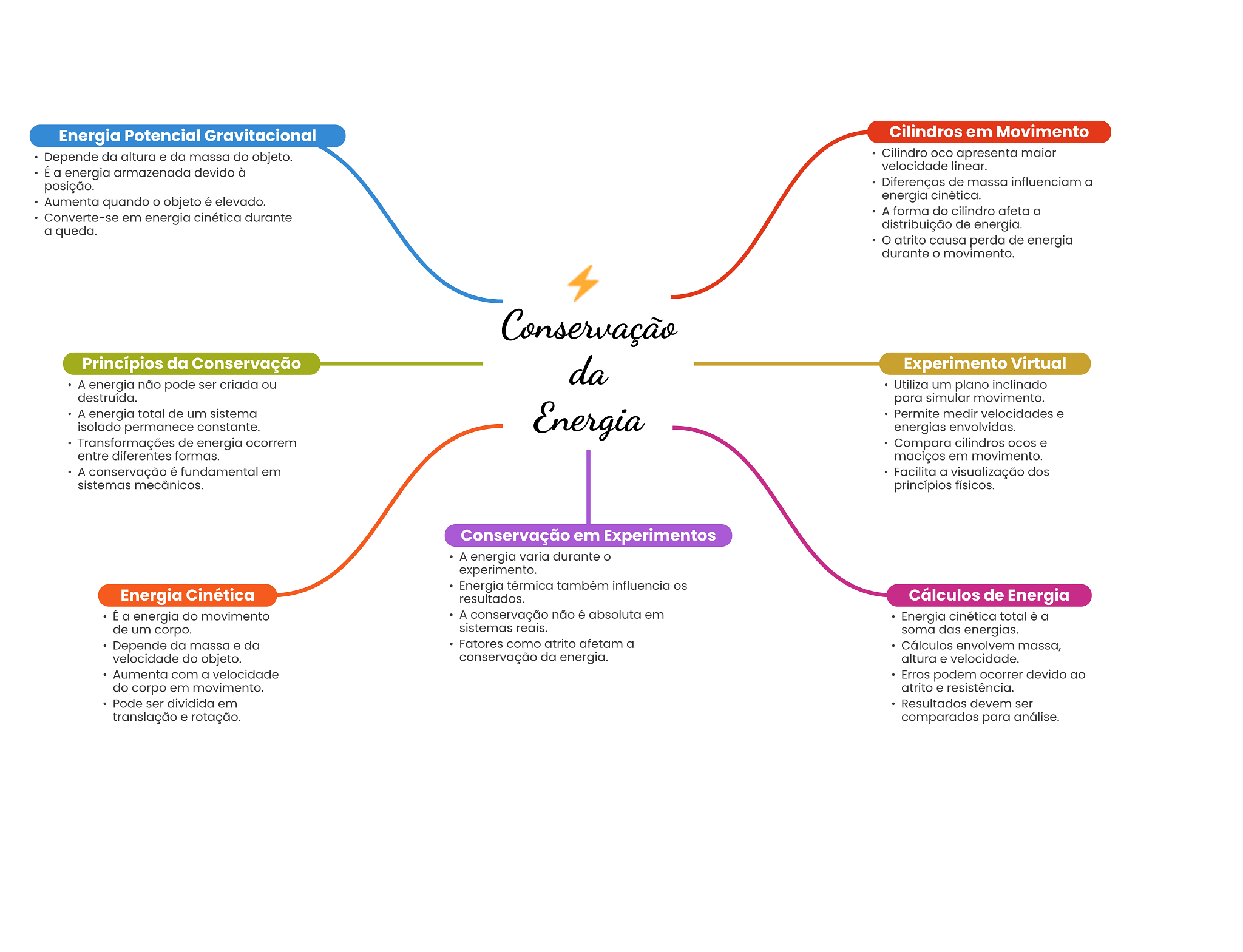 Energia Potencial Gravitacional Cilindros em Movimento Depende da altura e da massa do objeto. Cilindro apresenta maior É a energia armazenada devido à velocidade linear. posição. Diferenças de massa influenciam a Aumenta quando objeto é elevado. energia cinética. A forma do cilindro afeta a Converte-se em energia cinética durante a queda. distribuição de energia. atrito causa perda de energia durante movimento. Conservação Princípios da Conservação da Experimento Virtual A energia não pode ser criada ou Utiliza um plano inclinado destruída. para simular movimento. A energia total de um sistema Energia Permite medir velocidades e isolado permanece constante. energias envolvidas. Transformações de energia ocorrem Compara cilindros e entre diferentes formas. maciços em movimento. A conservação é fundamental em Facilita a visualização dos sistemas mecânicos. princípios físicos. Conservação em Experimentos A energia varia durante O experimento. Energia térmica também influencia OS Energia Cinética resultados. Cálculos de Energia É a energia do movimento A conservação não é absoluta em Energia cinética total é a de um corpo. sistemas reais. soma das energias. Depende da massa e da Fatores como atrito afetam a Cálculos envolvem massa, velocidade do objeto. conservação da energia. altura e velocidade. Aumenta com a velocidade Erros podem ocorrer devido ao do corpo em movimento. atrito e resistência. Pode ser dividida em Resultados devem ser translação e rotação. comparados para análise.