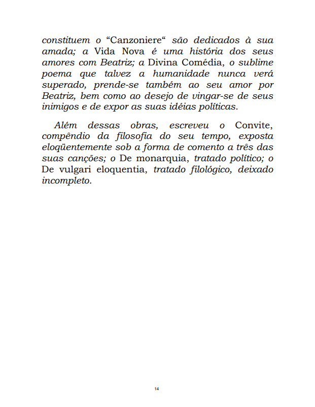 constituem 0 "Canzoniere" são dedicados à sua amada; a Vida Nova é uma história dos seus amores com Beatriz; a Divina Comédia, 0 sublime poema que talvez a humanidade nunca verá superado, prende-se também ao seu amor por Beatriz, bem como ao desejo de vingar-se de seus inimigos e de expor as suas idéias políticas. Além dessas obras, escreveu Convite, compêndio da filosofia do seu tempo, exposta eloqüentemente sob a forma de comento a três das suas canções; De monarquia, tratado político; De vulgari eloquentia, tratado filológico, deixado incompleto. 14