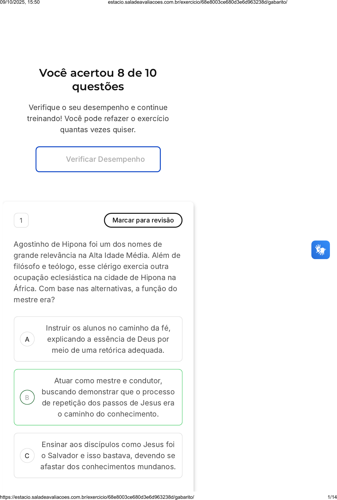 Você acertou 8 de 10 questões Verifique o seu desempenho e continue treinando! Você pode refazer o exercício quantas vezes quiser. Verificar Desempenho A B C 1 Marcar para revisão Agostinho de Hipona foi um dos nomes de grande relevância na Alta Idade Média. Além de filósofo e teólogo, esse clérigo exercia outra ocupação eclesiástica na cidade de Hipona na África. Com base nas alternativas, a função do mestre era? Instruir os alunos no caminho da fé, explicando a essência de Deus por meio de uma retórica adequada. Atuar como mestre e condutor, buscando demonstrar que o processo de repetição dos passos de Jesus era o caminho do conhecimento. Ensinar aos discípulos como Jesus foi o Salvador e isso bastava, devendo se afastar dos conhecimentos mundanos. 09/10/2025, 15:50 estacio.saladeavaliacoes.com.br/exercicio/68e8003ce680d3e6d963238d/gabarito/ https://estacio.saladeavaliacoes.com.br/exercicio/68e8003ce680d3e6d963238d/gabarito/ 1/14 D E Promover a dialogia e a troca constante de traços socioculturais como forma de universalizar o conhecimento. Seguir os preceitos da filosofia clássica, em especial de Platão, mostrando como esta deveria ser a base do conhecimento. Resposta correta Parabéns, você selecionou a alternativa correta. Confira o gabarito comentado! Gabarito Comentado A resposta correta é: Atuar como mestre e condutor, buscando demonstrar que o processo de repetição dos passos de Jesus era o caminho do conhecimento. Agostinho de Hipona foi um dos nomes de grande relevância na Alta Idade Média. Além de filósofo e teólogo, esse clérigo exercia outra ocupação eclesiástica na cidade de Hipona na África. Com base nas alternativas, a função do mestre era atuar como mestre e condutor, buscando demonstrar que o processo de repetição dos passos de Jesus era o caminho do conhecimento. 2 Marcar para revisão As denominadas sete artes liberais, que formavam a base do sistema escolar no período 09/10/2025, 15:50 estacio.saladeavaliacoes.com.br/exercicio/68e8003ce680d3e6d963238d/gabarito/ https://estacio.saladeavaliacoes.com.br/exercicio/68e8003ce680d3e6d963238d/gabarito/ 2/14 A B C D E medieval na Europa Ocidental, abrangiam duas séries. Eram elas: Sistema de Anselmo de Cantuária e de Isidoro de Sevilha. Alcorão e Sistema de Tomás de Aquino. O Trivium e a Bula Parens Scientiarum. O Trivium e o Quadrivium. O Trivium e o doutorado em Teologia. Resposta correta Parabéns, você selecionou a alternativa correta. Confira o gabarito comentado! Gabarito Comentado As sete artes liberais, que eram a base do sistema educacional durante a Idade Média na Europa Ocidental, eram divididas em duas partes: o Trivium e o Quadrivium. O Trivium consistia em gramática, retórica e dialética, enquanto o Quadrivium incluía aritmética, geometria, música e astronomia. Portanto, a alternativa correta é a D: O Trivium e o Quadrivium. 3 Marcar para revisão 09/10/2025, 15:50 estacio.saladeavaliacoes.com.br/exercicio/68e8003ce680d3e6d963238d/gabarito/ https://estacio.saladeavaliacoes.com.br/exercicio/68e8003ce680d3e6d963238d/gabarito/ 3/14 A B C D E Considerando seus conhecimentos a respeito das influências culturais na educação, avalie as asserções abaixo e a relação entre elas. I. A dominação muçulmana da Península Ibérica definiu as bases do racionalismo cristão do século XII PORQUE II. Durante o domínio islâmico, os cristãos que permaneceram em suas regiões aprenderam a falar e escrever árabe, permitindo que textos da Grécia Clássica fossem recuperados Assinale a alternativa correta: A asserção I é uma proposição falsa, e a II é uma proposição verdadeira. A asserção I é uma proposição verdadeira, e a II é uma proposição falsa. As asserções I e II são proposições falsas. As asserções I e II são proposições verdadeiras, mas a II não é uma justificativa da I. As asserções I e II são proposições verdadeiras, e a II é uma justificativa da I. Resposta correta Parabéns, você selecionou a alternativa correta. Confira o gabarito comentado! Gabarito Comentado 09/10/2025, 15:50 estacio.saladeavaliacoes.com.br/exercicio/68e8003ce680d3e6d963238d/gabarito/ https://estacio.saladeavaliacoes.com.br/exercicio/68e8003ce680d3e6d963238d/gabarito/ 4/14 A B C D E A alternativa correta é a E. Durante o domínio muçulmano na Península Ibérica, os cristãos que permaneceram em suas regiões aprenderam a falar e escrever em árabe, além das línguas locais. Essa troca cultural permitiu que tradutores recuperassem textos da Grécia Clássica, principalmente de Aristóteles, que até então só existiam em árabe. Essa recuperação de textos clássicos fundamentou o caminho para o racionalismo cristão no século XII. Portanto, a asserção II justifica a asserção I, tornando ambas verdadeiras. 4 Marcar para revisão Durante a Idade Média, existiram dois movimentos/modelos intelectuais centrais. Um que era influenciado pelos pais da igreja e outro que aparece ao lado dos movimentos urbanos e as novas técnicas educacionais trazidas pelos árabes. Como chamamos esses dois modelos? Neoplatonismo e Neoaristotelismo Neoplatonismo e Neosocratismo Neosocratismo e Neoaristotelismo Neoarquimediano e Neoaristotelismo Neosocratismo e Neoarquimediano 09/10/2025, 15:50 estacio.saladeavaliacoes.com.br/exercicio/68e8003ce680d3e6d963238d/gabarito/ https://estacio.saladeavaliacoes.com.br/exercicio/68e8003ce680d3e6d963238d/gabarito/ 5/14 Resposta correta Parabéns, você selecionou a alternativa correta. Confira o gabarito comentado! Gabarito Comentado O Neoplatonismo é herdeiro da patrística, partindo especialmente de Agostinho. Segundo essa corrente, Deus deve ser sentido, não necessitando de uma explicação racional. Acredita-se na necessidade de mestres para conduzir os sujeitos pela prática, pela repetição de nomes da Igreja para alcançar Deus. Como Deus é tudo, inclusive todo o conhecimento, a busca por Ele é um exercício co