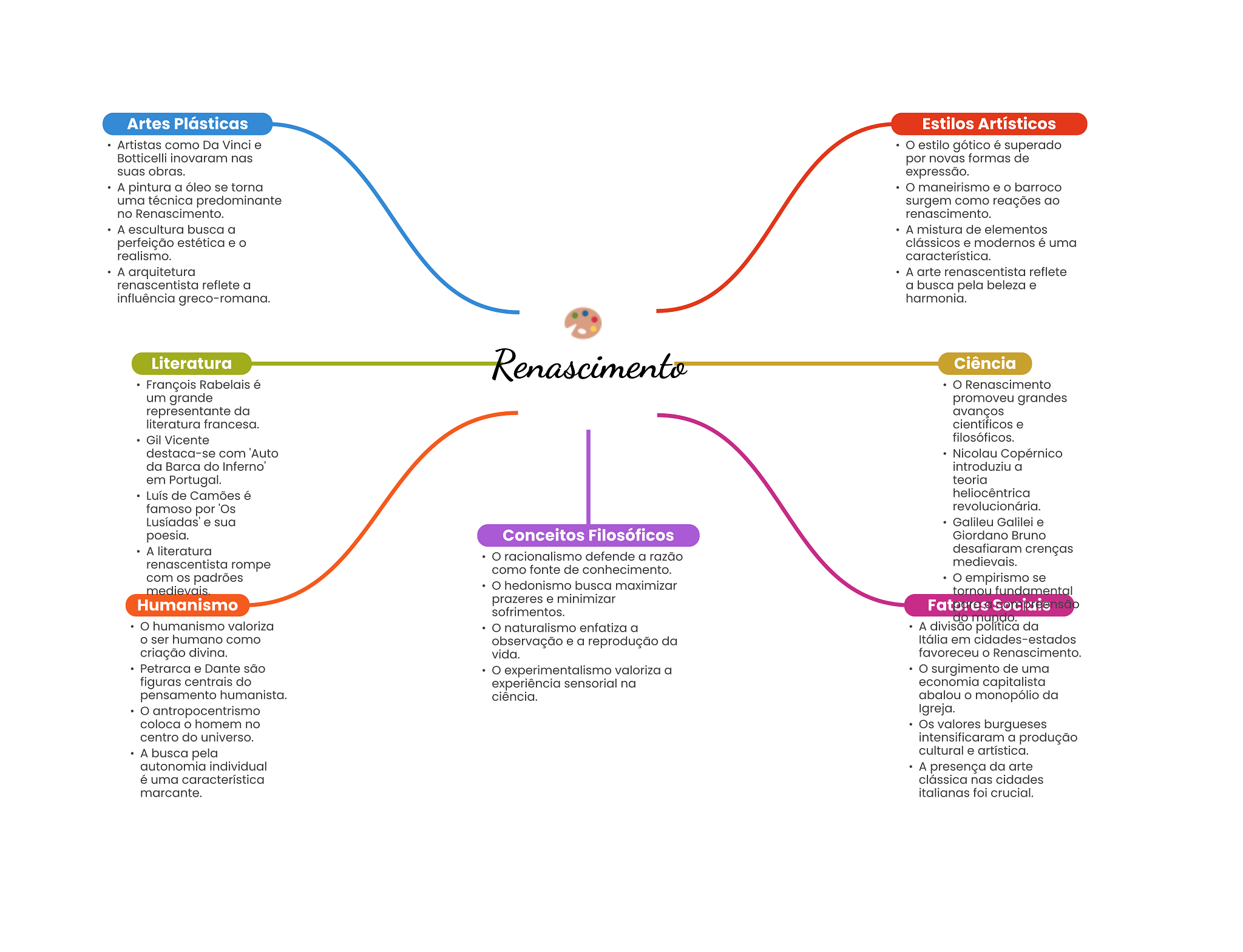 Artes Plásticas Estilos Artísticos Artistas como Da Vinci e O estilo gótico é superado Botticelli inovaram nas por novas formas de suas obras. expressão. A pintura a óleo se torna maneirismo e barroco uma técnica predominante surgem como reações ao no Renascimento. renascimento. A escultura busca a A mistura de elementos perfeição estética e clássicos e modernos é uma realismo. característica. A arquitetura A arte renascentista reflete renascentista reflete a a busca pela beleza e influência greco-romana. harmonia. Literatura Renascimento Ciência François Rabelais é O Renascimento um grande promoveu grandes representante da avanços literatura francesa. científicos e Gil Vicente filosóficos. destaca-se com 'Auto Nicolau Copérnico da Barca do Inferno' introduziu a em Portugal. teoria Luís de Camões é heliocêntrica famoso por 'Os revolucionária. Lusíadas e sua Galileu Galilei e poesia. Conceitos Filosóficos Giordano Bruno A literatura desafiaram crenças racionalismo defende a razão renascentista rompe medievais. como fonte de conhecimento. com padrões empirismo se medievais hedonismo busca maximizar tornou fundamental Humanismo prazeres e minimizar Fatores sofrimentos. do mundo. humanismo valoriza naturalismo enfatiza a A divisão política da ser humano como observação e a reprodução da Itália em cidades-estados criação divina. vida. favoreceu O Renascimento. Petrarca e Dante são experimentalismo valoriza a O surgimento de uma figuras centrais do experiência sensorial na economia capitalista pensamento humanista. ciência. abalou monopólio da antropocentrismo Igreja. coloca homem no Os valores burgueses centro do universo. intensificaram a produção A busca pela cultural e artística. autonomia individual A presença da arte é uma característica clássica nas cidades marcante. italianas foi crucial.